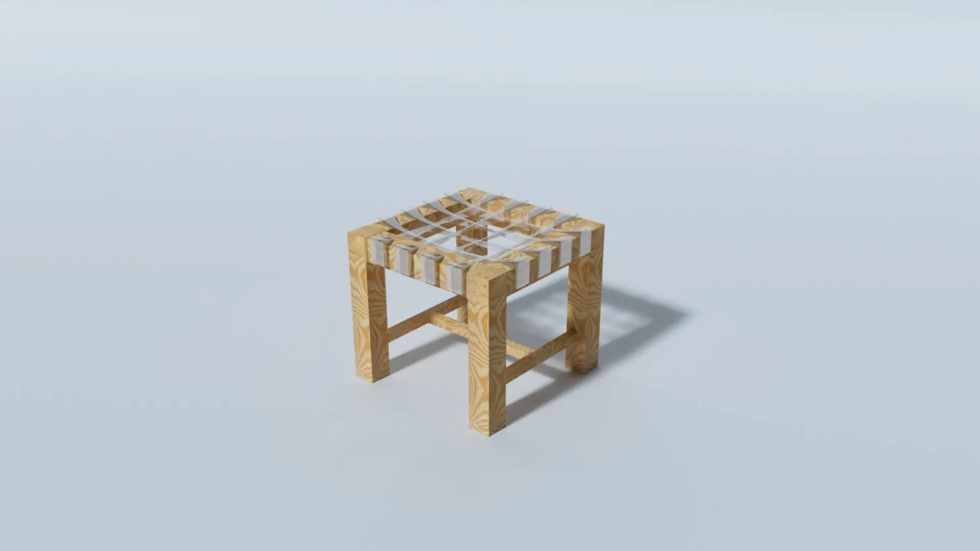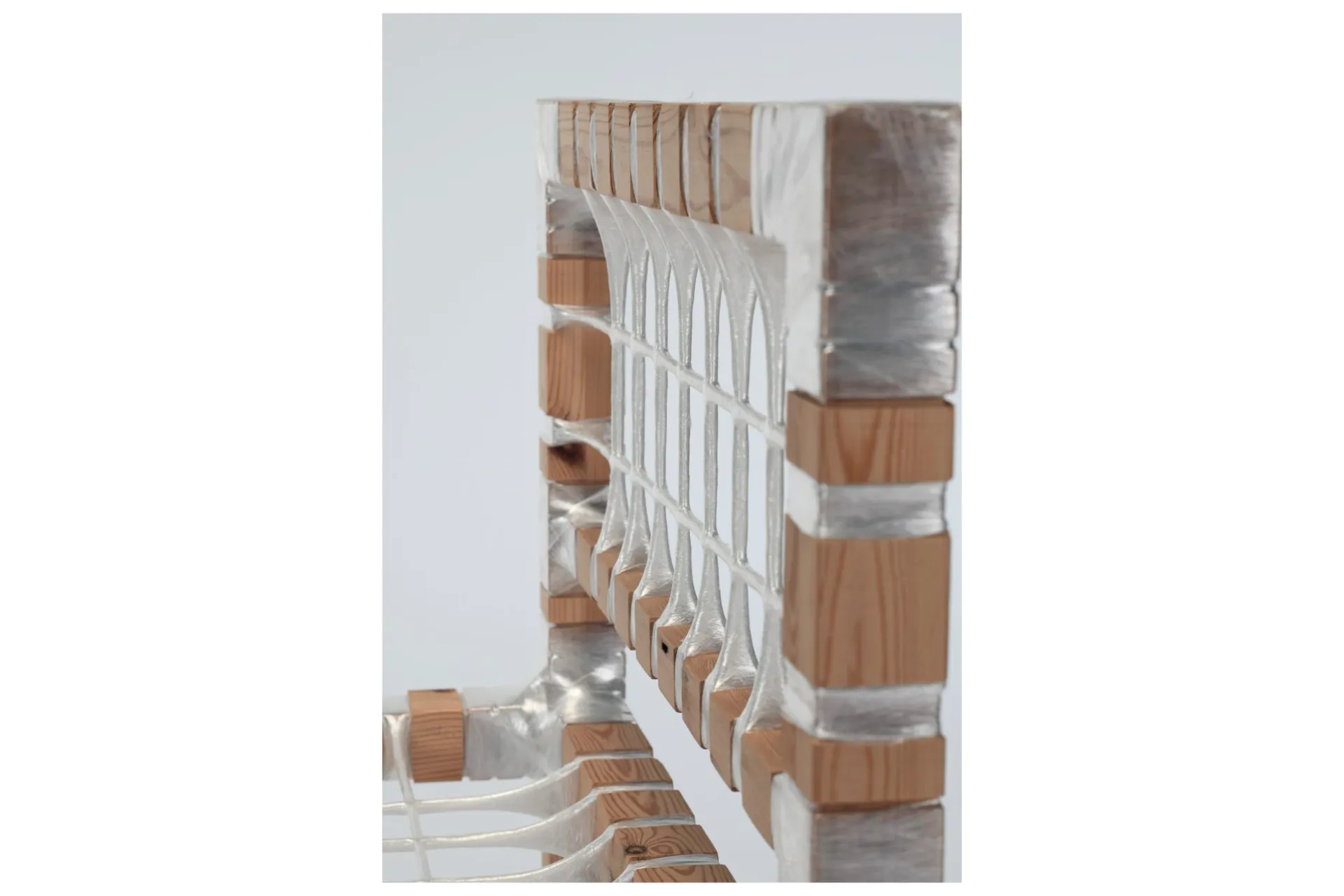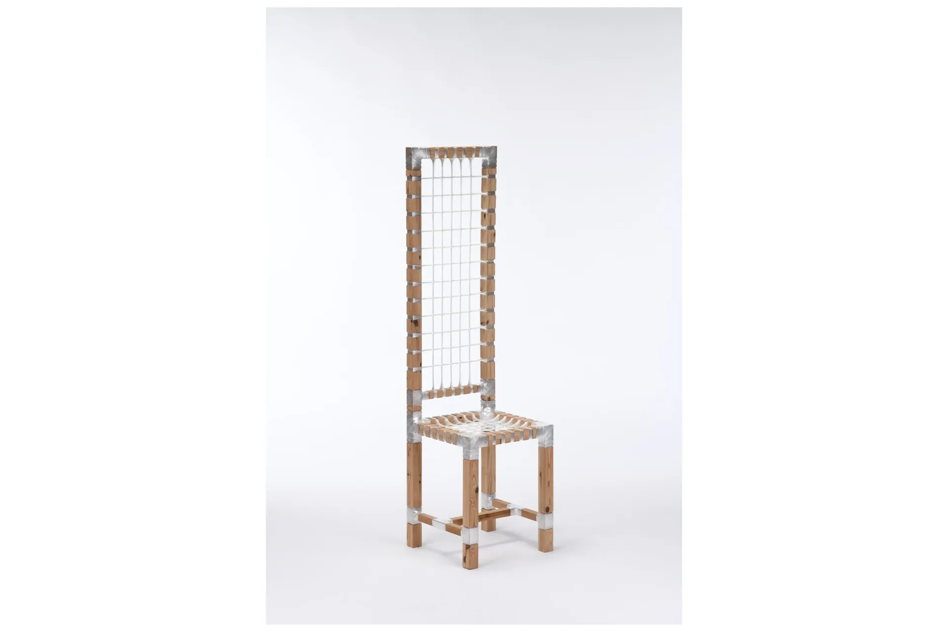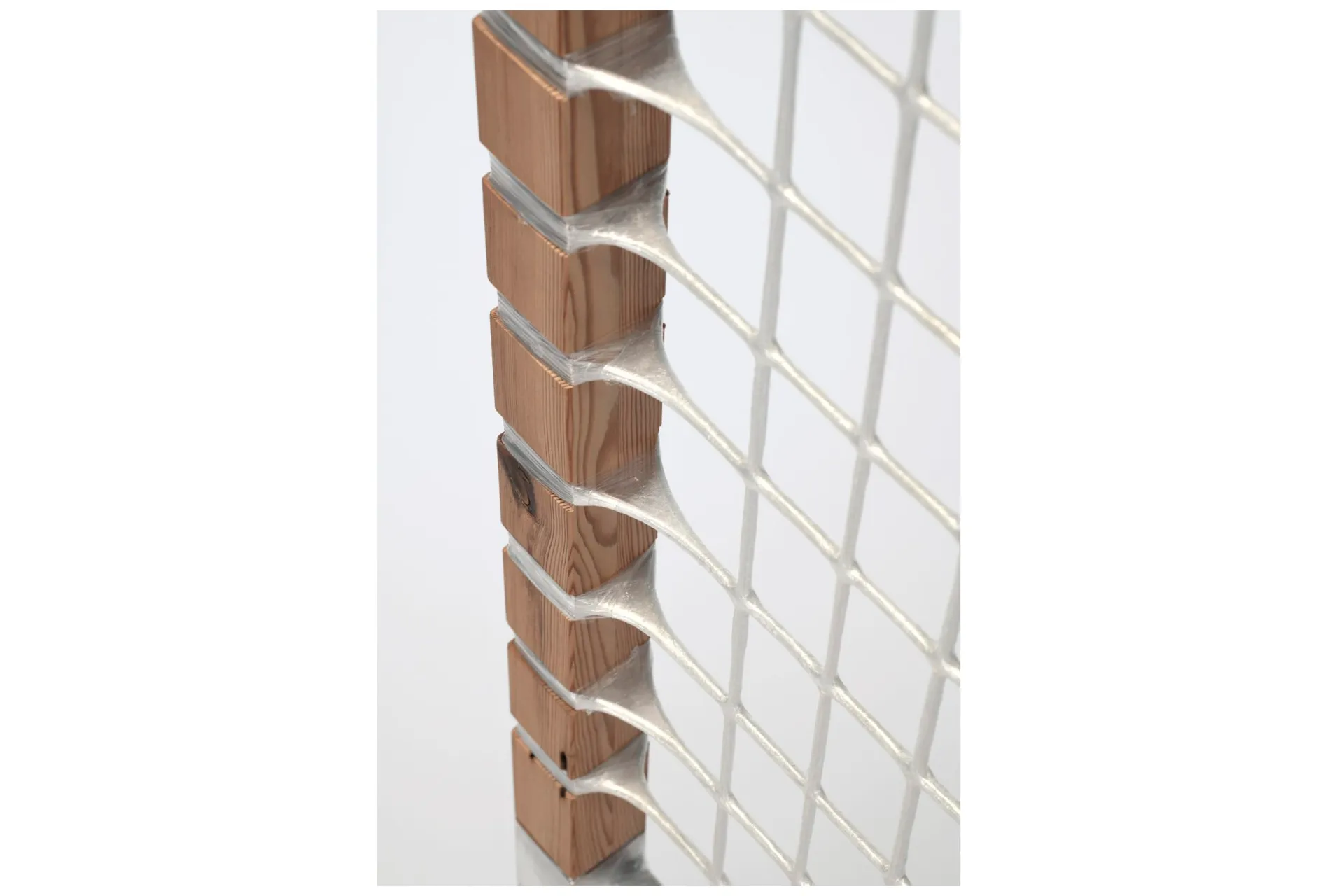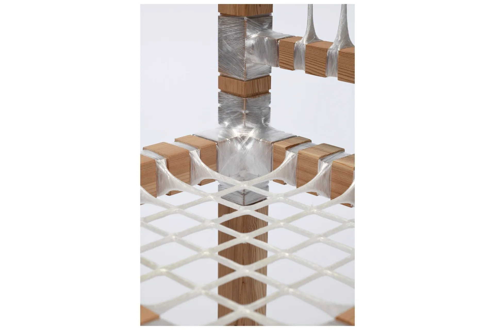 The properties of the high elasticity, adhesion, and translucence make cling film an intriguing material for creating three-dimensional frameworks. The chairs in this collection do not require any adhesive, jointing, or fixings and are only bound together with cling film. The netted webbing across the chairs is also solely cling film.