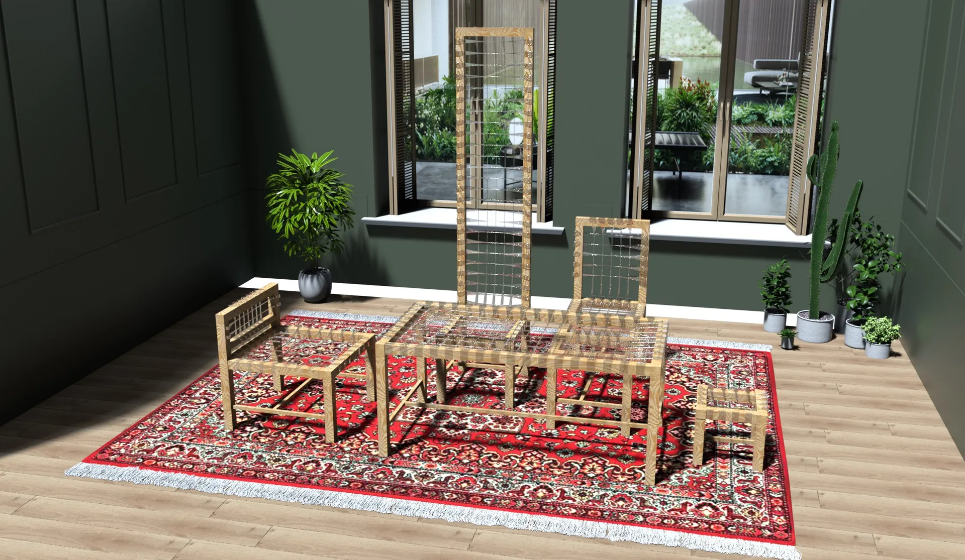 By subtly subverting the utilitarian forms of a chair, the composition of the chairs around a dining table creates an imaginary context for a person to inhabit and creates a set of choices for an individual seeking to position themselves at the table.