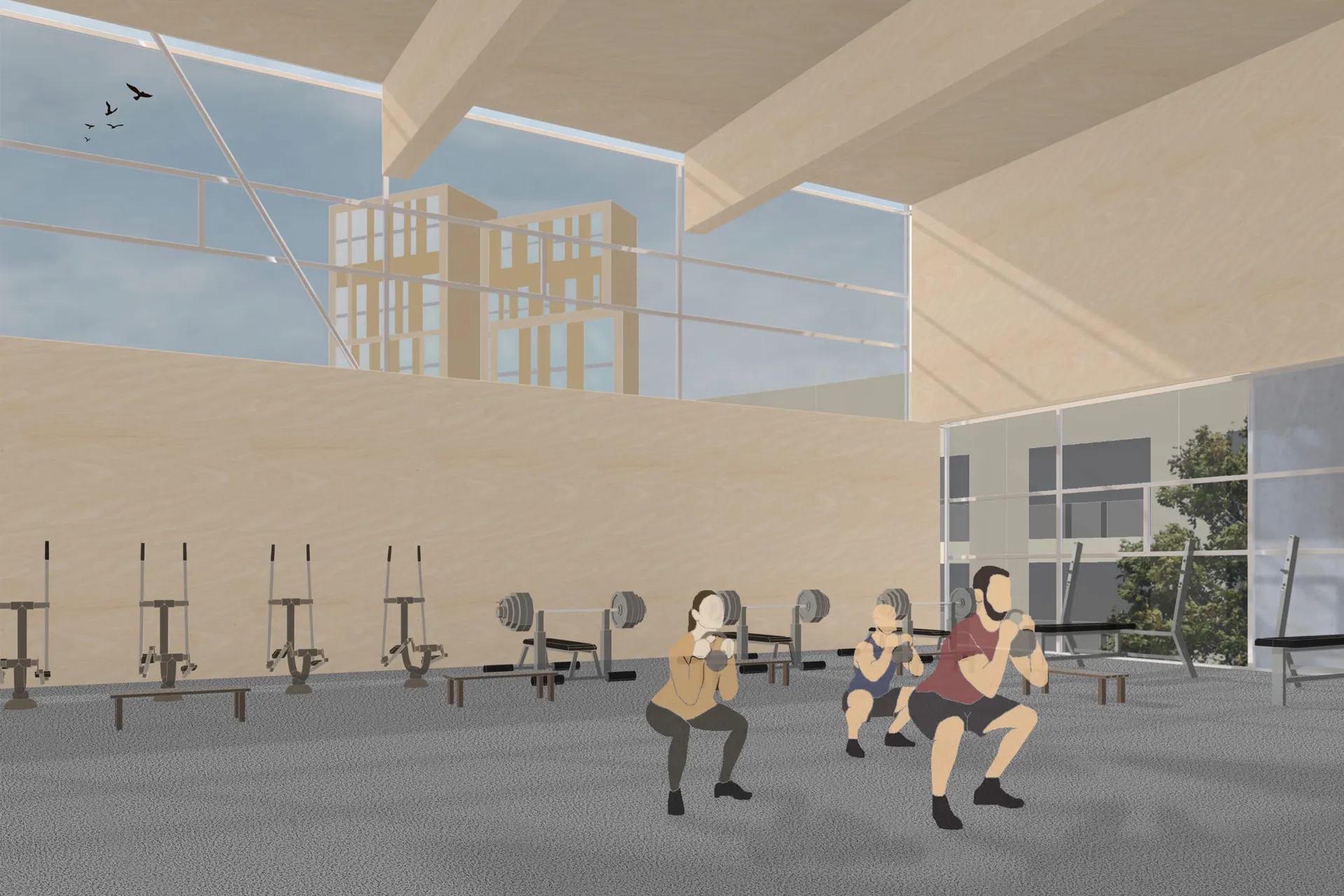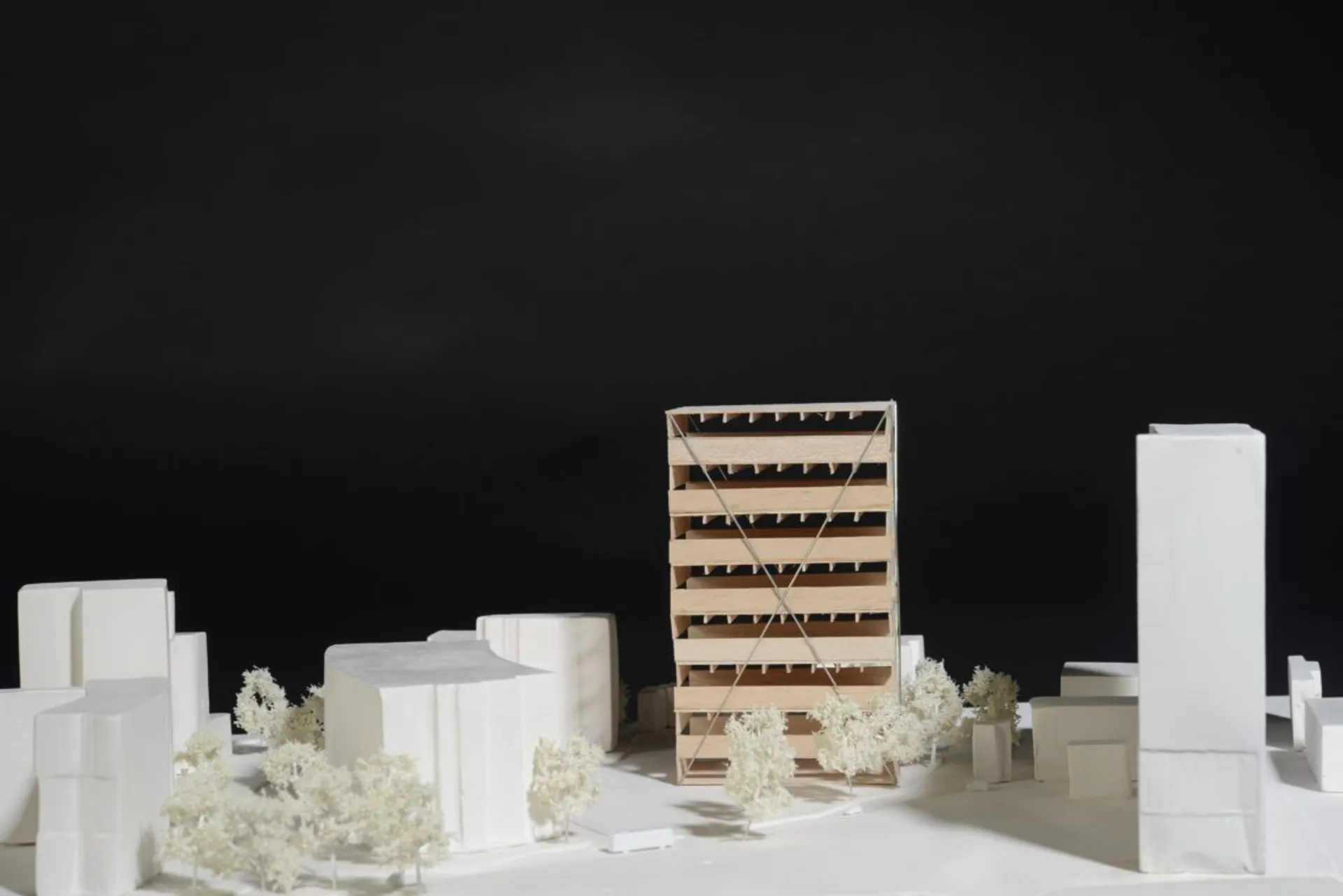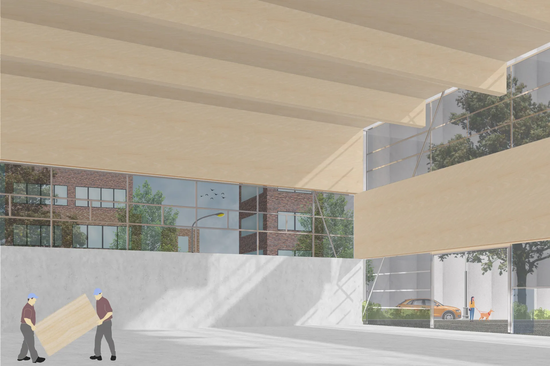 My proposal for the Palace for the People of Croydon is a contemporary community space with a generous, open plan form to accommodate various uses. It is a seven-floor building assembled by stacking very deep cross-laminated timber beams which span the entire length of the building from corner to corner. The stacked CLT system creates bold corners and gives the building a clear tectonic expression, a strong sense of rhythm and a sense of balance.