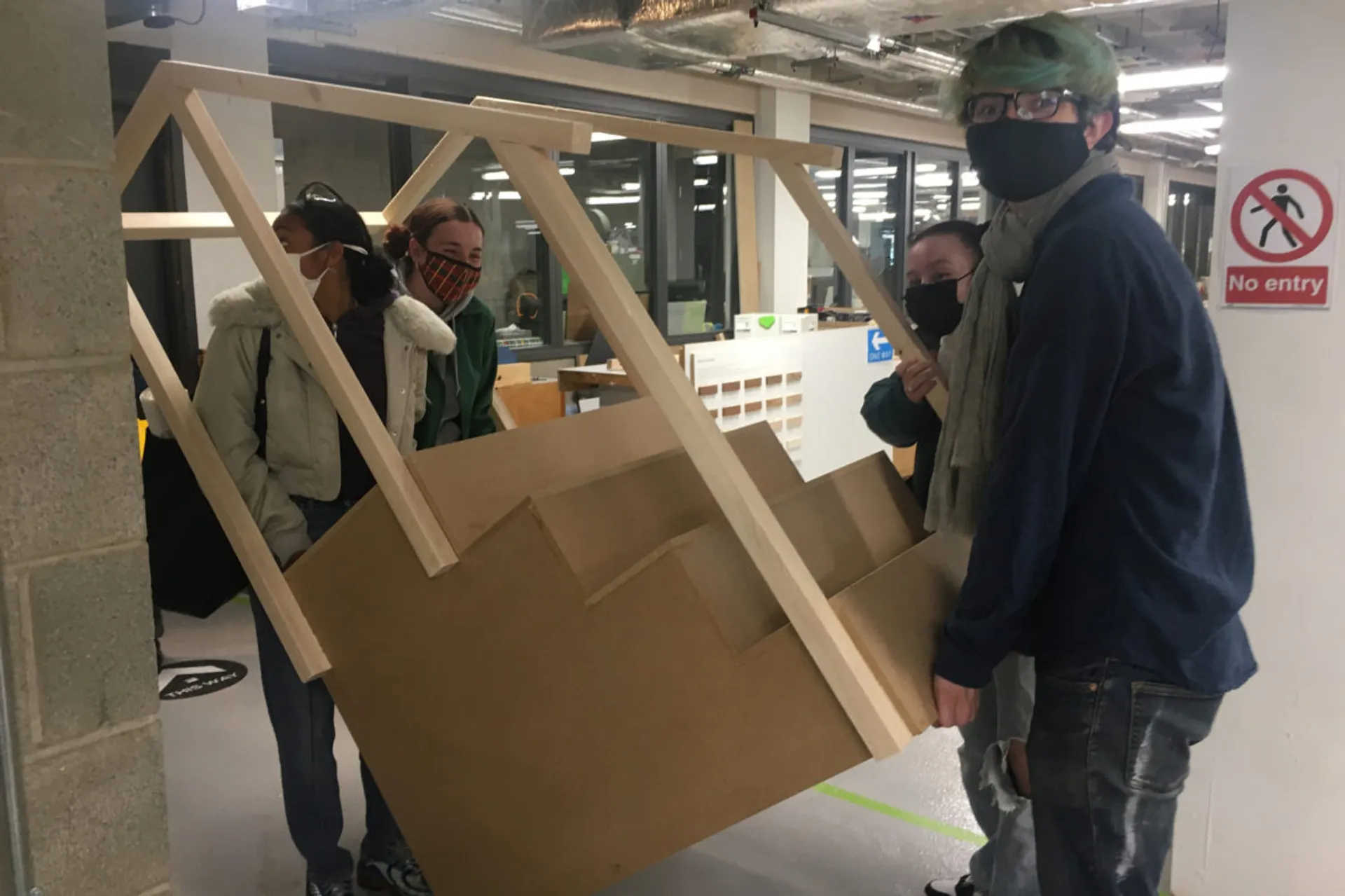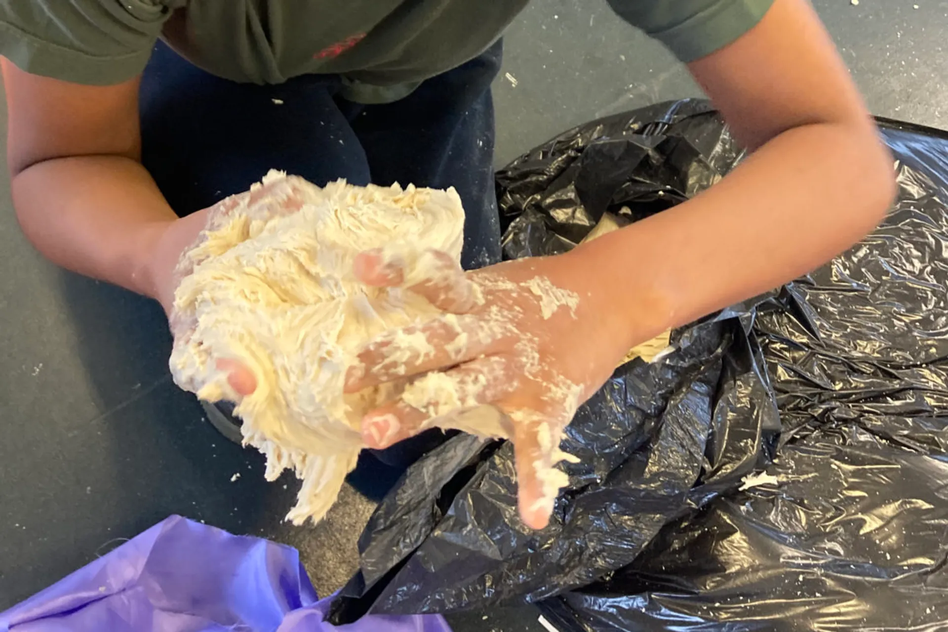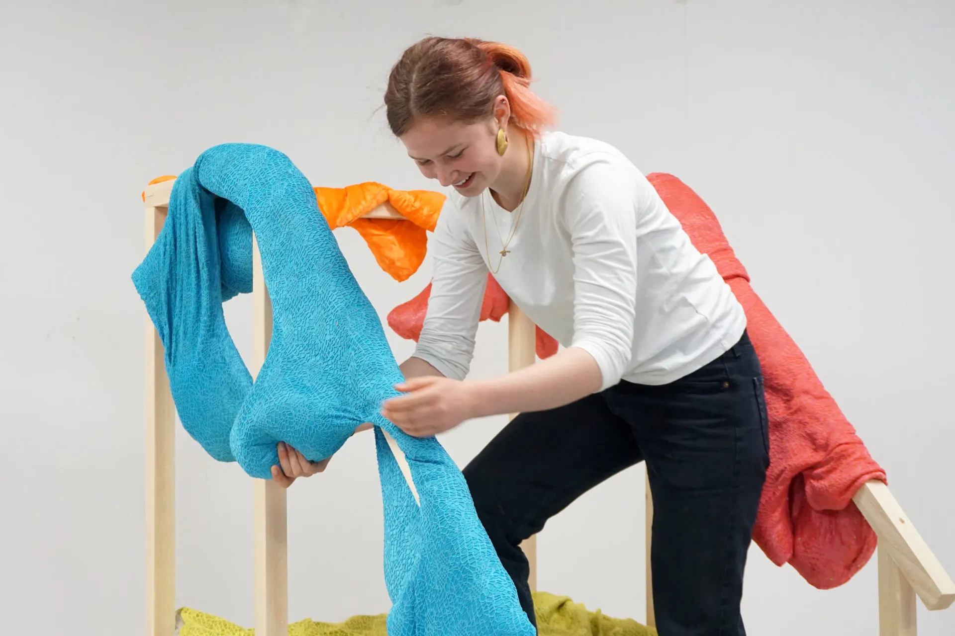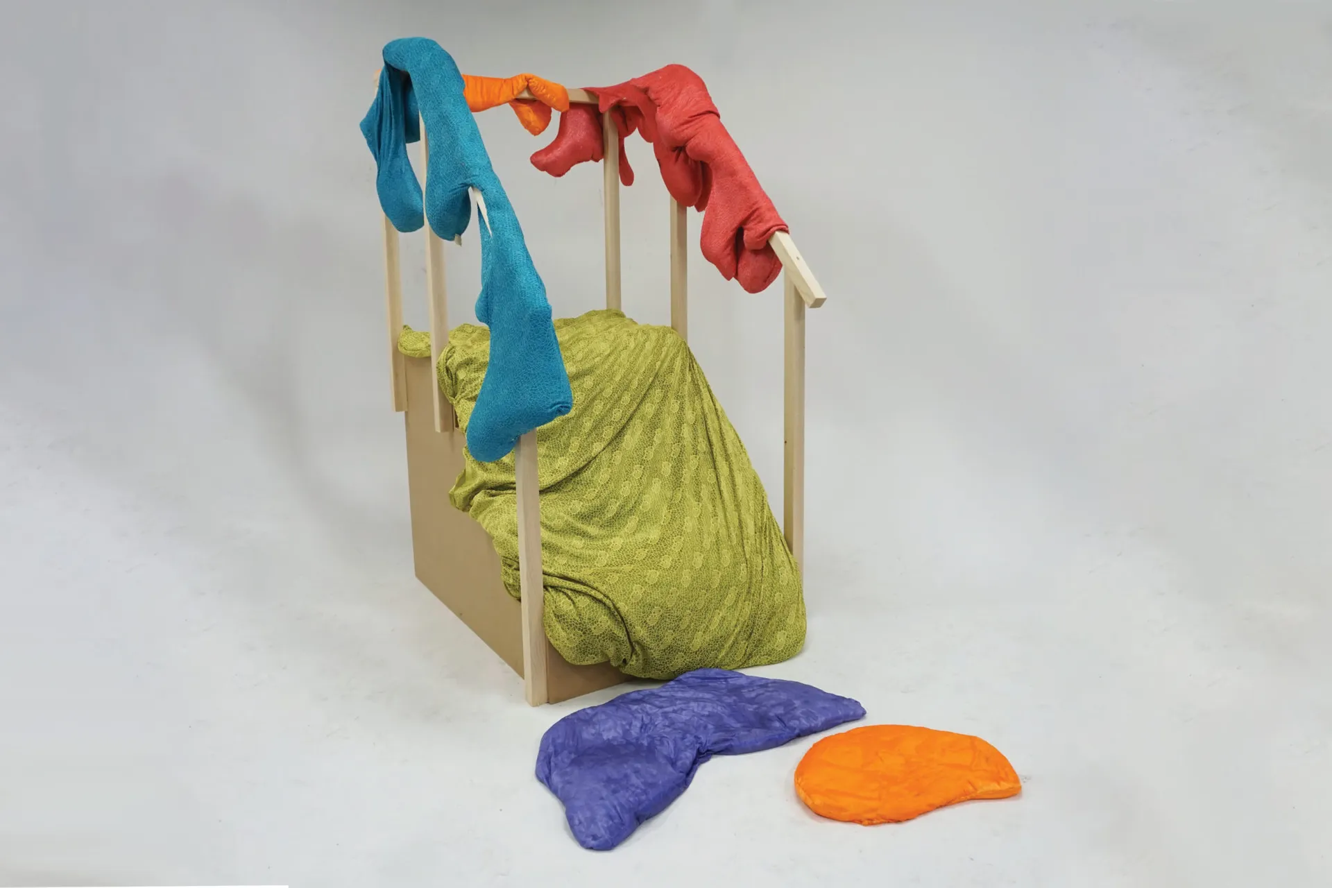 ‘Engage’ is a collection of brightly coloured sculptures made from textured fabric filled with bread dough. As an installation, they draped over bannisters, taking the form of a staircase and flooring. Their physical presence filled the space, confronting and ‘forcing’ the audience to engage with the sculptures using their senses and body impressions.
