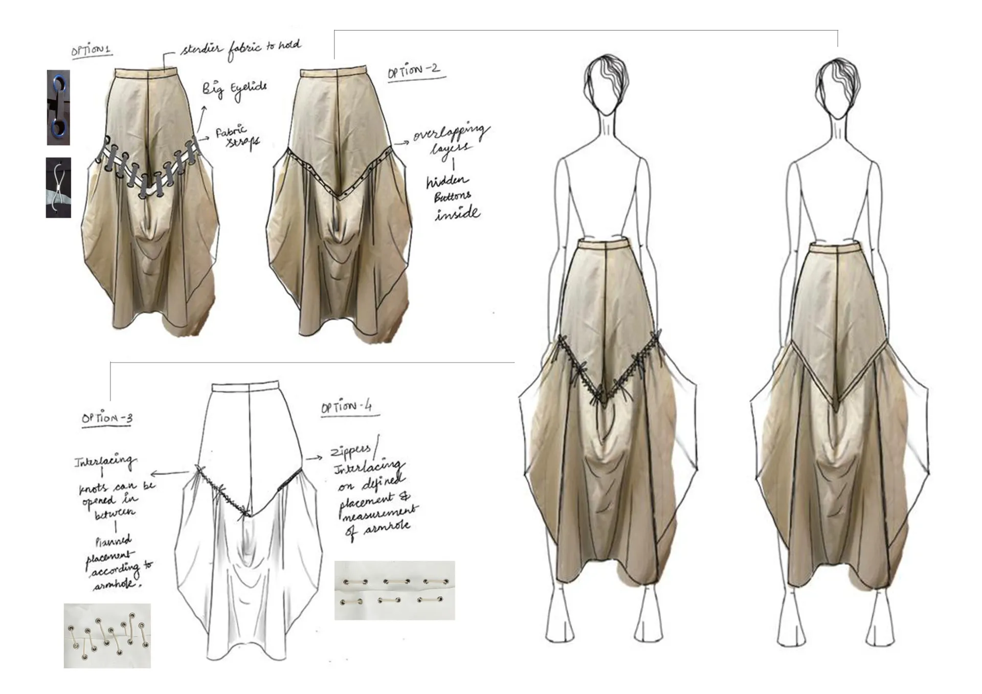I am constantly expanding my skills in Adobe software like Photoshop, Indesign and Illustrator along with Sketchbook and Procreate. My strengths lie in experimenting with digital media, collages and technical CADs as well as research, context building, silhouette and technical construction of garments, especially using transformable design strategies. Additionally, exploring and amalgamating materials to develop surfaces is another interest that I have discovered hands-on through my journey.