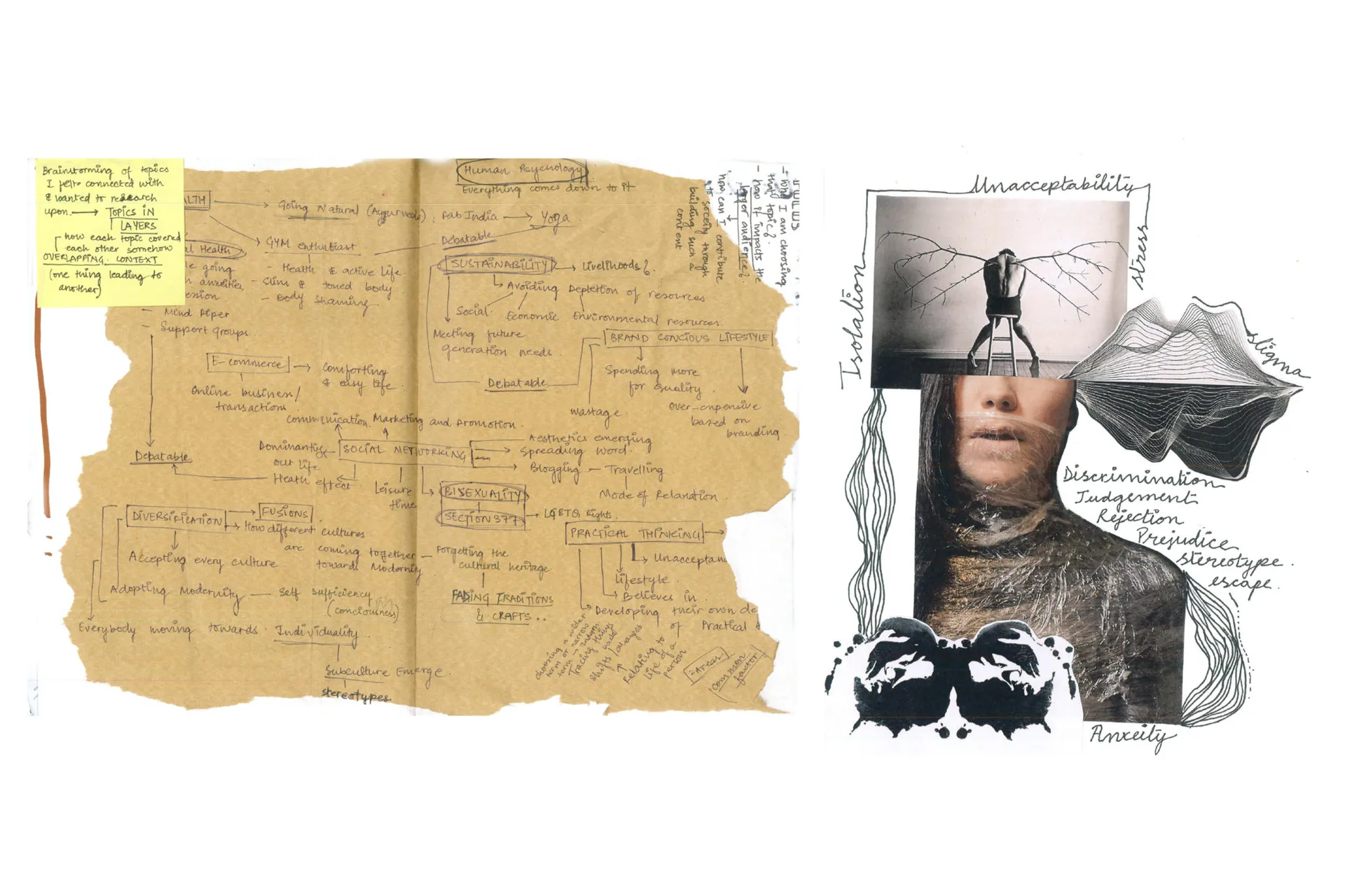 Being a critical thinker, I am constantly introspecting and contemplating ‘spaces’ around me, letting my subconscious direct my design process. It fascinates me to discover how everyone has a different perception of viewing something from their own ‘mind space’. Thus, my inspiration for various projects usually arises from human spaces, identities, feelings, thoughts and perceptions, and viewing it unusually. I visually interpret my concepts through collages which reflect subdued moods and colour tones. I largely emphasise and explore silhouettes, materiality, functionality and intricate details. My design language lies in clean, crisp and a touch of avant-garde expression.