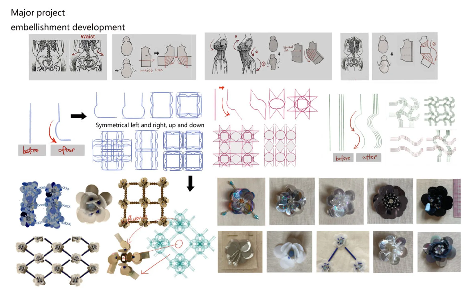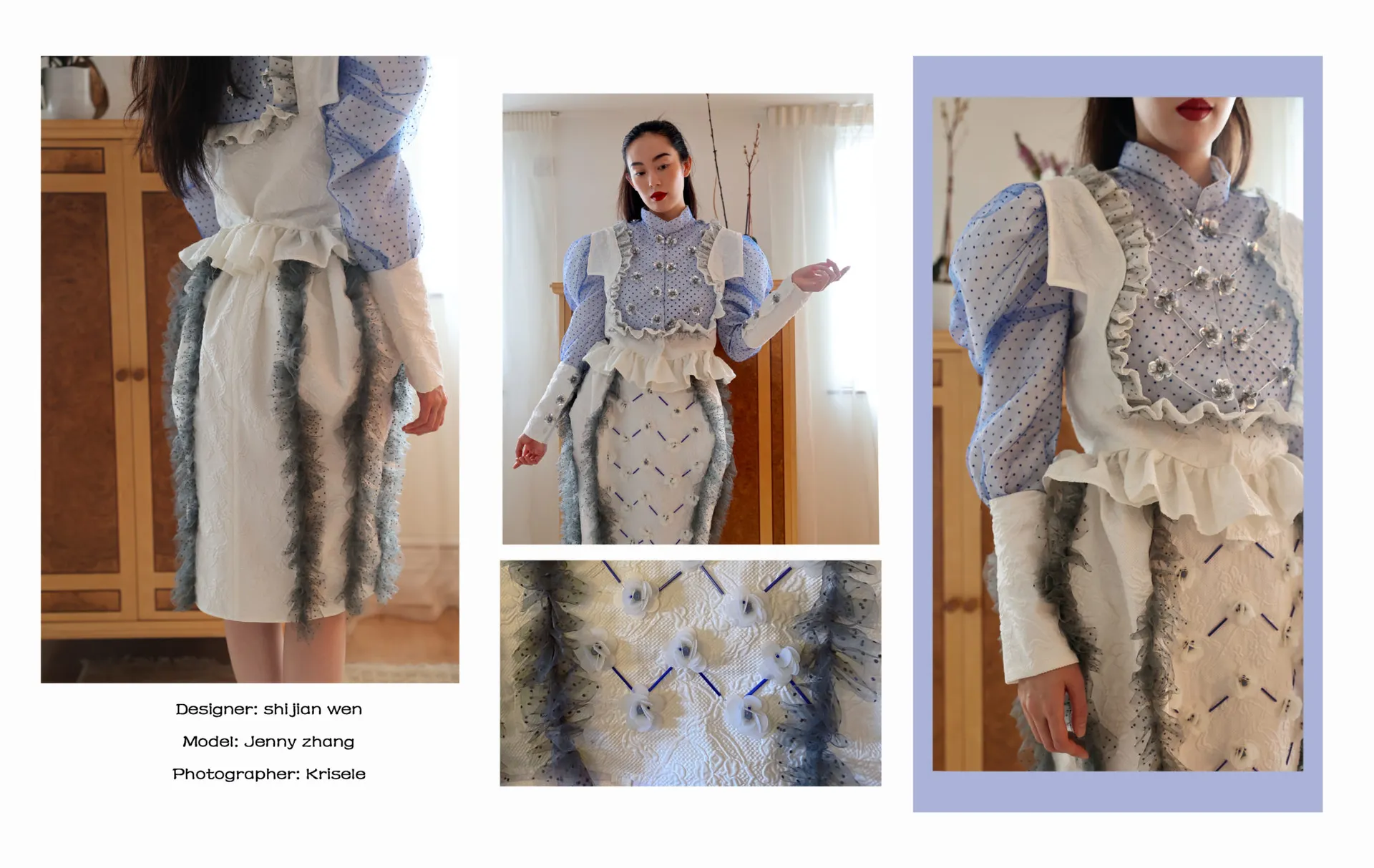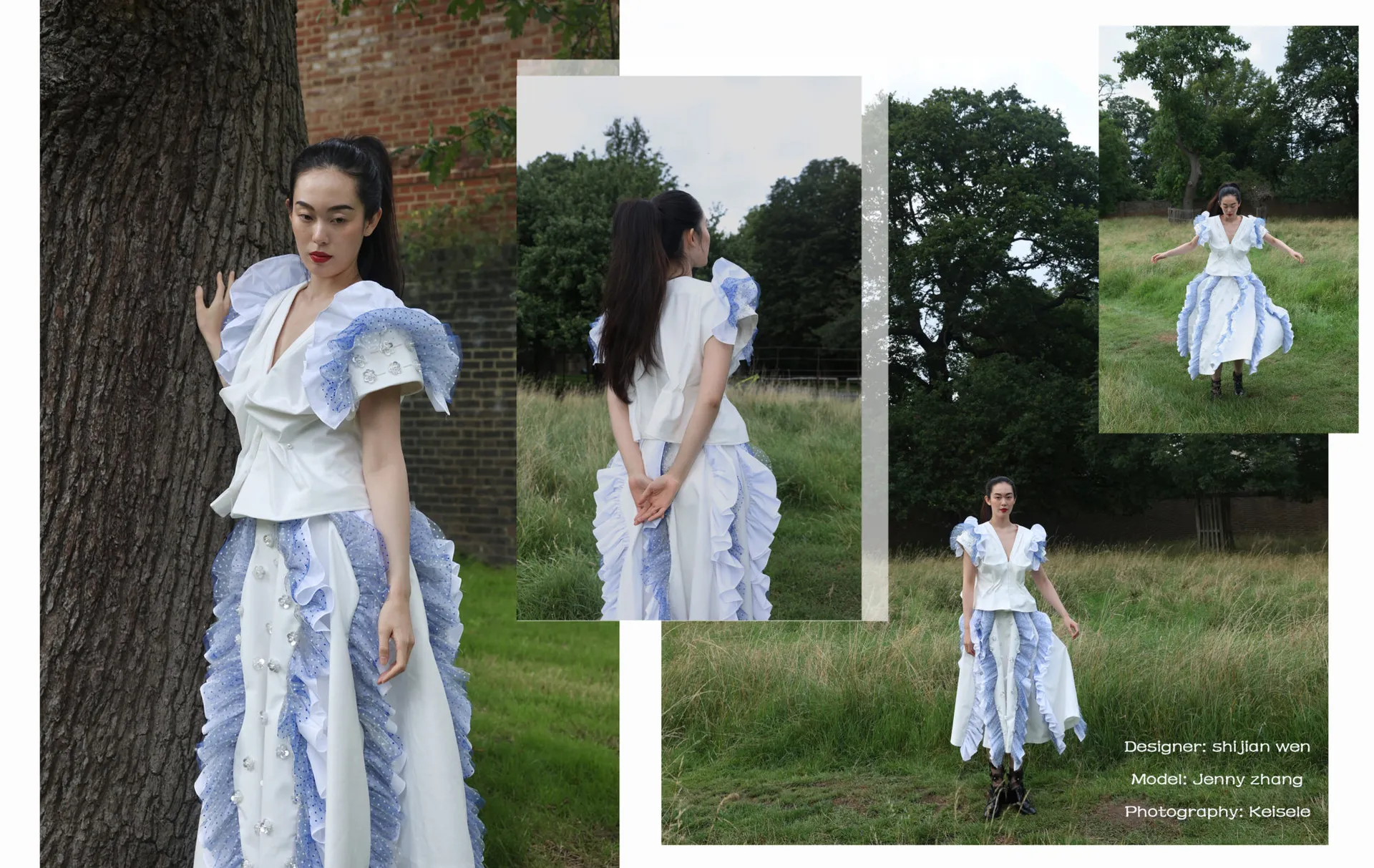 How to reflect on and break the bondage of women in the 18th-century European clothing structure through clothing design? is the starting point of my project, which is based on my interest in the western clothing culture of the 18th century. The 18th-century European clothing is always full of palace style. Romantic lace, corset, and rococo clothing with feminine touch fascinated me a lot, so, I started my research. “Chinese trade” has increased since the opening of the Eastern route in the 16th century. Chinese porcelain, silk, furniture, and other artworks have been imported in large quantities into Europe, causing a Chinese fever to sweep the entire society in Europe. “Chinoiserie” became a popular and widely utilised style. Chinoiserie is the European interpretation and imitation of Chinese and other East Asian artistic traditions, particularly in the decorative arts, garden design, architecture, literature, theatre, and music . This trend first appeared in the 17th century but became more popular in the 18th century as trade with China and the rest of East Asia increased . Chinoiserie is a style that is similar to Rococo. Both styles are characterised by exuberant decoration, asymmetry, a focus on materials, and stylised nature and subject matter that emphasises leisure and pleasure. Hence, my research started in the field of clothing but also derived from ceramics, furniture, architecture, etc.