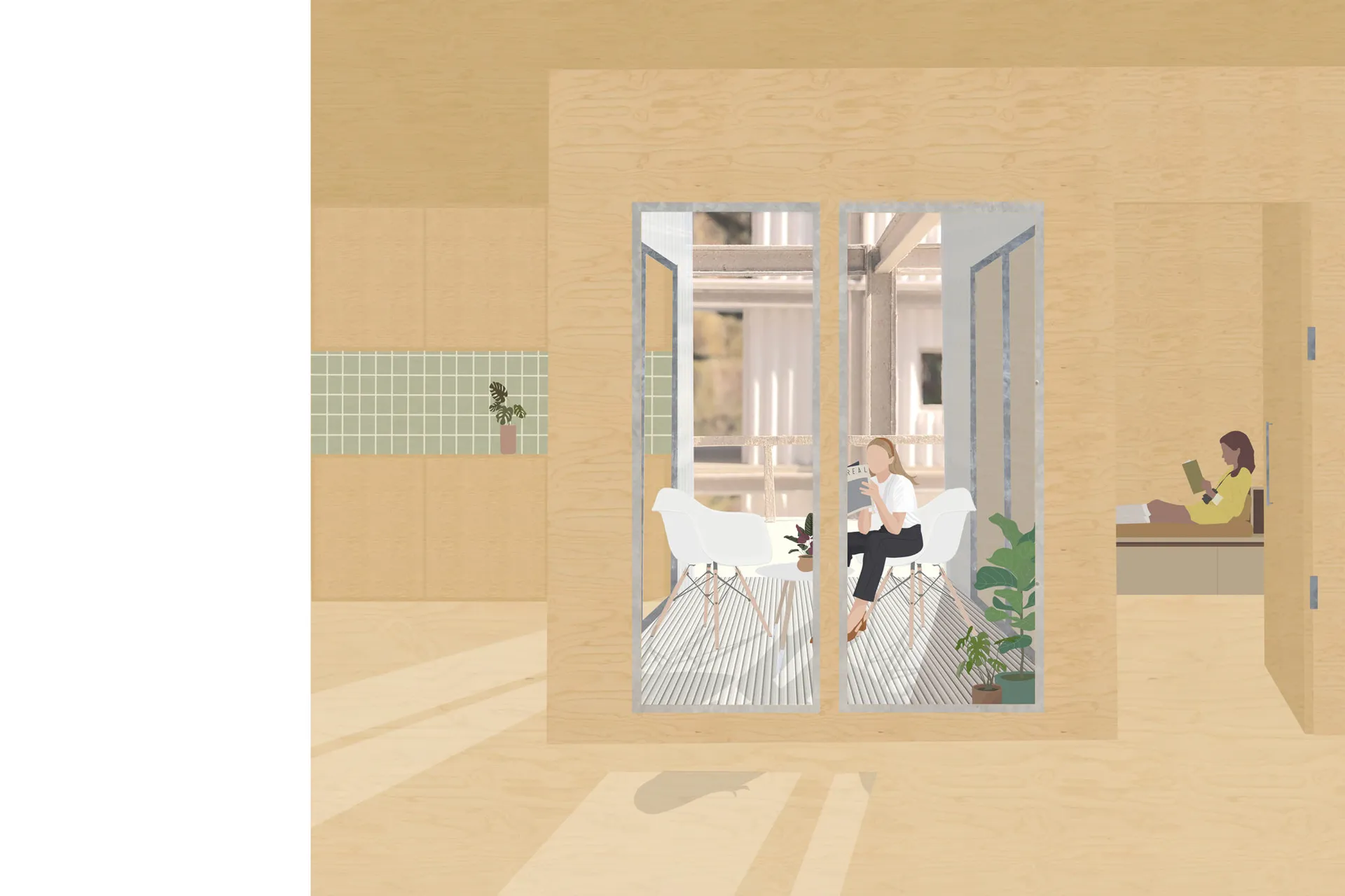 This Thesis Proposal holds 52 self-contained apartments that each host their own inset garden centralised around a shared communal courtyard that holds public allotments. The blocks can be constructed, adapted and dismantled by the residents themselves. Communal ownership is encouraged by shared walkways and communal decks where residents can bring out their personal dining furniture to sit and share.