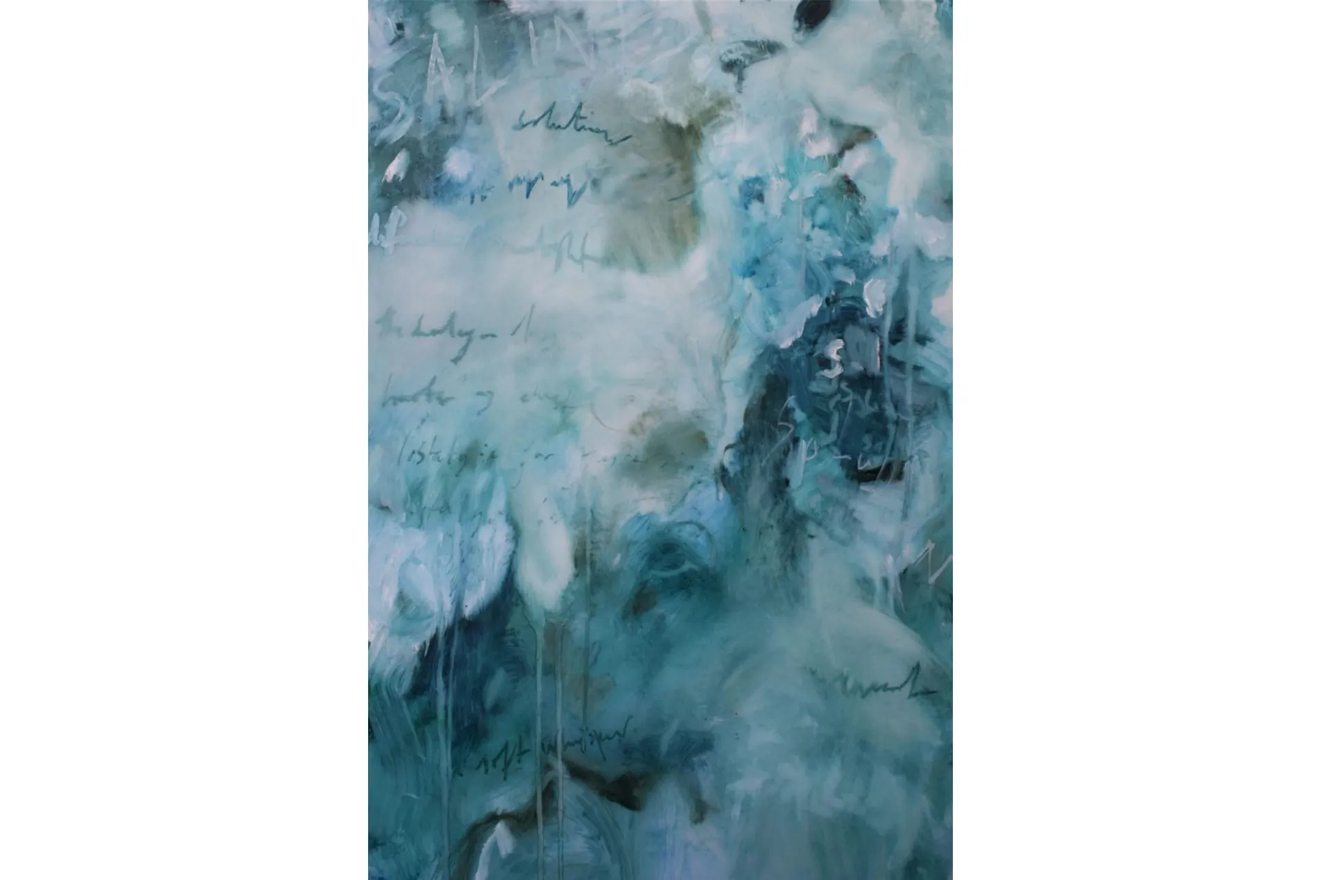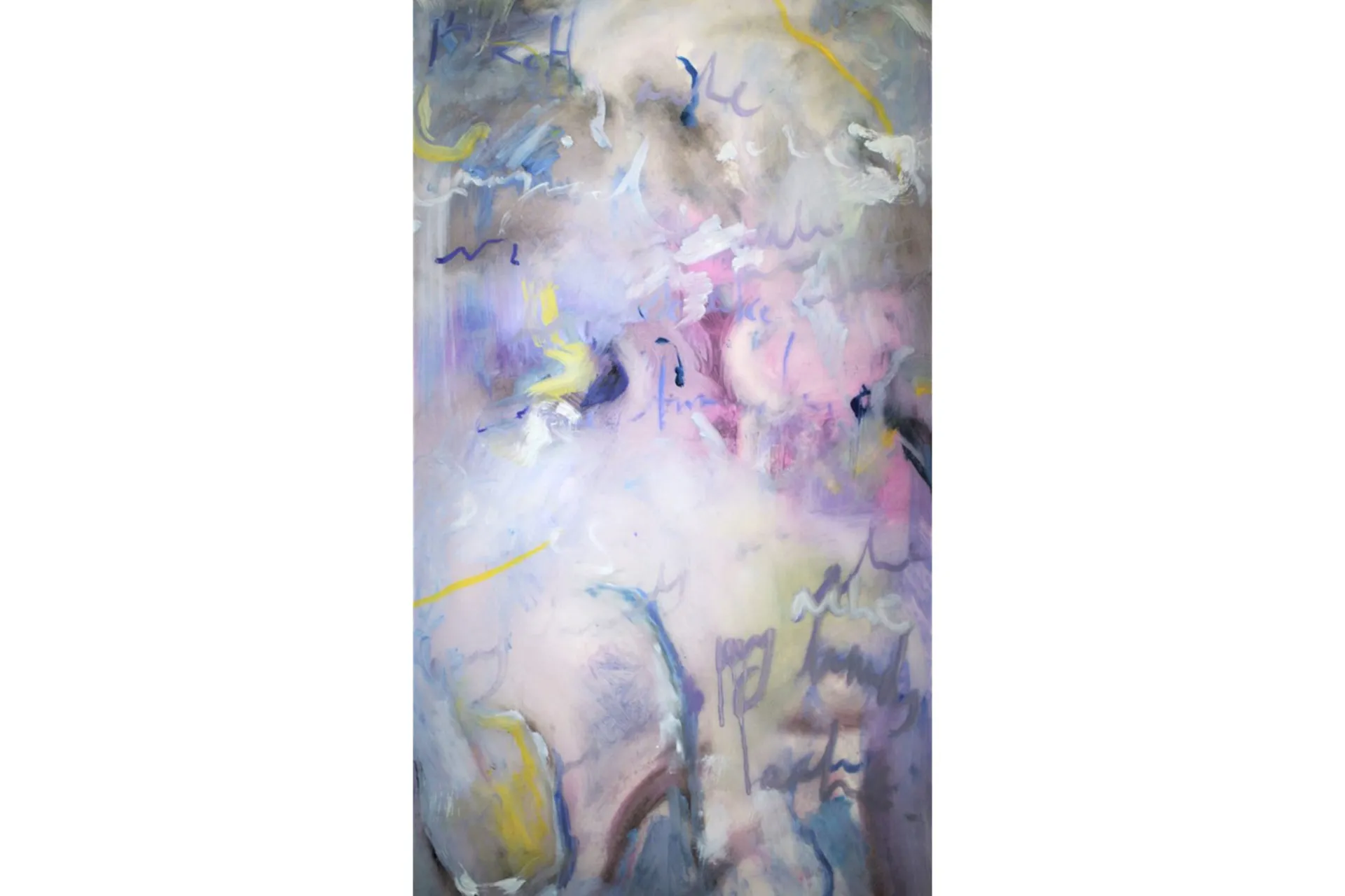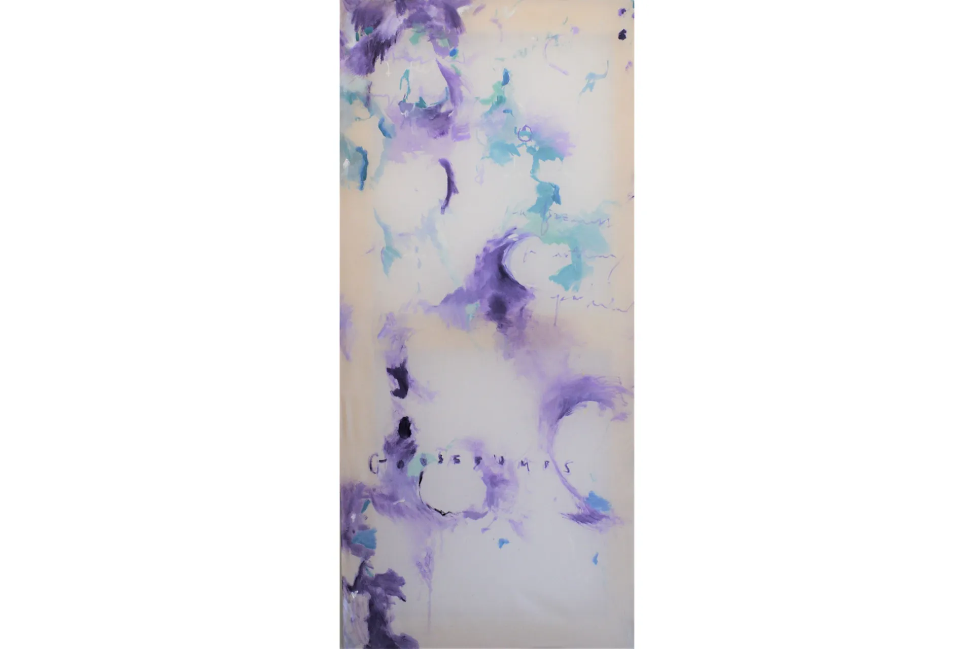 This selection of work is created using oil paint upon unorthodox materials, including tracing paper and translucent chiffon fabric. The delicate, see-through nature of these substrates is reflective of the transient and the transcendental; descriptors which reflect my experience of life itself. The juxtaposition between the fragility of the translucent chiffon fabric seen in the cold breeze of the evening, and the acidity of my tears these days, against the concrete stability of the frames, queries the idea of the ‘art object’. With frames conventionally being utilised to stretch opaque canvas to conceal the material qualities of the restraints, exposing the constraints as a visual component enables exploration into phenomenological concerns of the frame. The gestural mark making, alongside the at times illegibly scrawled text, all relate back to the artists hand. Painting is viewed as drawing in this sense; the process involves a searching for and carving out of the image, through swathes of paint which act as mist. These ‘searching marks’ are evidence of attempts at capturing a suggestion of something, rather than settling on a ‘completed image’, and work is ceased at a purposefully ‘unfinished’ moment, distilling this process in its working stages. Within the realm of the abstract, with each new painting undertaken, there is an attempt to add less, to push how little can still be read as an image. Poetry plays an integral role in my practice, blurring the boundaries between these disciplines directly, phenomenologically and in painterly terms. I posit importance onto written text as being not only an image making tool within its storytelling abilities, but also physically, being a visual entity in and of itself. This intentional confuddling is furthered in the use of written word, at once adding meaning through words here and there that stand out, providing clues but leaving the true meaning ever elusive.