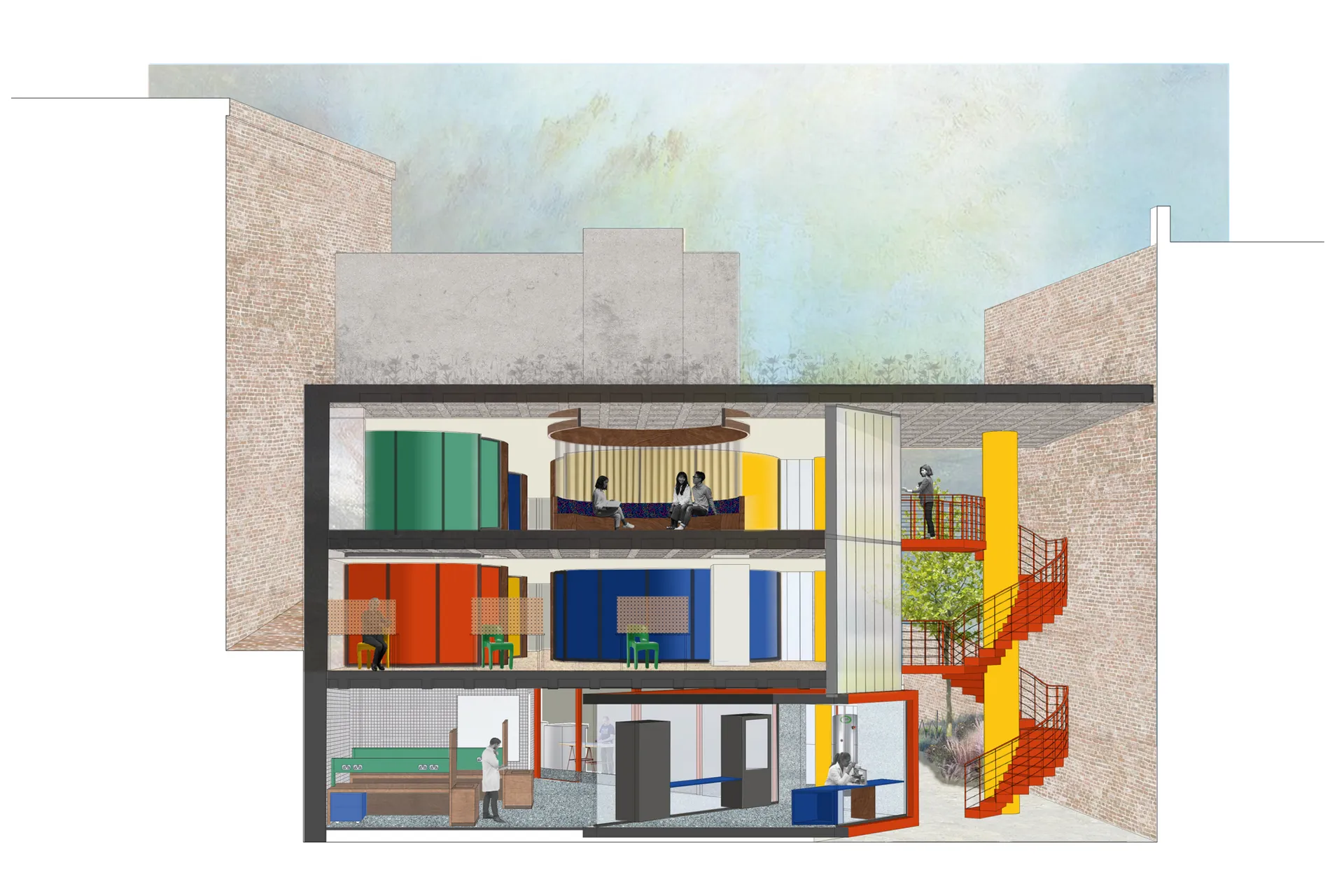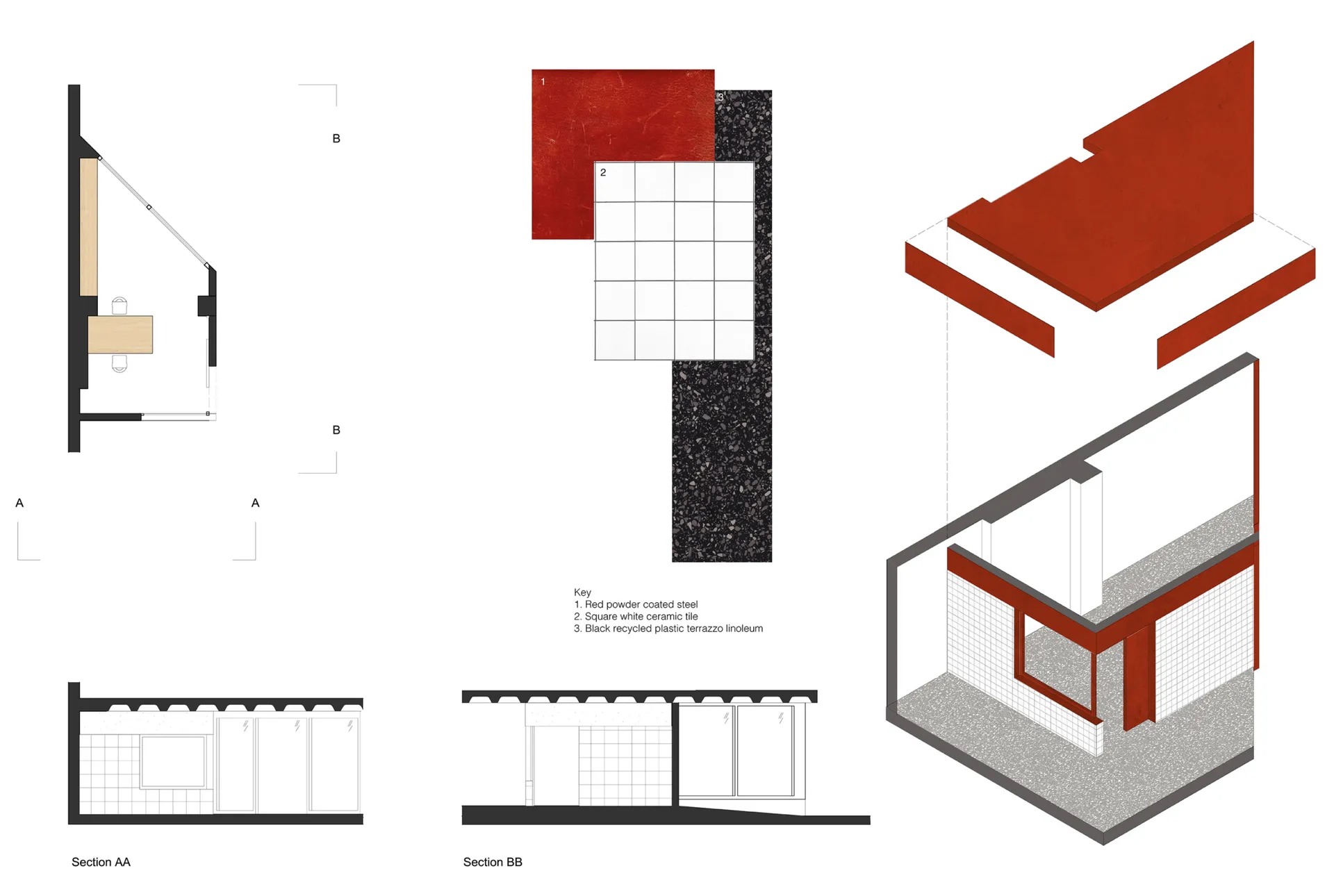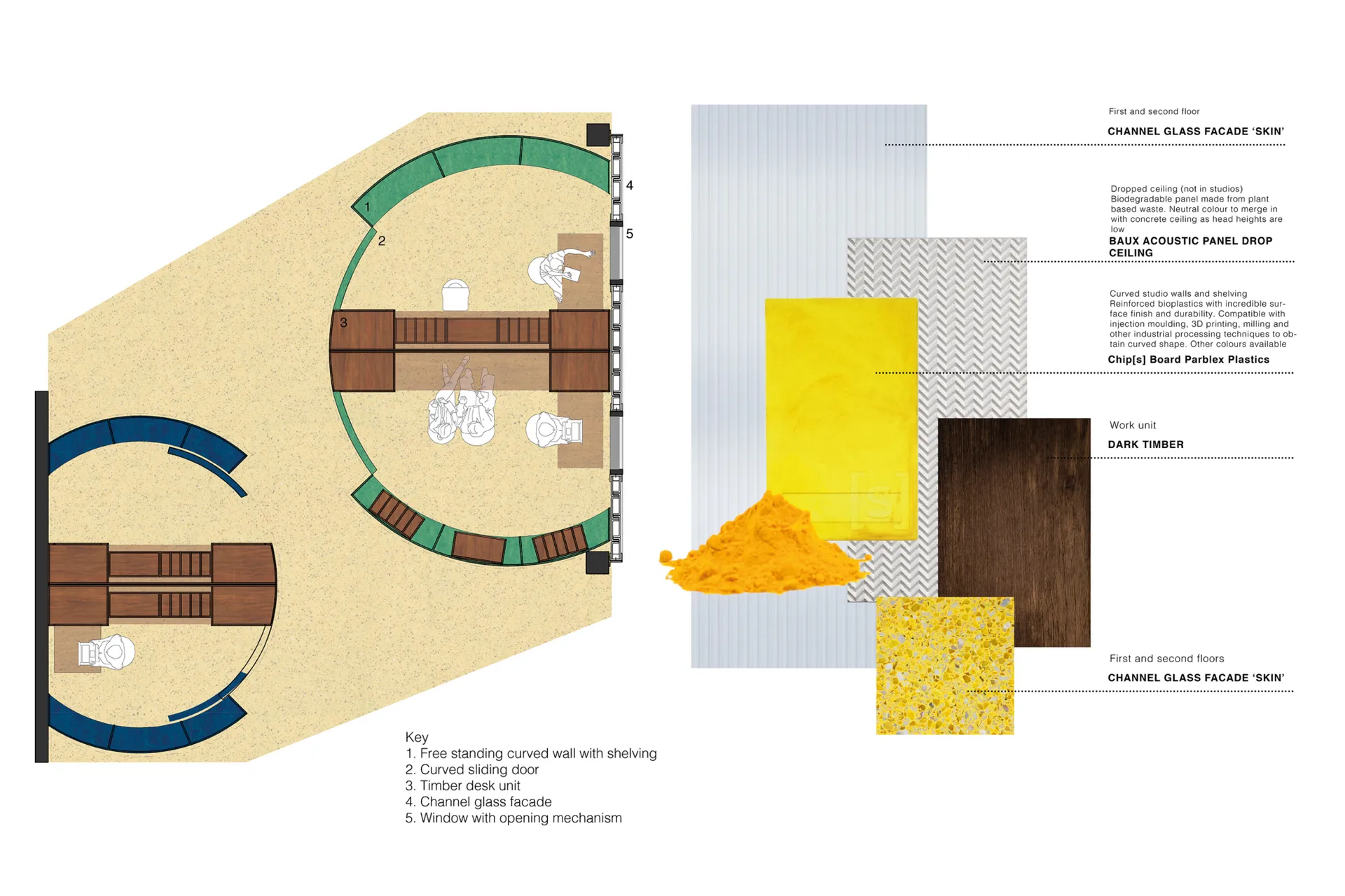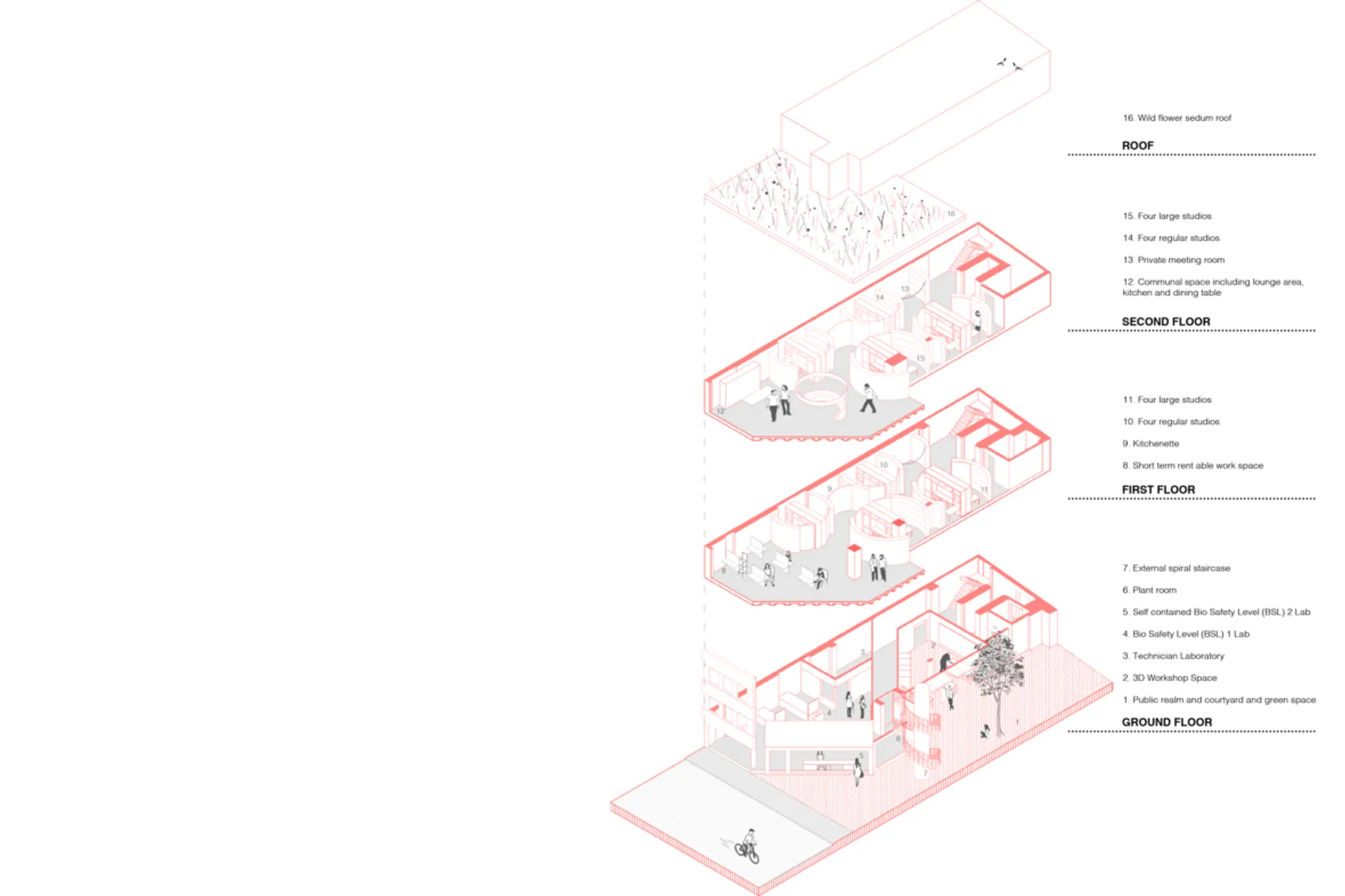 The proposal is for a disused retail space on Fife Road in Kingston Upon Thames to encourage research into sustainable material generation. Architectural interventions tackle existing problems with the deep dark plan allowing little natural light or air into the building. The steel floor plate and curved steel roof have been removed to create a courtyard at the back of the building, a 45 degree cut has been taken through to the front of the building. This creates a new partly covered triple height public walkway to the rear of the building leading to a new entry sequence.