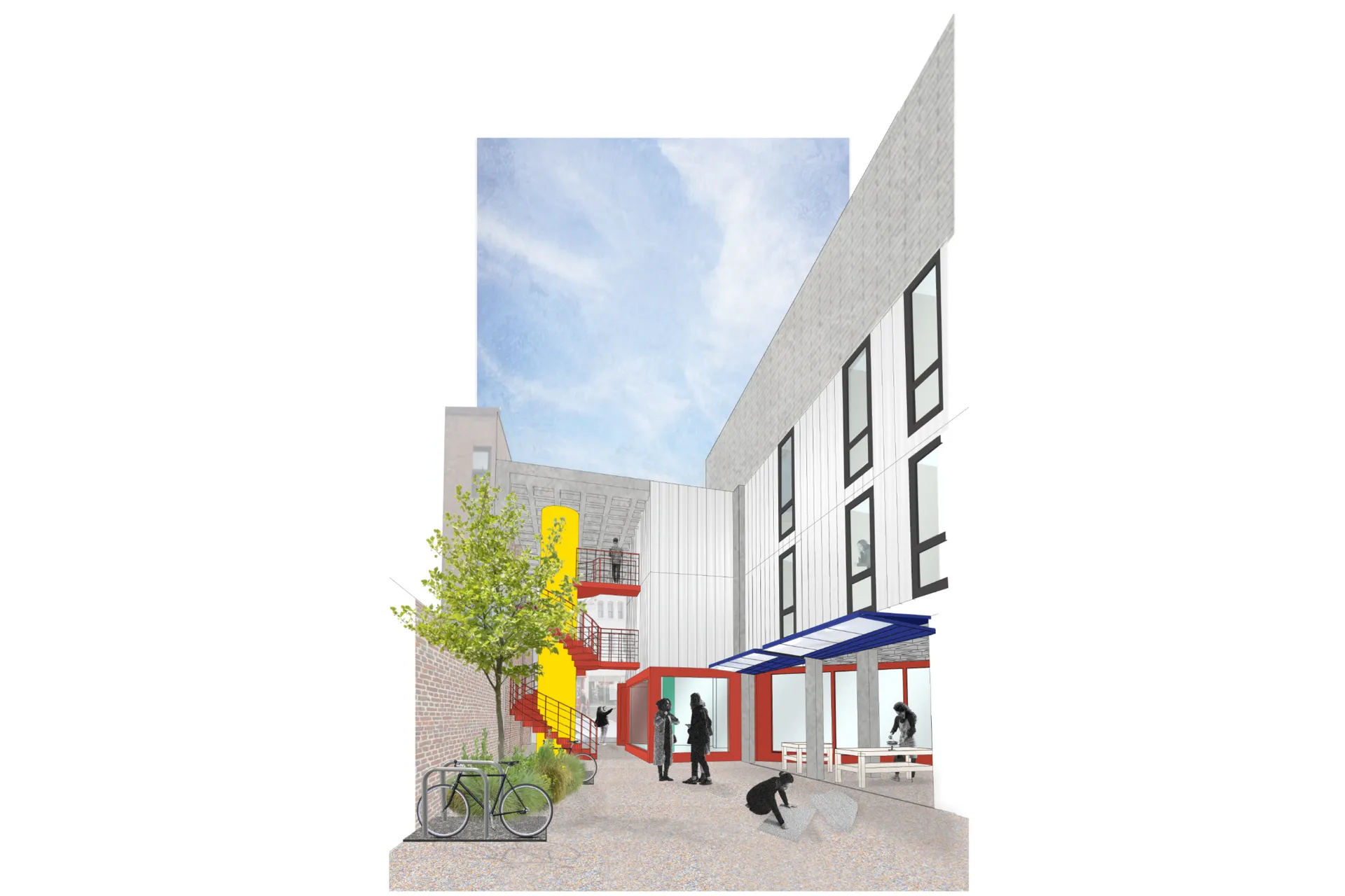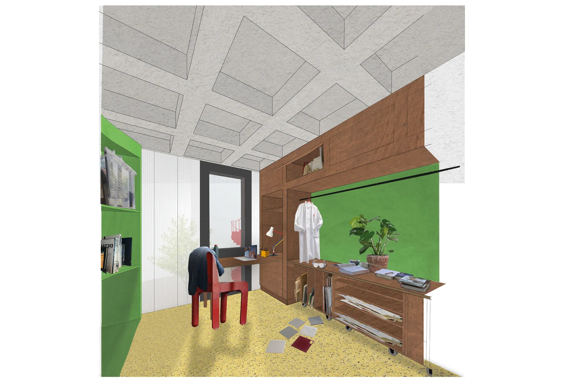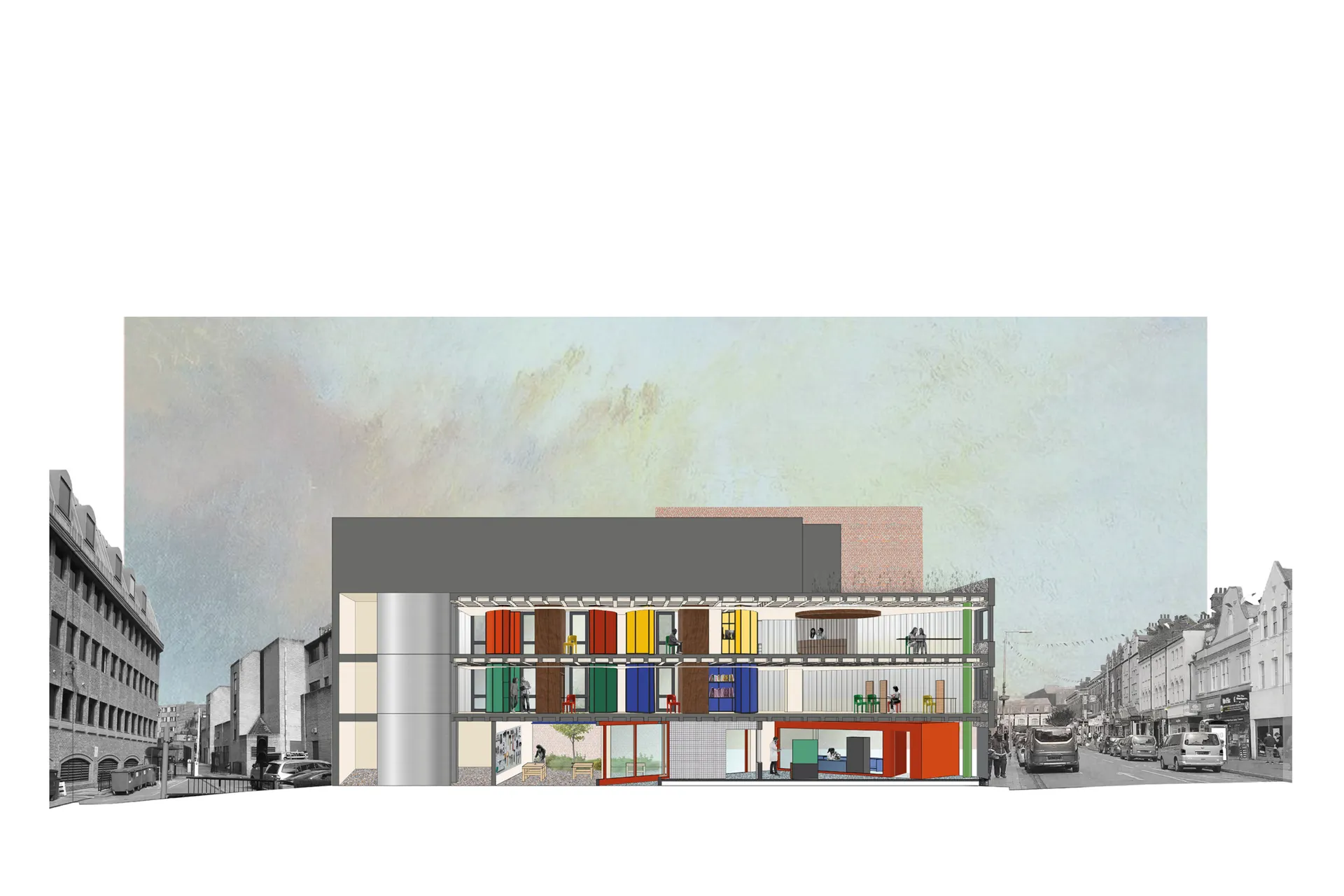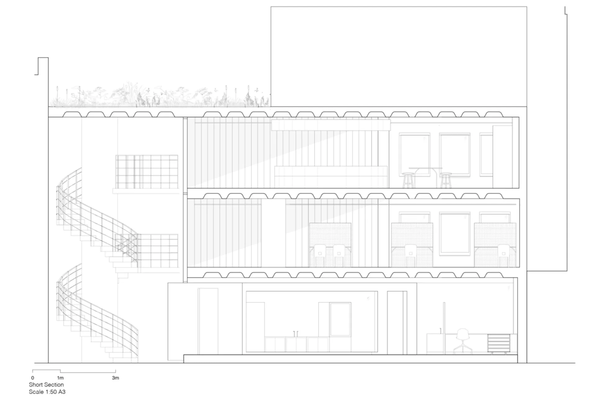 The proposal is for a disused retail space on Fife Road in Kingston Upon Thames to encourage research into sustainable material generation. Architectural interventions tackle existing problems with the deep dark plan allowing little natural light or air into the building. The steel floor plate and curved steel roof have been removed to create a courtyard at the back of the building, a 45 degree cut has been taken through to the front of the building. This creates a new partly covered triple height public walkway to the rear of the building leading to a new entry sequence.