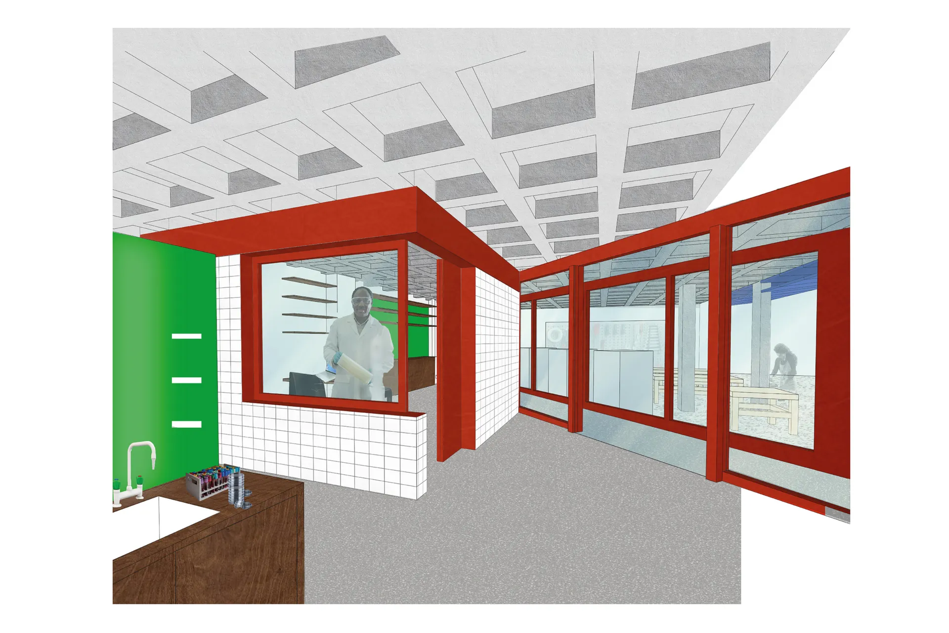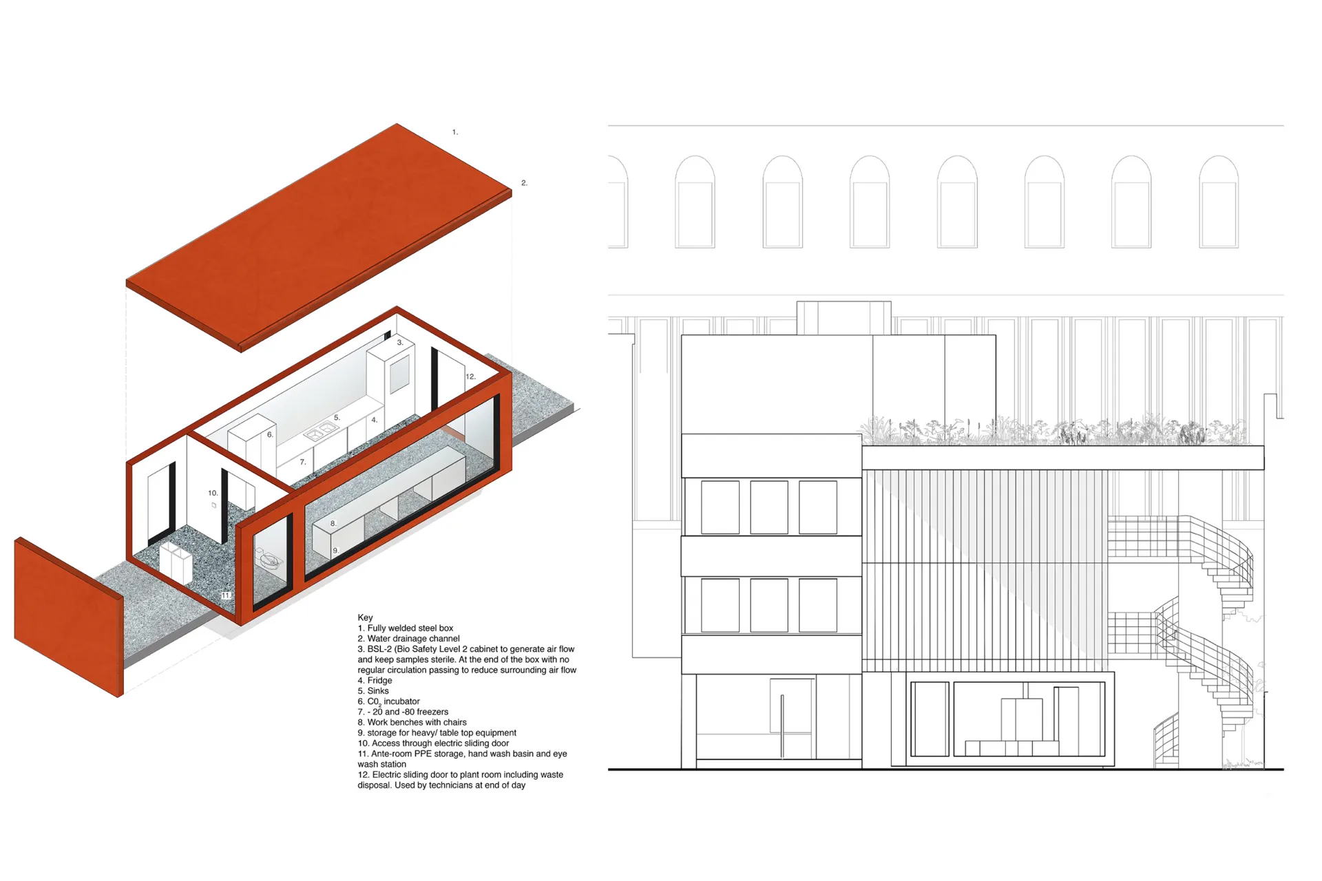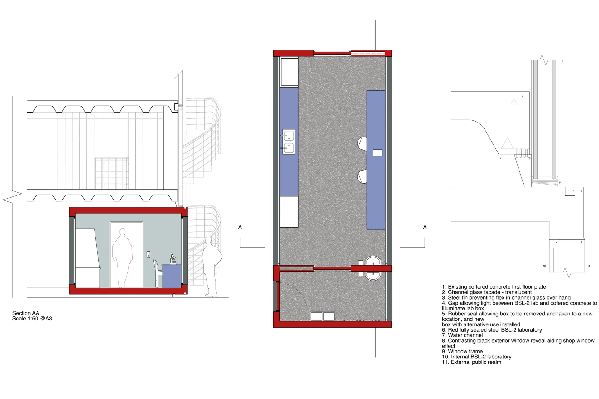 The ground floor is comprised of the shared facilities including a bio safety level (BSL) 1 lab including technician’s lab, BSL-2 lab and 3D workshop. These uses are separated into boxes which have been sliced by a central glass corridor. The BSL-2 lab is contained in a fully sealed box, which protrudes from the new channel glass façade putting often invisible research on display.