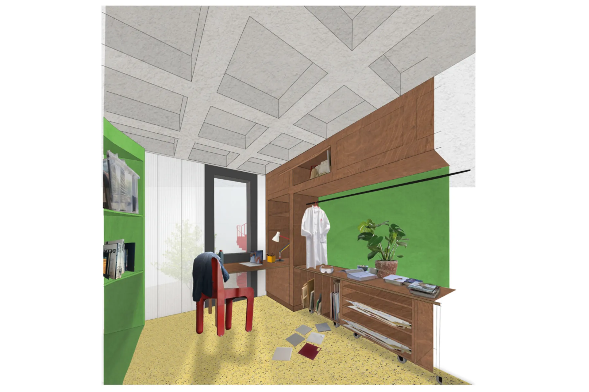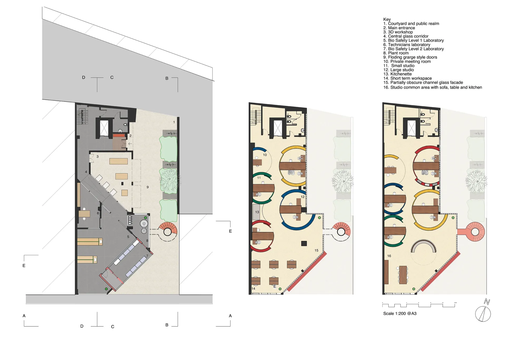 Private studio spaces, co-working space and a communal area makes up the first and second floor. Studios are used by individuals and small startups in biotechnology. There are two sizes of studio, regular, ideal for one or two people and a larger size, which is designed for two or three people to work comfortably.