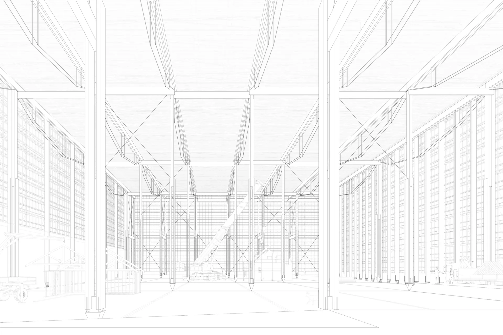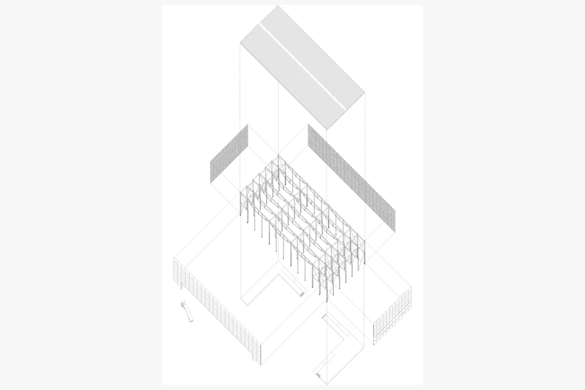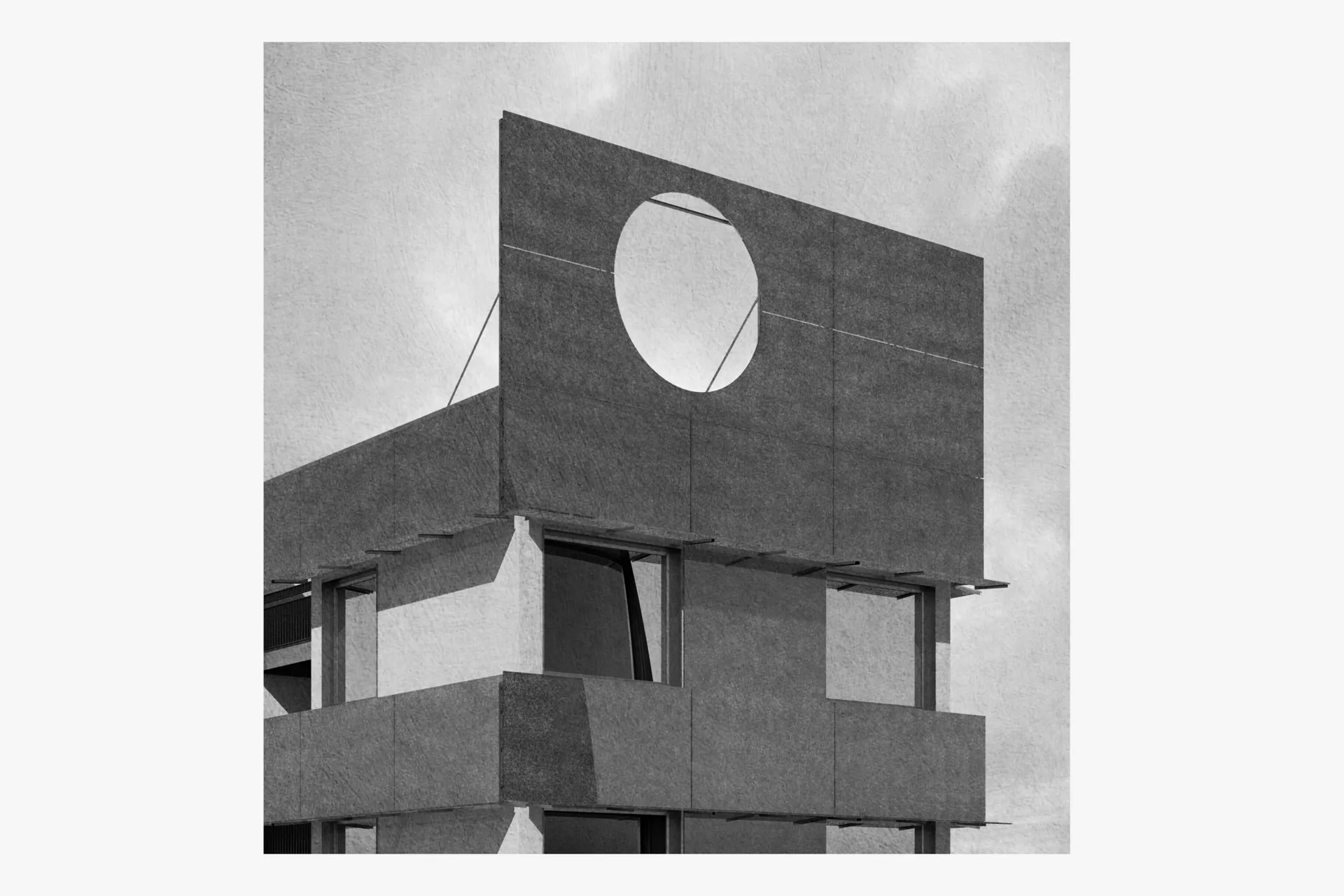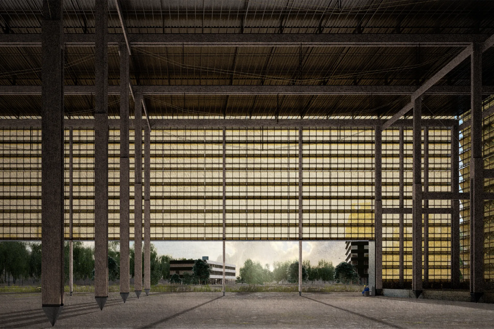 Compositionally, the campus is formed of three primary buildings, the Accommodation Tower, the Learning Centre, and the Construction Hall. Each operating purely of its core function, with only necessity driving their provision and their physical form. The morphological arrangement of the campus pays tribute to the situation of the former airfield’s hangars, making use of their discarded foundations. Across this area of sprawling concrete, sections will be removed in a highly respondent manner to the pattern, rhythm and texture of the existing. In removing these sections, it allows the campus to introduce a new contingent of biodiversity through seasonal planting, whilst simultaneously fostering the established mature flora and forestry surrounding the site. This acts to establish a natural connection between the proposed and the existing.