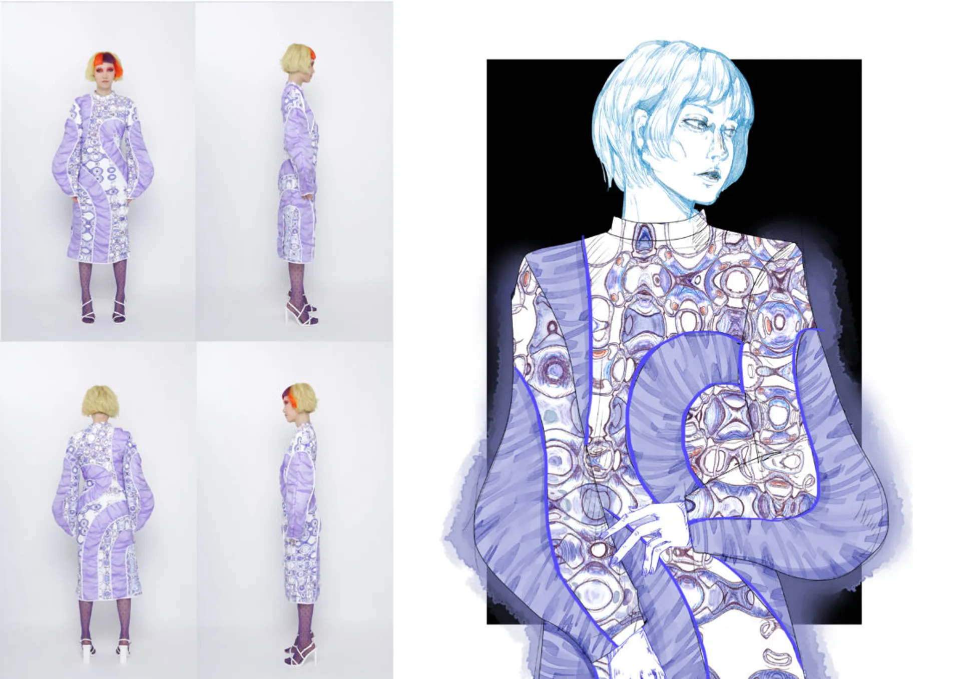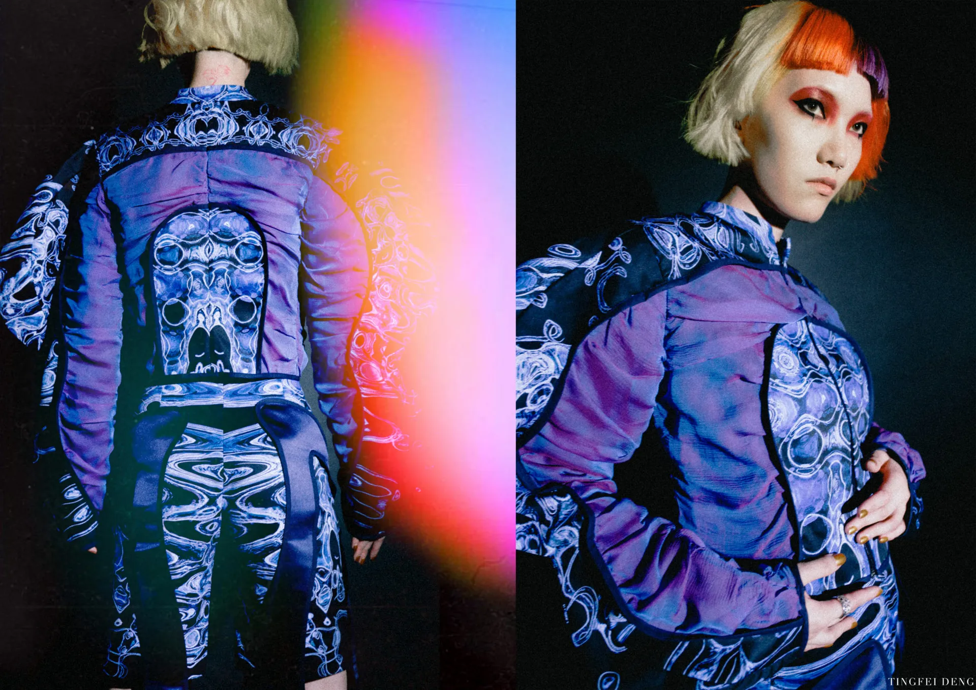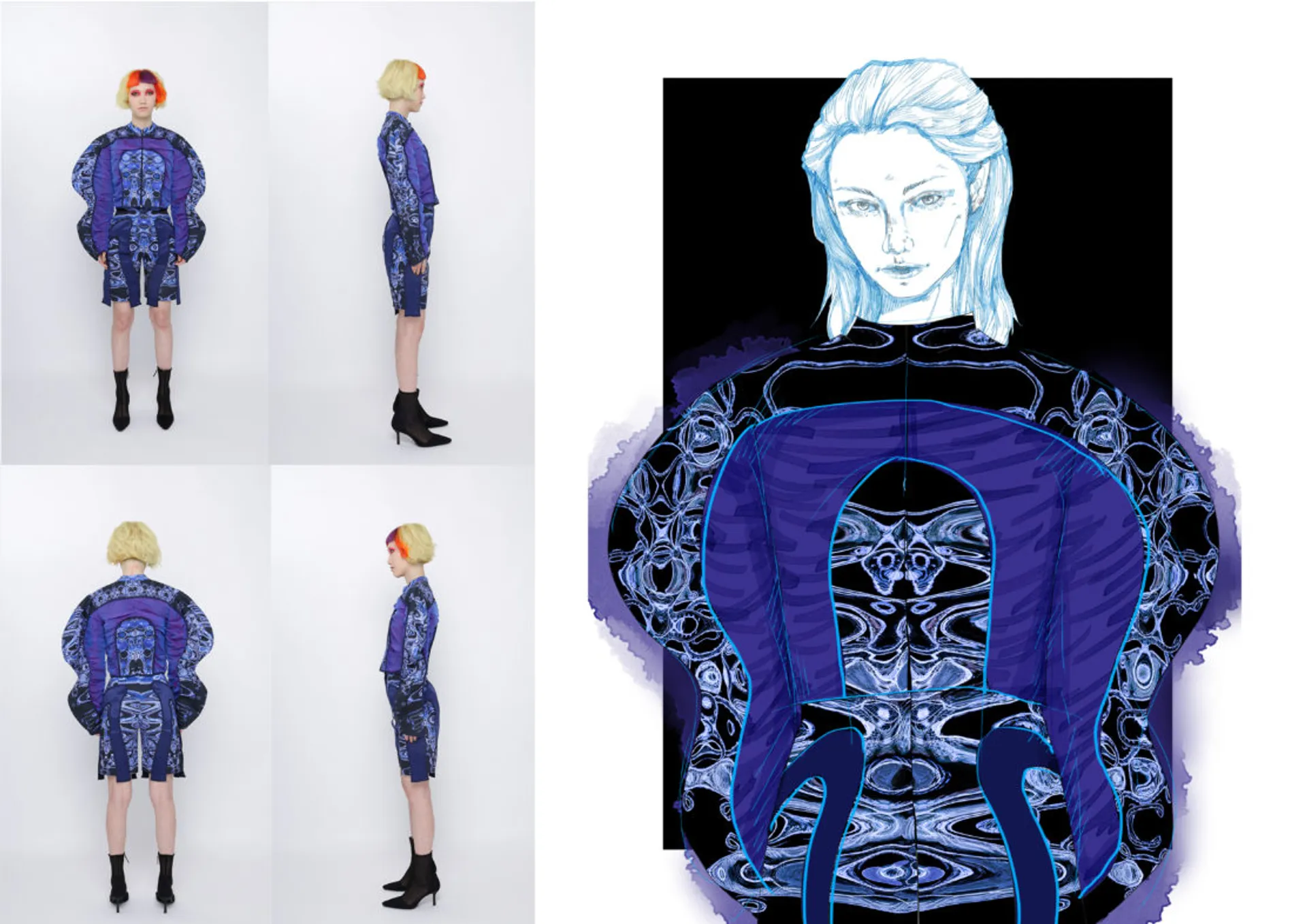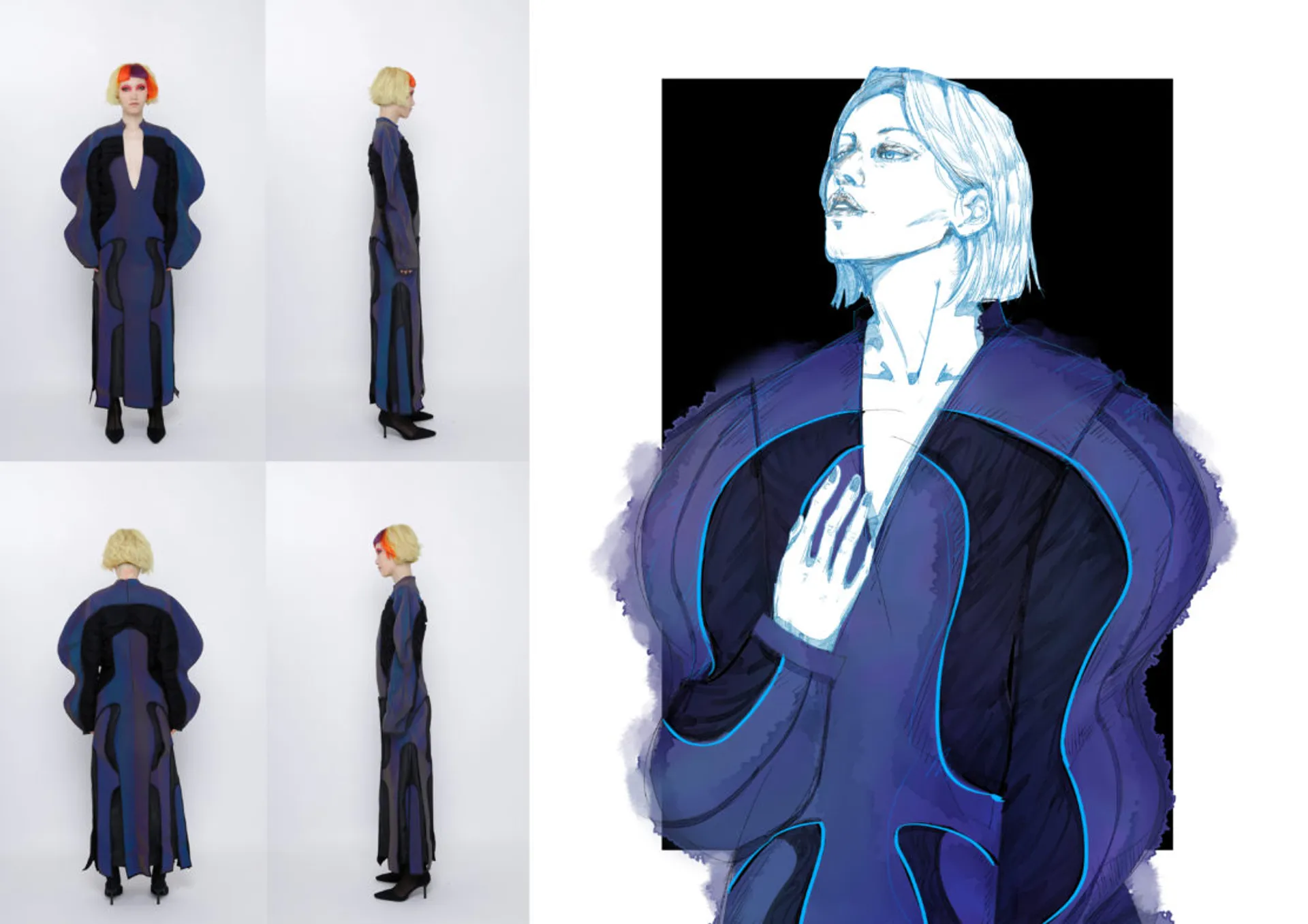 In my major project, the Kowloon Walled City which is called the ‘city of darkness’ in Hong Kong gave me the initial inspiration. This is the most densely populated area in the world in the 20th century. People here lived in dark corners forgotten by the city and lead poor but happy life. This phenomenon formed a strong contrast with the highly developed international city of Hong Kong. Although this place has been demolished, technological innovation and rapid development have largely led to a historic increase in income and wealth inequality. The contradiction between ‘high-tech’ and ‘low life’ still exists in every corner of this world. It brought me to a dystopian art form that expresses ‘high technology, low life’-cyberpunk. The kind of intense conflict also reminds me of deep-sea creatures that glow with vitality in the dark deep ocean, just like underclass people who have been forgotten in the corners of high-tech cities but have strong lives. The special shape of deep-sea creatures gave me a reference for the silhouette. In my major project, I tried to use the language of fashion design to express the vitality of being neglected under the pressure of high-tech modern life, but still strong to survive, to arouse people’s attention and concern for the disadvantaged groups, and to discuss ‘how to narrow the gap between rich and poor is an eternal social topic.