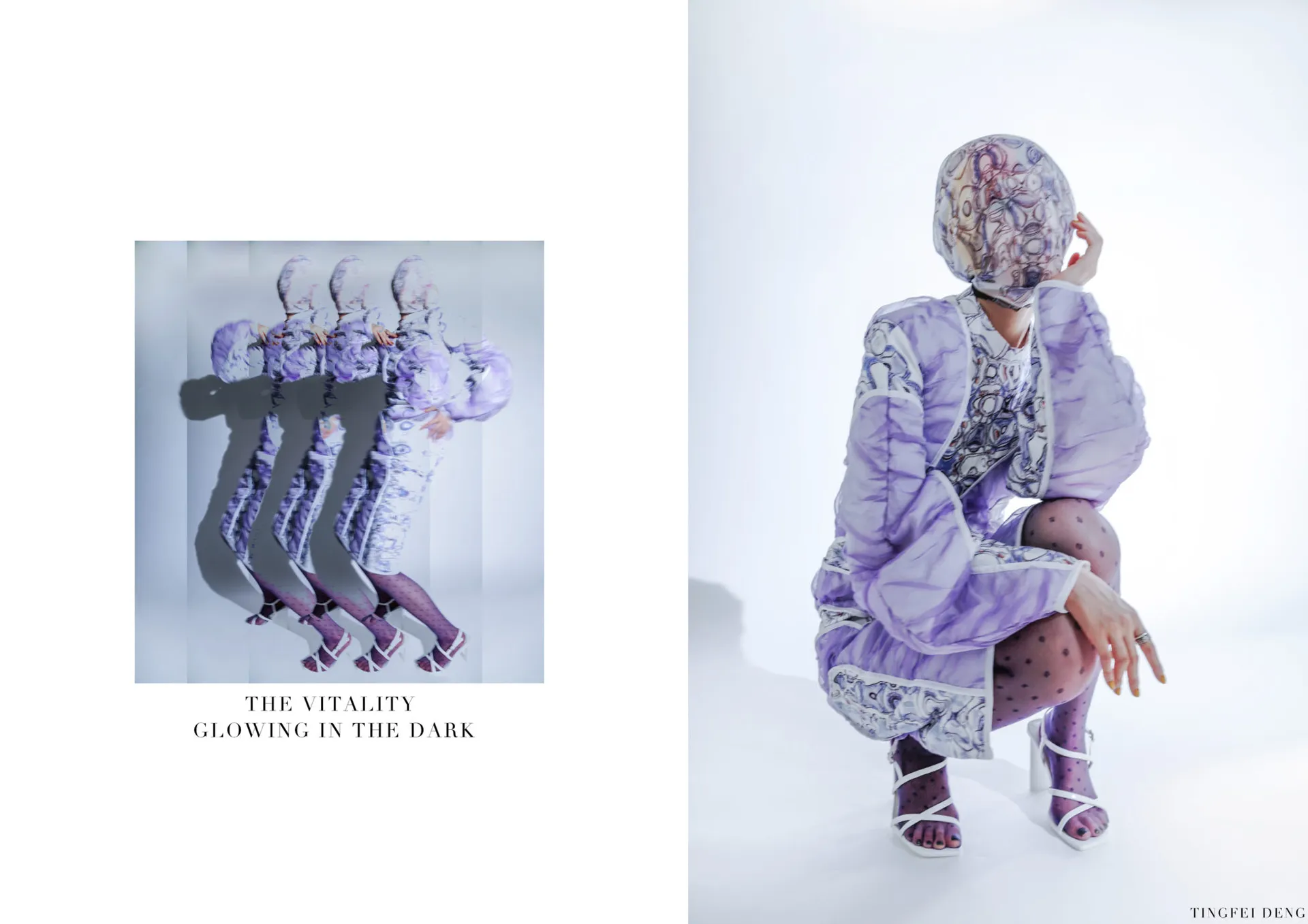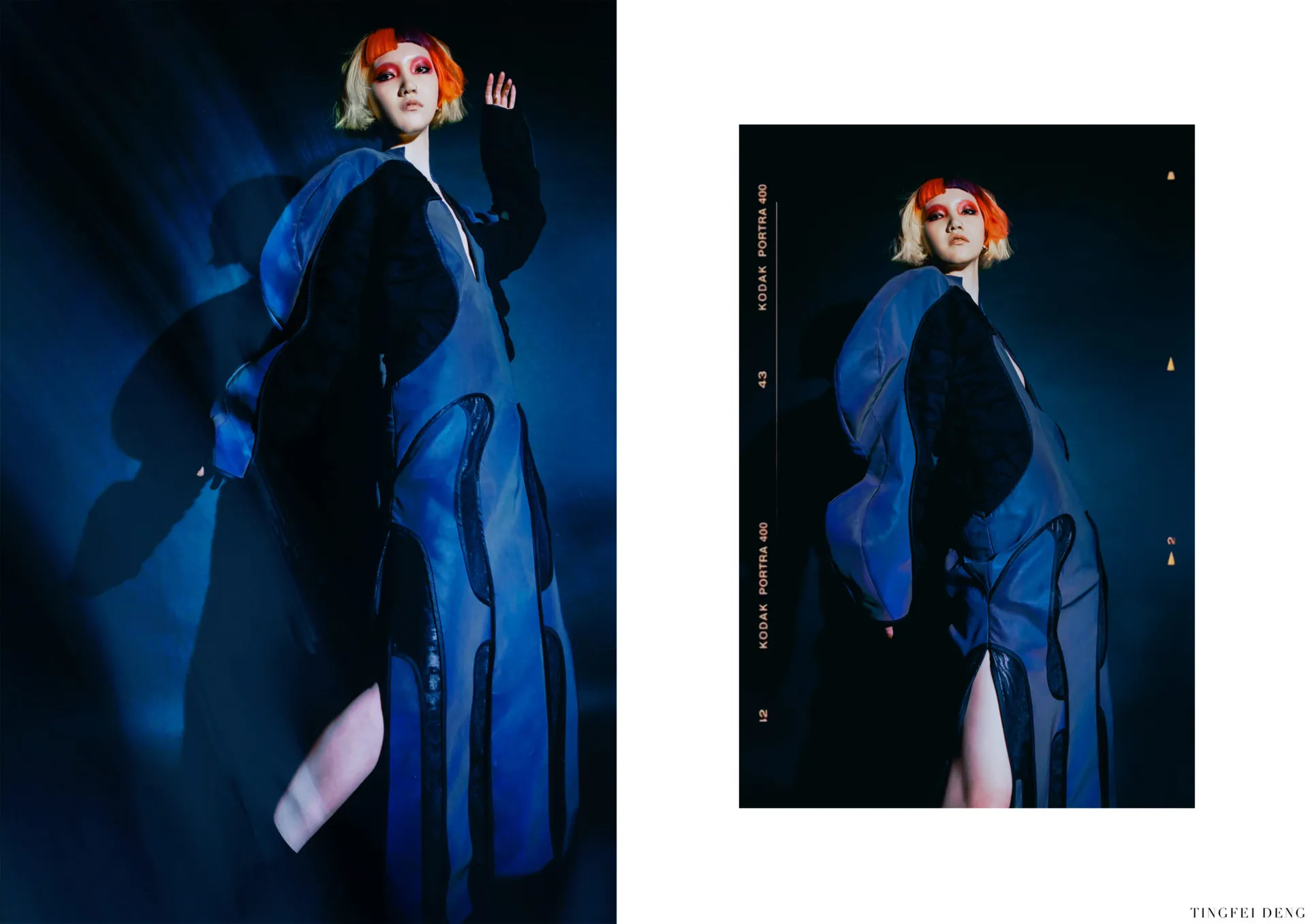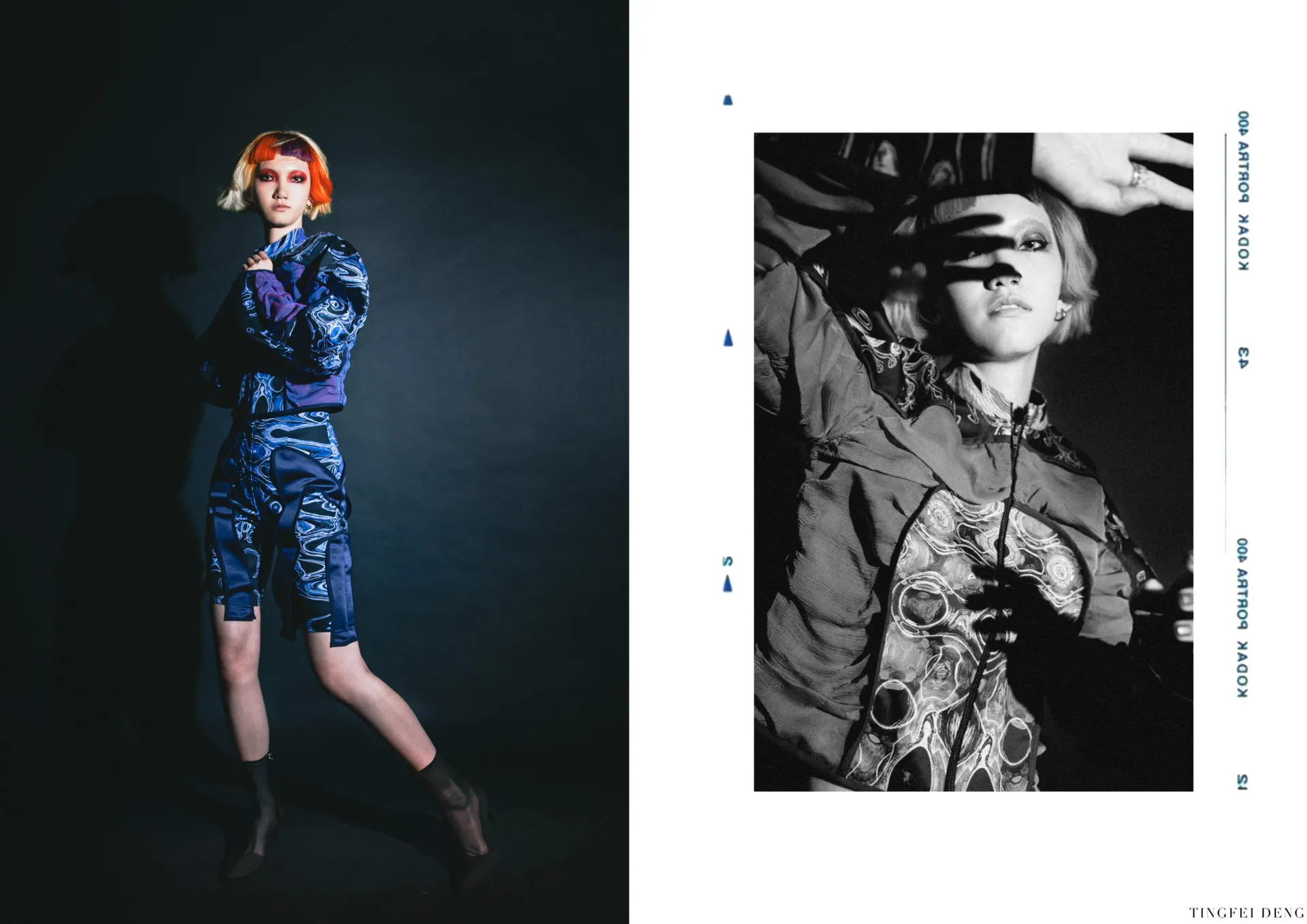 In my major project, the Kowloon Walled City which is called the ‘city of darkness’ in Hong Kong gave me the initial inspiration. This is the most densely populated area in the world in the 20th century. People here lived in dark corners forgotten by the city and lead poor but happy life. This phenomenon formed a strong contrast with the highly developed international city of Hong Kong. Although this place has been demolished, technological innovation and rapid development have largely led to a historic increase in income and wealth inequality. The contradiction between ‘high-tech’ and ‘low life’ still exists in every corner of this world. It brought me to a dystopian art form that expresses ‘high technology, low life’-cyberpunk. The kind of intense conflict also reminds me of deep-sea creatures that glow with vitality in the dark deep ocean, just like underclass people who have been forgotten in the corners of high-tech cities but have strong lives. The special shape of deep-sea creatures gave me a reference for the silhouette. In my major project, I tried to use the language of fashion design to express the vitality of being neglected under the pressure of high-tech modern life, but still strong to survive, to arouse people’s attention and concern for the disadvantaged groups, and to discuss ‘how to narrow the gap between rich and poor is an eternal social topic.