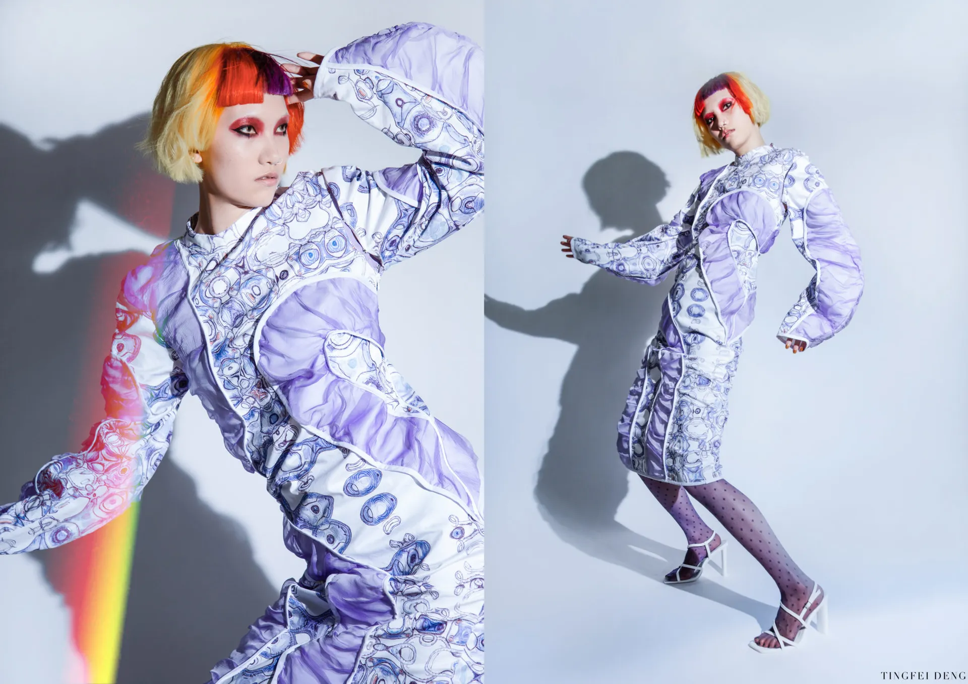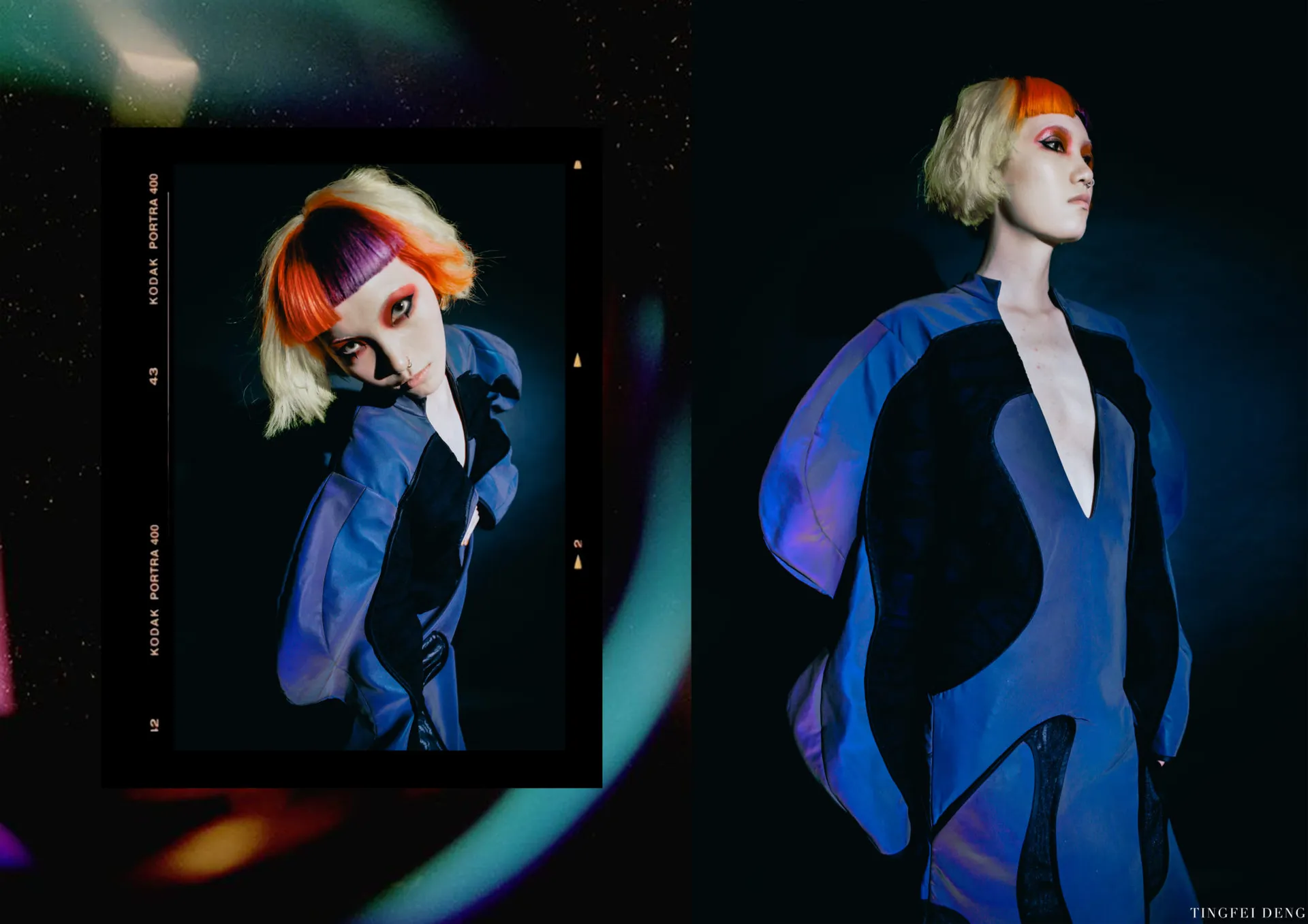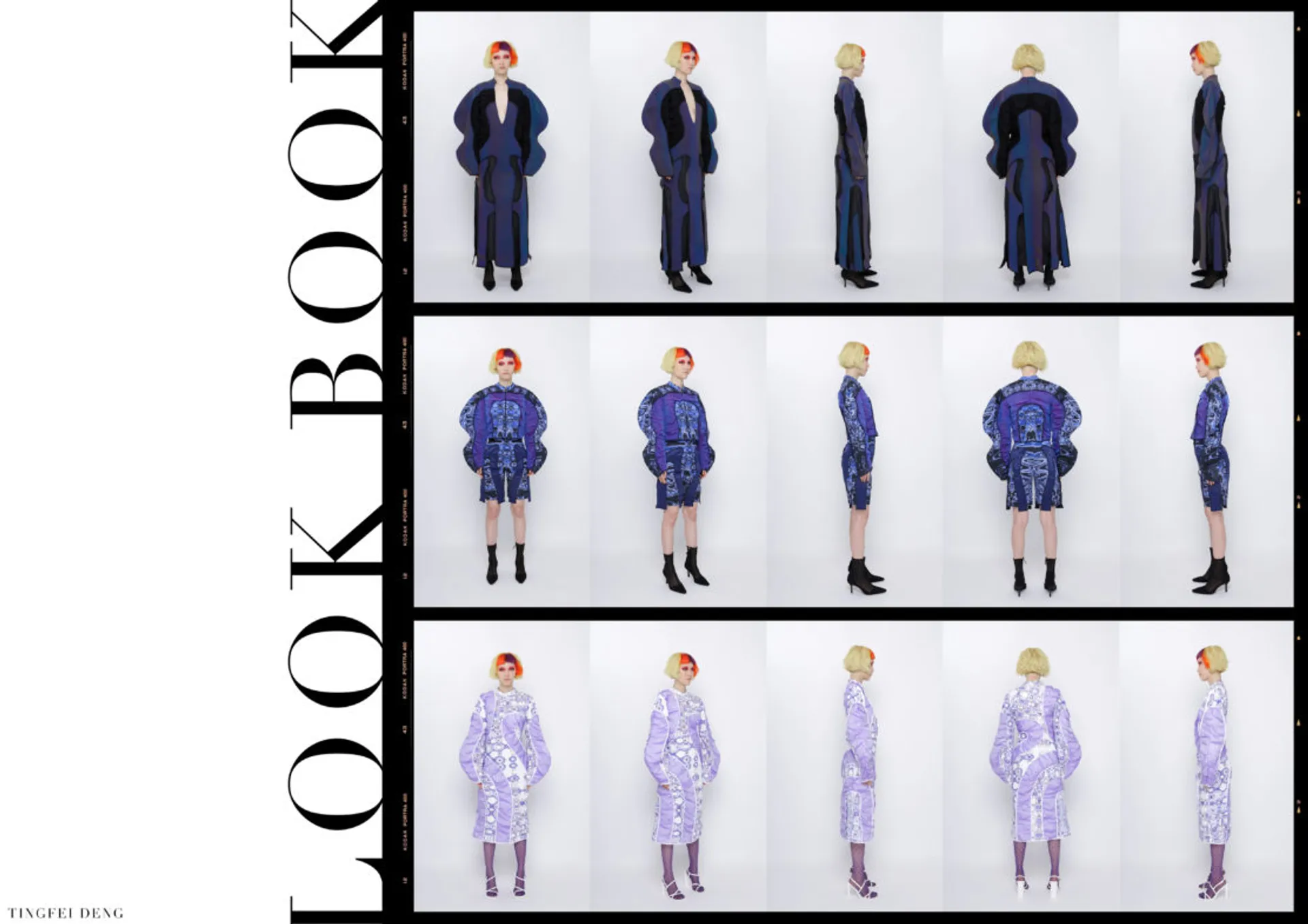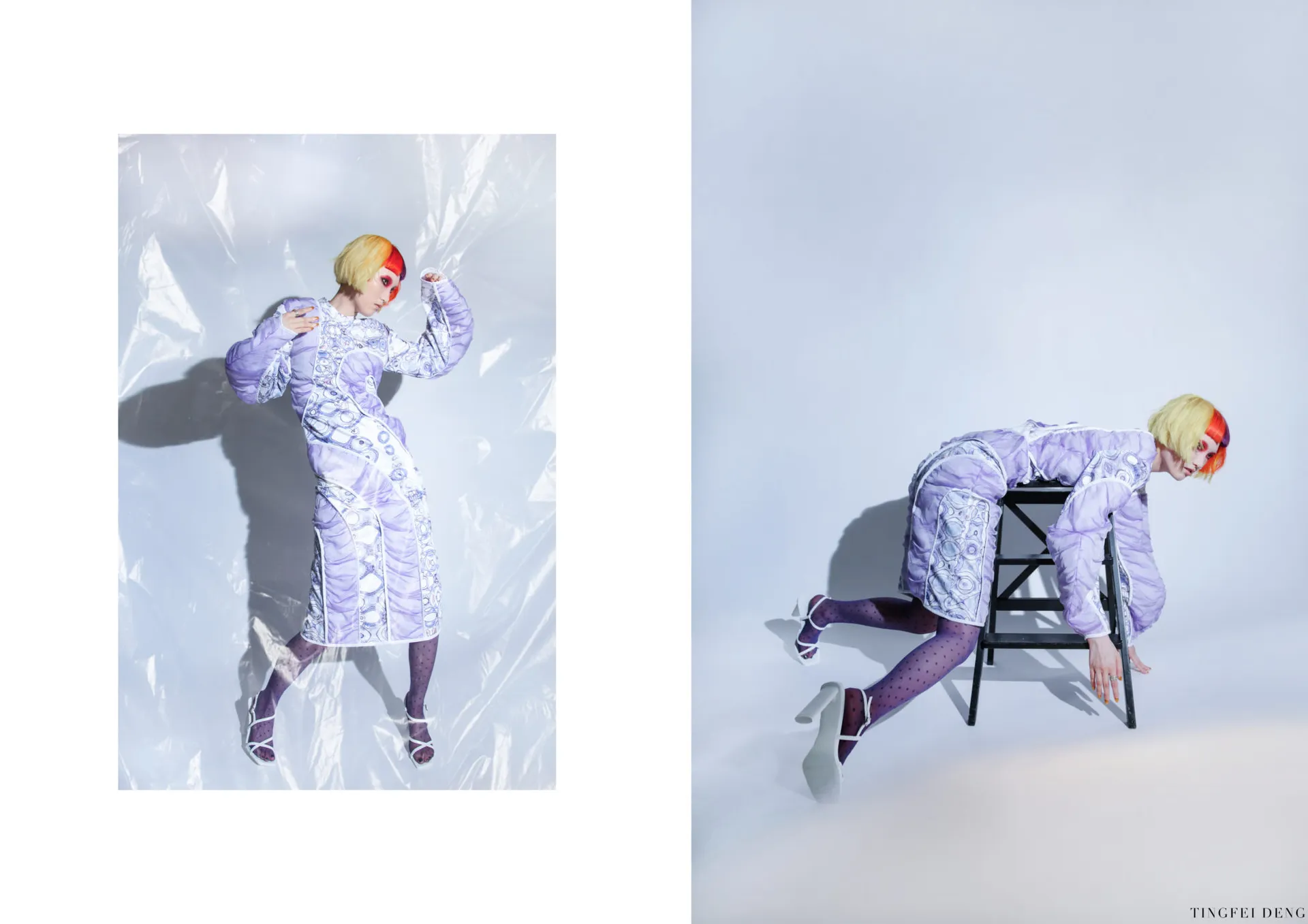 In my major project, the Kowloon Walled City which is called the ‘city of darkness’ in Hong Kong gave me the initial inspiration. This is the most densely populated area in the world in the 20th century. People here lived in dark corners forgotten by the city and lead poor but happy life. This phenomenon formed a strong contrast with the highly developed international city of Hong Kong. Although this place has been demolished, technological innovation and rapid development have largely led to a historic increase in income and wealth inequality. The contradiction between ‘high-tech’ and ‘low life’ still exists in every corner of this world. It brought me to a dystopian art form that expresses ‘high technology, low life’-cyberpunk. The kind of intense conflict also reminds me of deep-sea creatures that glow with vitality in the dark deep ocean, just like underclass people who have been forgotten in the corners of high-tech cities but have strong lives. The special shape of deep-sea creatures gave me a reference for the silhouette. In my major project, I tried to use the language of fashion design to express the vitality of being neglected under the pressure of high-tech modern life, but still strong to survive, to arouse people’s attention and concern for the disadvantaged groups, and to discuss ‘how to narrow the gap between rich and poor is an eternal social topic.