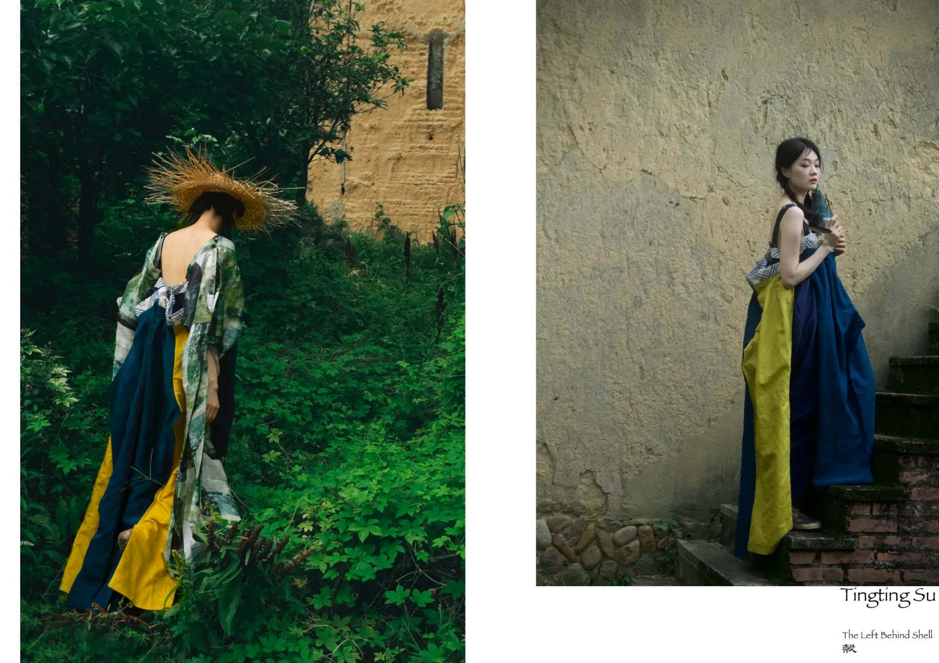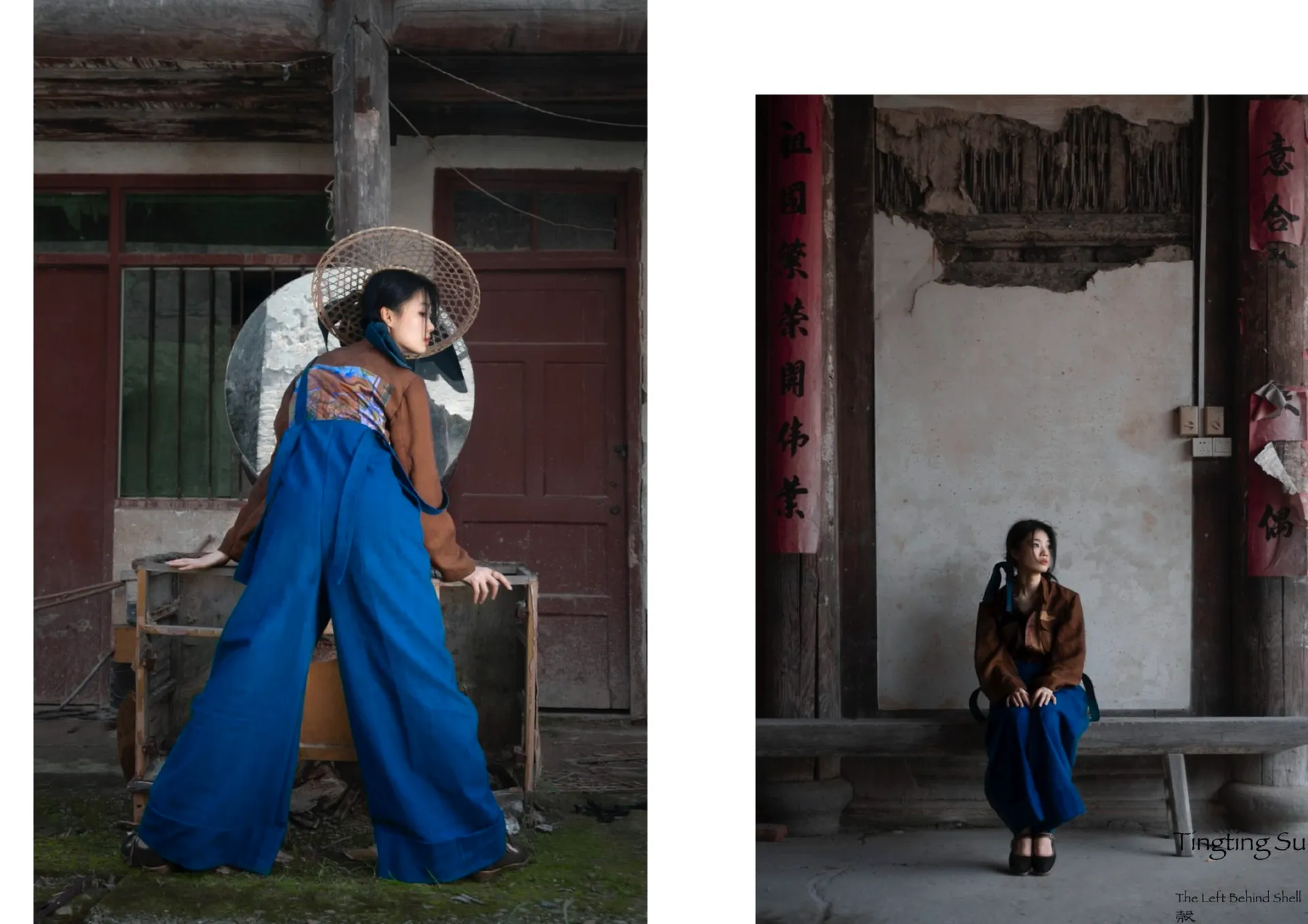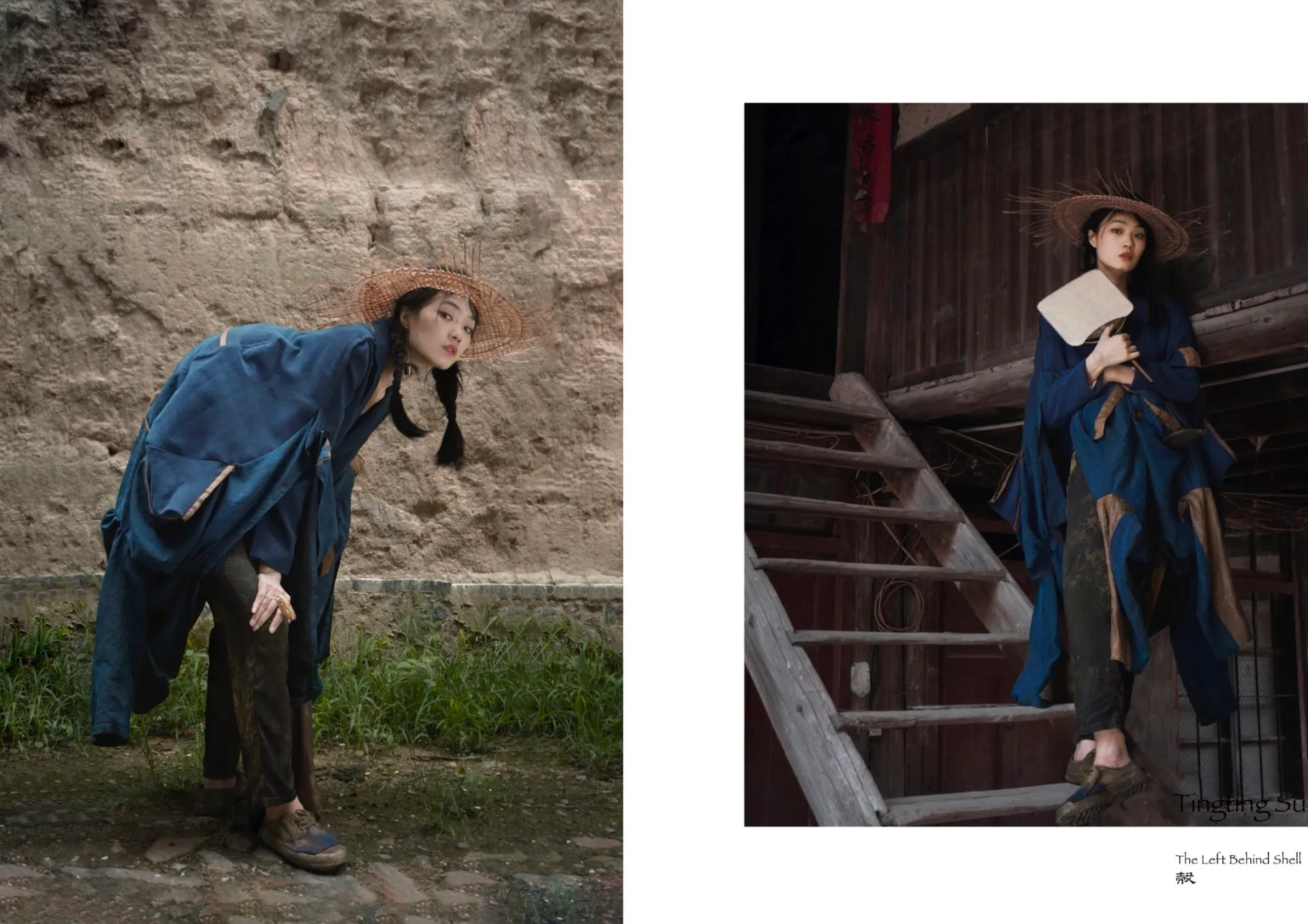 My final project content is about my left behind experience when i was a kid. and i grow up with my grandparents. as a left behind child, i used to feel lonely without my parents’ accompany. but i still have a very happy childhood with my grandparents’ accompany. i used to put on adult’s clothing a lot to have fun and being like an adult when i was a kid, and the huge adult’s cloth on my tiny body make the clothing oversize. so i got inspired by my grandparents’ work wear in land and the clothing they wear in the past. in that generation, people wear traditional clothing and western suit, it is very mixed. also i took the film camera shoot photograph, it is all about the countryside view and the earth building which i used to live. for fabric i used linen and sustainable silk which was dyed by shuliang (a type of plant ) and river mud.