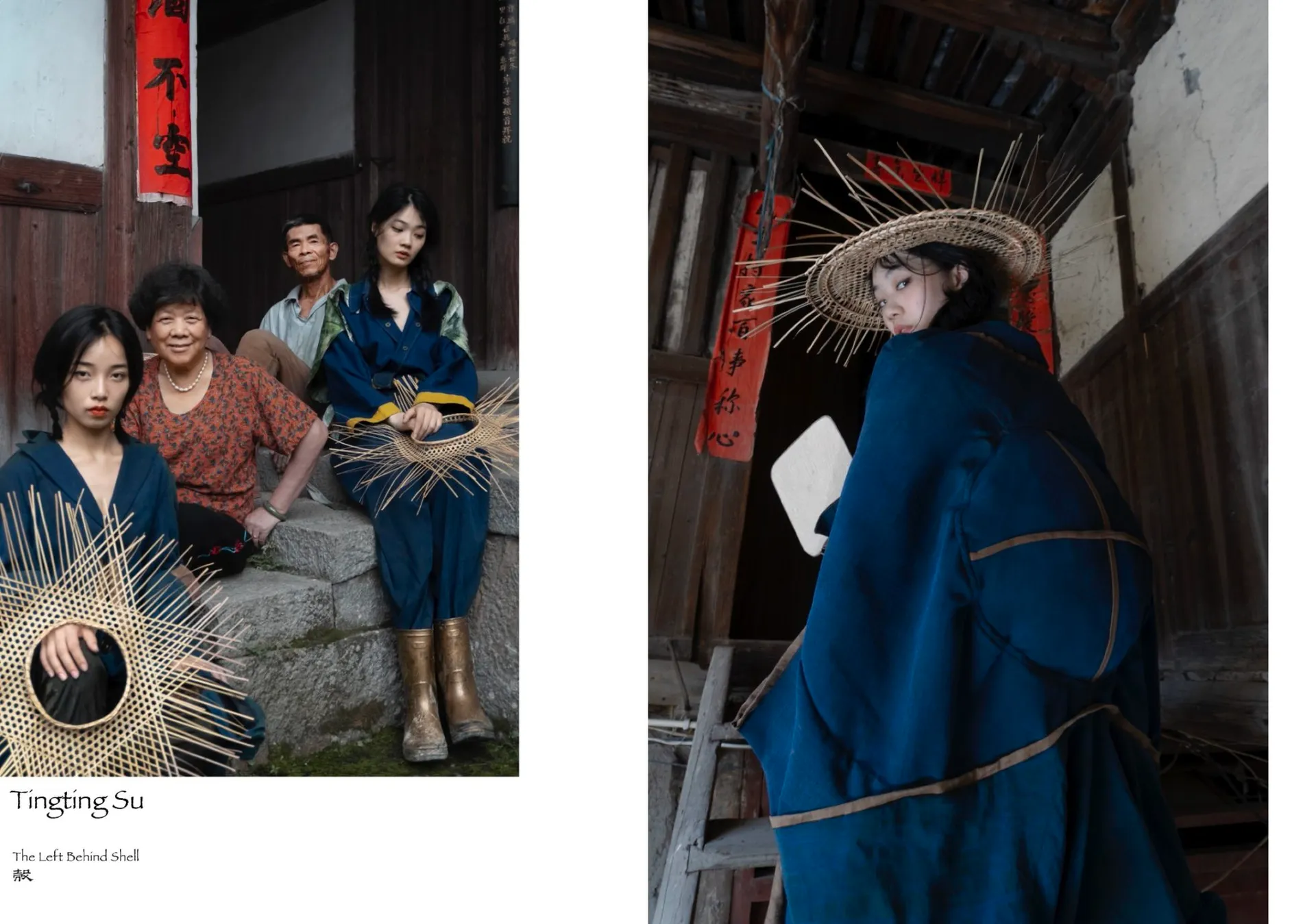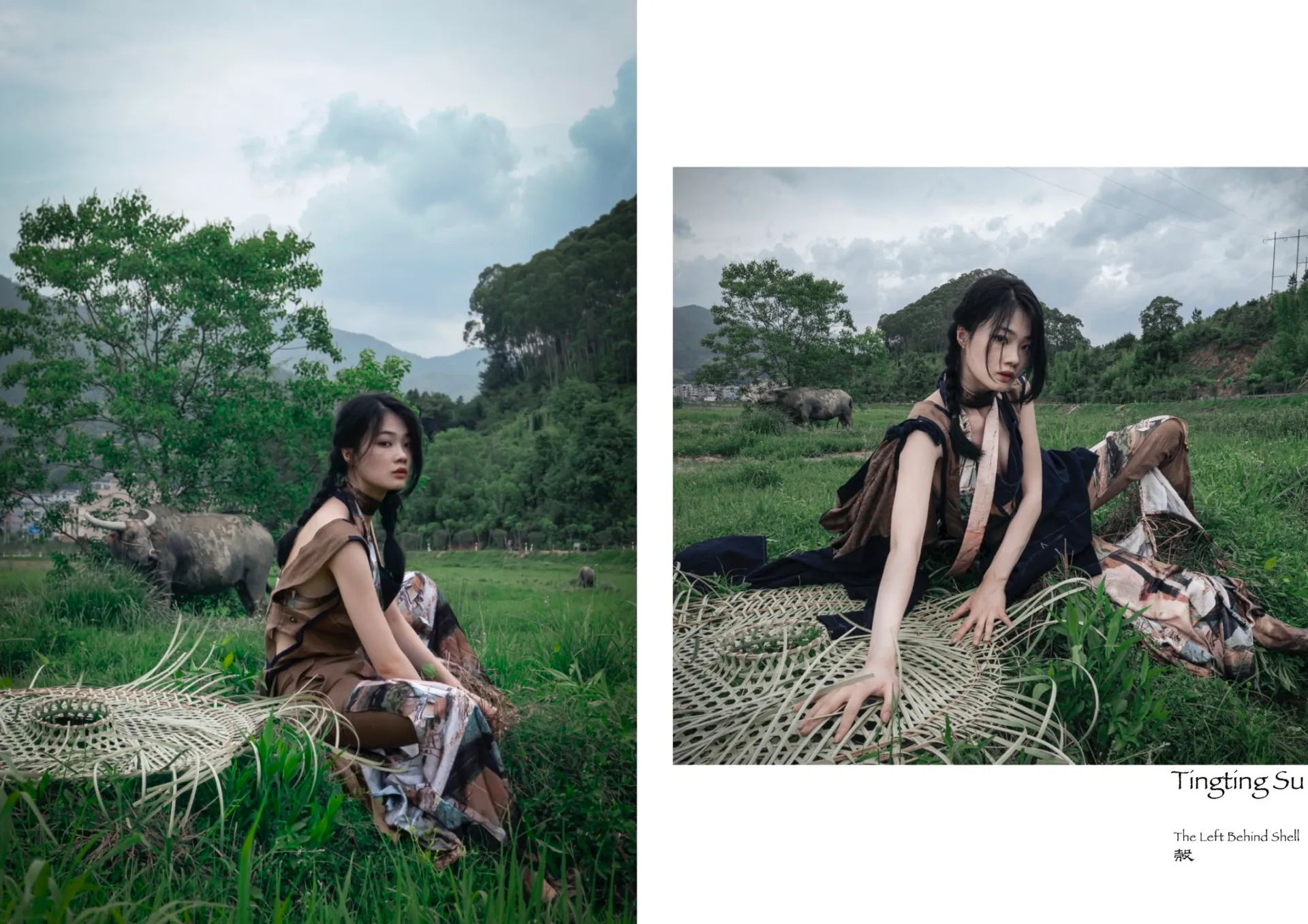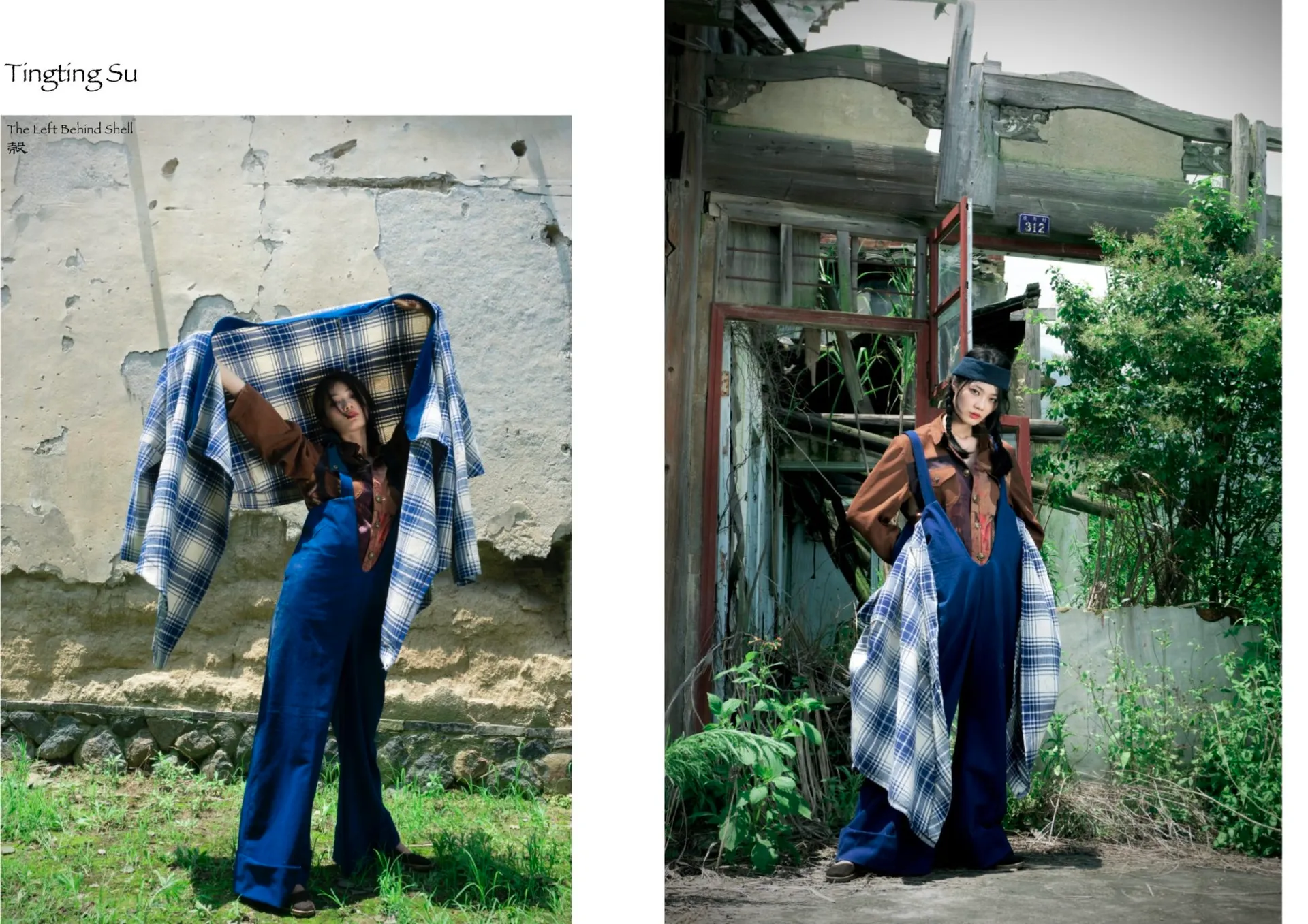 My final project content is about my left behind experience when i was a kid. and i grow up with my grandparents. as a left behind child, i used to feel lonely without my parents’ accompany. but i still have a very happy childhood with my grandparents’ accompany. i used to put on adult’s clothing a lot to have fun and being like an adult when i was a kid, and the huge adult’s cloth on my tiny body make the clothing oversize. so i got inspired by my grandparents’ work wear in land and the clothing they wear in the past. in that generation, people wear traditional clothing and western suit, it is very mixed. also i took the film camera shoot photograph, it is all about the countryside view and the earth building which i used to live. for fabric i used linen and sustainable silk which was dyed by shuliang (a type of plant ) and river mud.