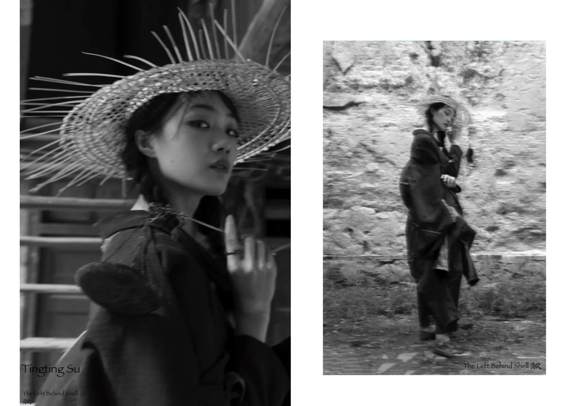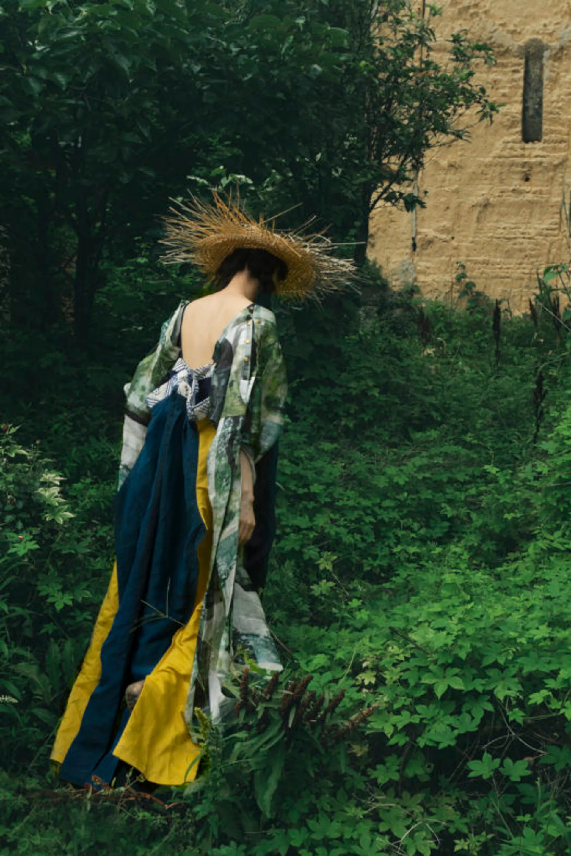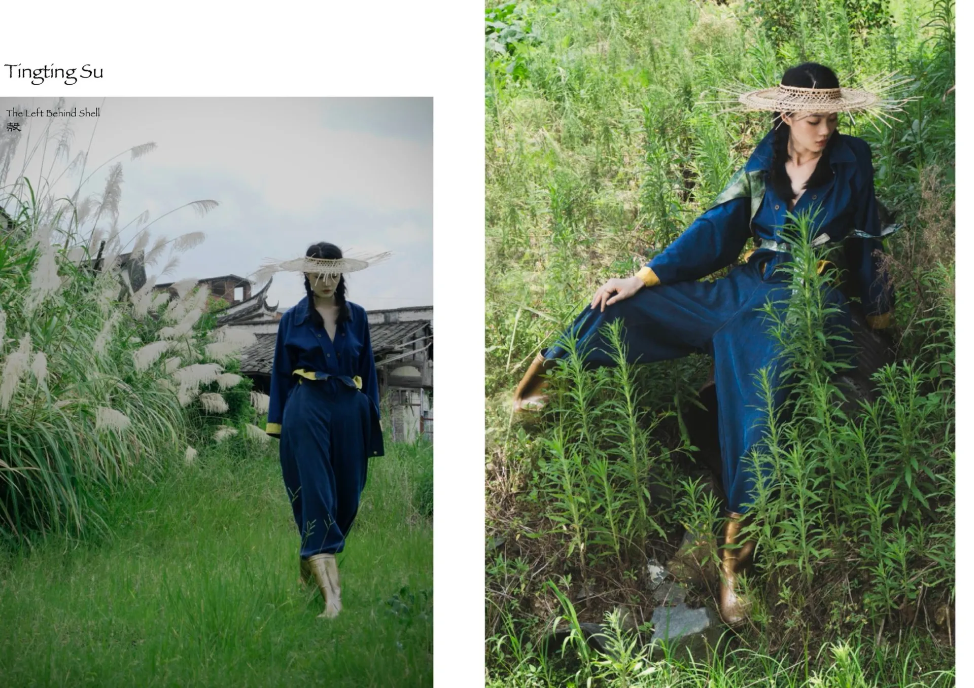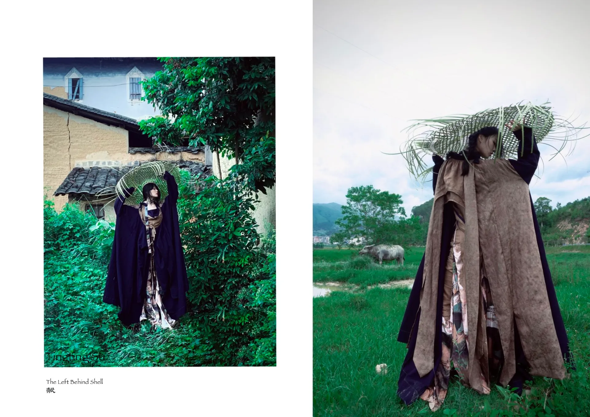 This image is from my collection look 1. I shoot the back ground of earth building and field in the countryside, and make them to be my print on the sleeve. For the main part on back, i used sustainable silk which is 100% plant dying and hand made. The hat is made by bamboo, which is developed from my grandma’s farm work hat.