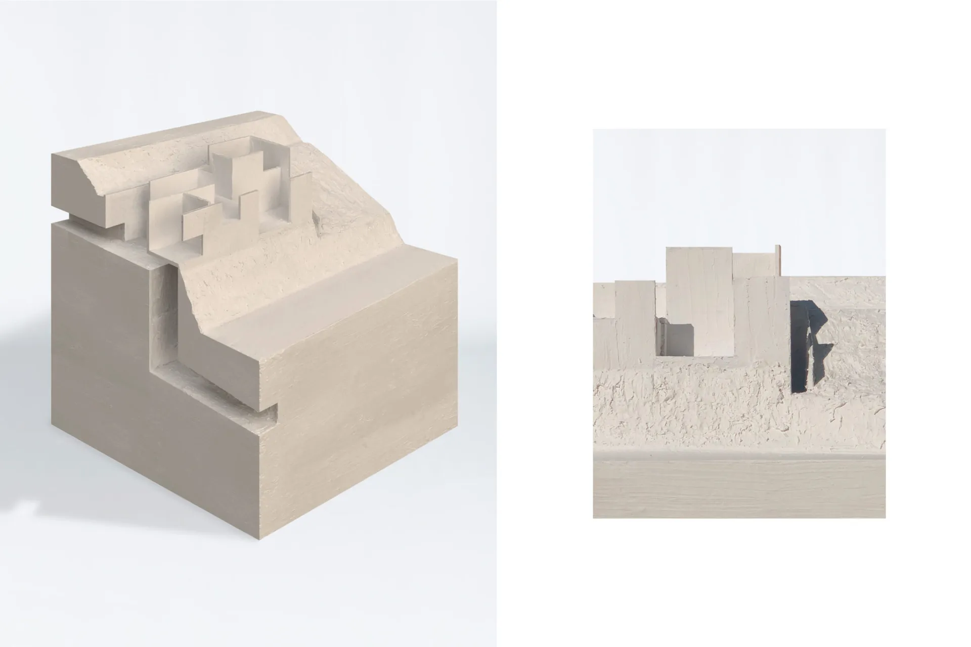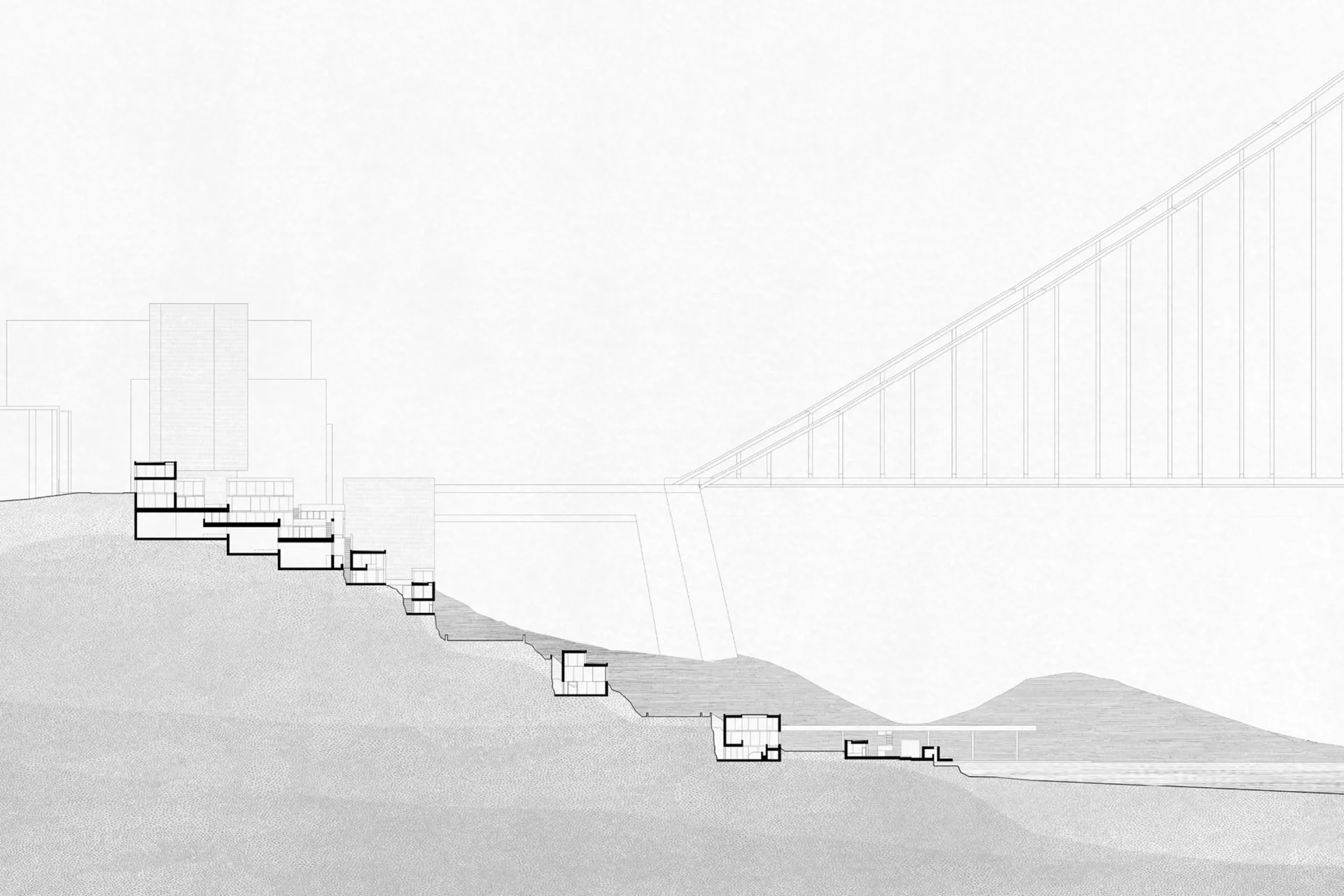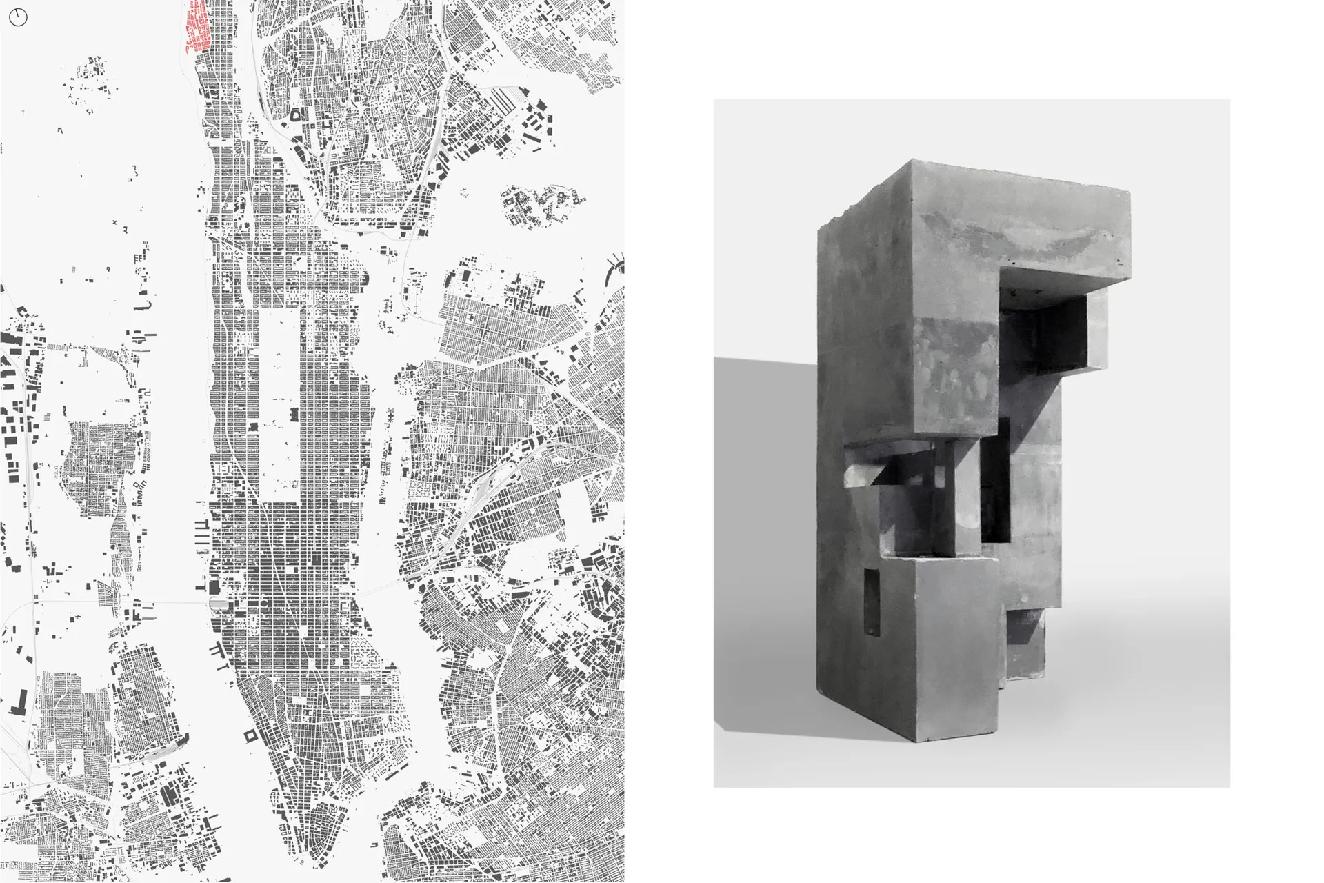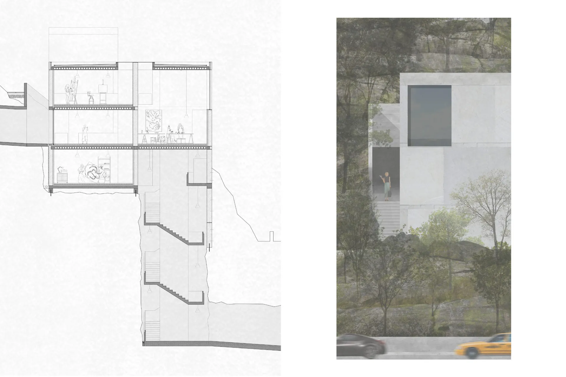 The brief for the project was derived from readings of fiction and imagined depictions of real places. Specifically, The Palace of Justice in Brussels, described in the book ‘Austerlitz’ by W. G Sebald. The novel is permeated with metaphors described through the exploration of space, reminding Austerlitz of lost memories. When describing The Palace of Justice, Sebald tells a story of Austerlitz finding his way through a labyrinth-like mountain of stone one can get lost within. Set within and antithetical to Manhattan’s skyscrapers and centralised parks, the project opens up previously inaccessible public space between existing infrastructure, encouraging exploration of an outlying area of Manhattan. Envisioning the project as a mountain of stone led to an investigation into quarrying, and the use of stone as a building material developed into the creation of stereotomic space and stone in its most archaic form. Against the cityscape of Manhatten, the building is carved out of the cliffside, stepping down toward the Hudson. In parallel, the project seeks to challenge the future of educational and artistic spaces in New York by embarrassing the recent return to the belief in the state as a driver of instrumental public works.