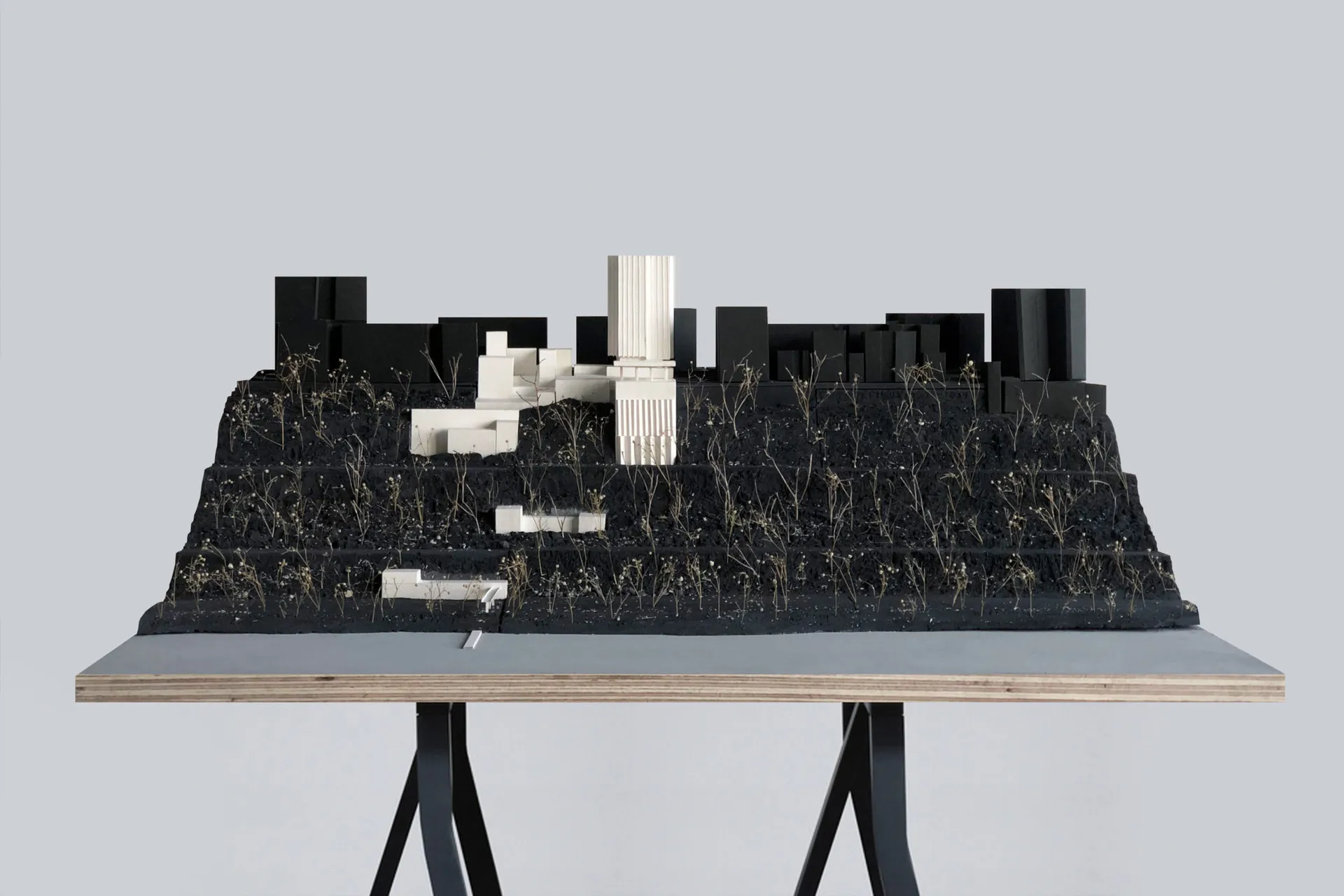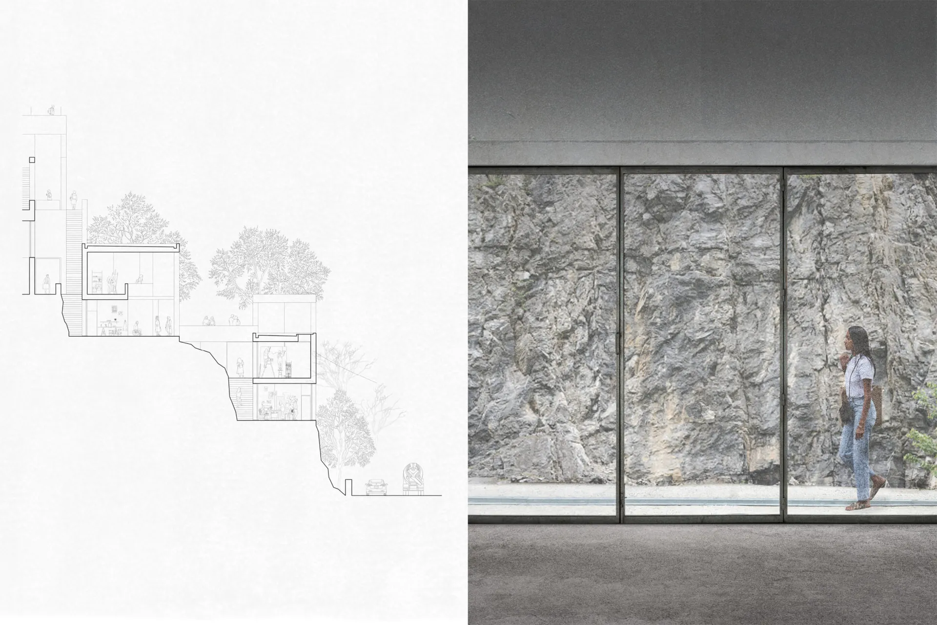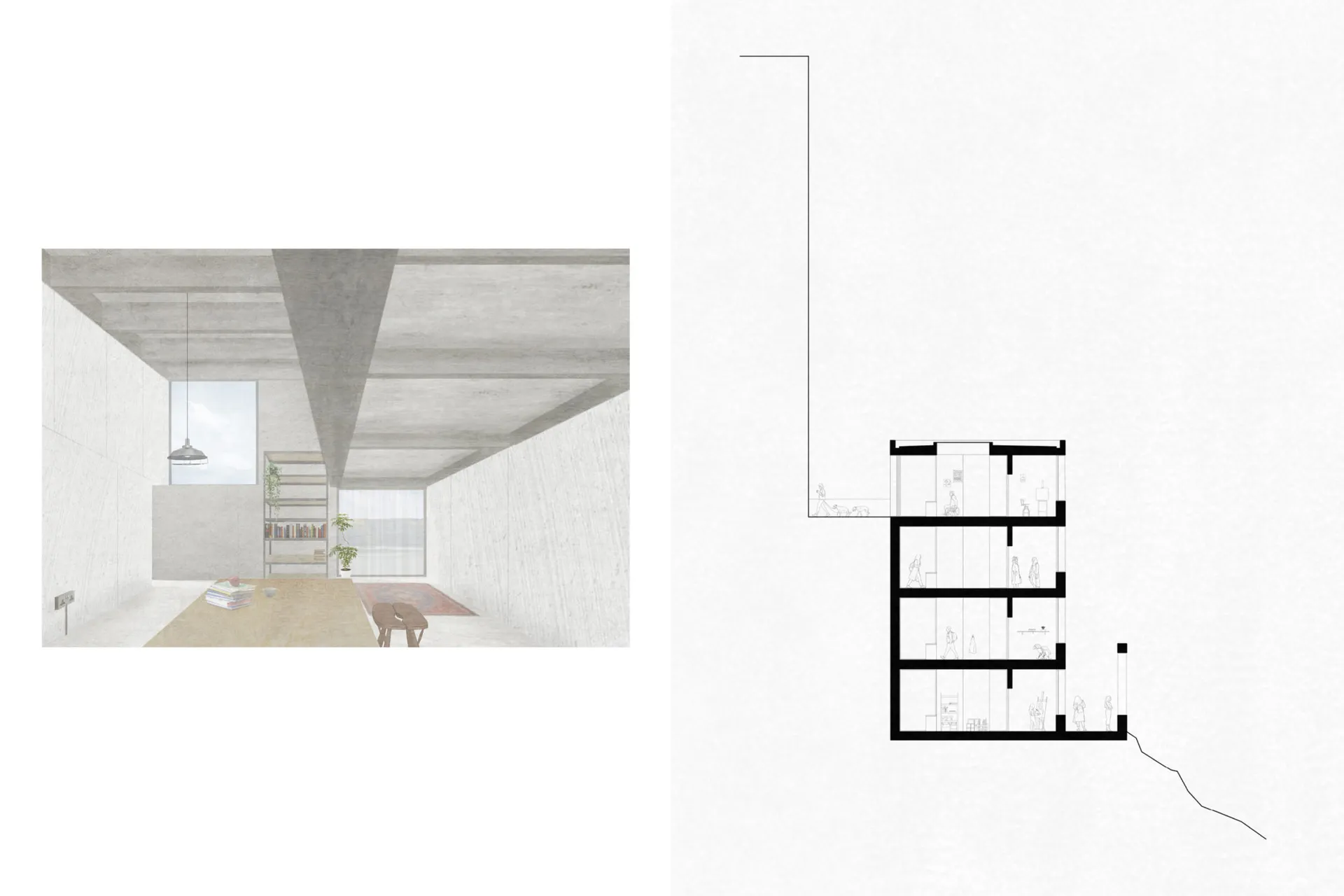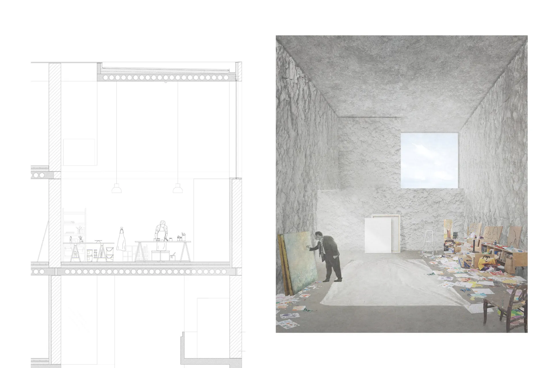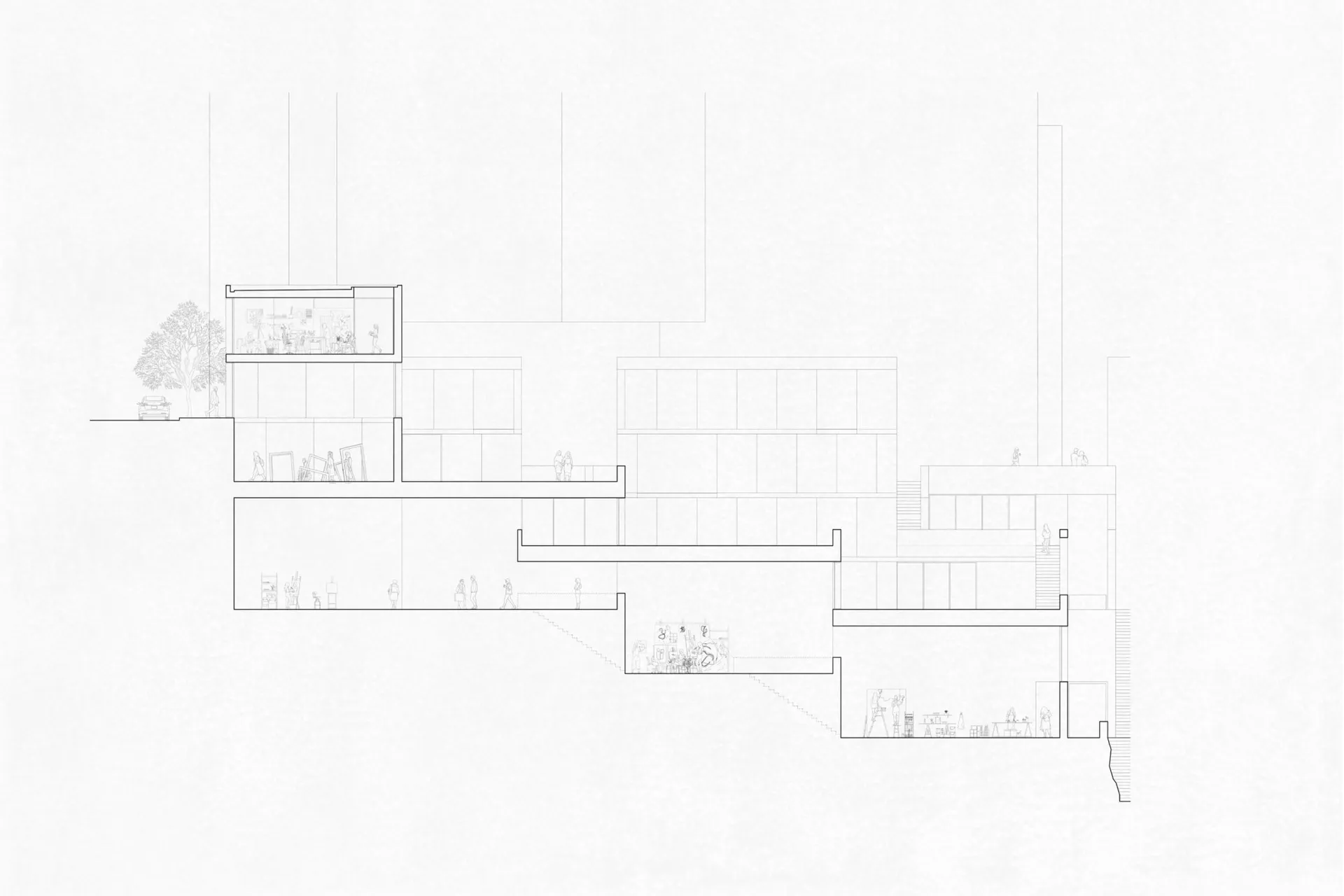 The brief for the project was derived from readings of fiction and imagined depictions of real places. Specifically, The Palace of Justice in Brussels, described in the book ‘Austerlitz’ by W. G Sebald. The novel is permeated with metaphors described through the exploration of space, reminding Austerlitz of lost memories. When describing The Palace of Justice, Sebald tells a story of Austerlitz finding his way through a labyrinth-like mountain of stone one can get lost within. Set within and antithetical to Manhattan’s skyscrapers and centralised parks, the project opens up previously inaccessible public space between existing infrastructure, encouraging exploration of an outlying area of Manhattan. Envisioning the project as a mountain of stone led to an investigation into quarrying, and the use of stone as a building material developed into the creation of stereotomic space and stone in its most archaic form. Against the cityscape of Manhatten, the building is carved out of the cliffside, stepping down toward the Hudson. In parallel, the project seeks to challenge the future of educational and artistic spaces in New York by embarrassing the recent return to the belief in the state as a driver of instrumental public works.