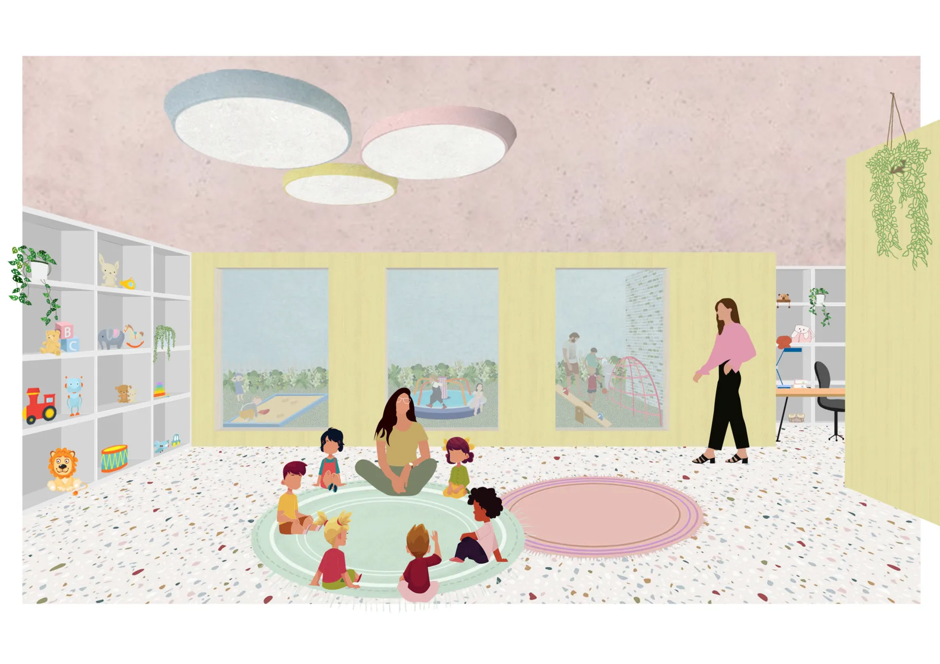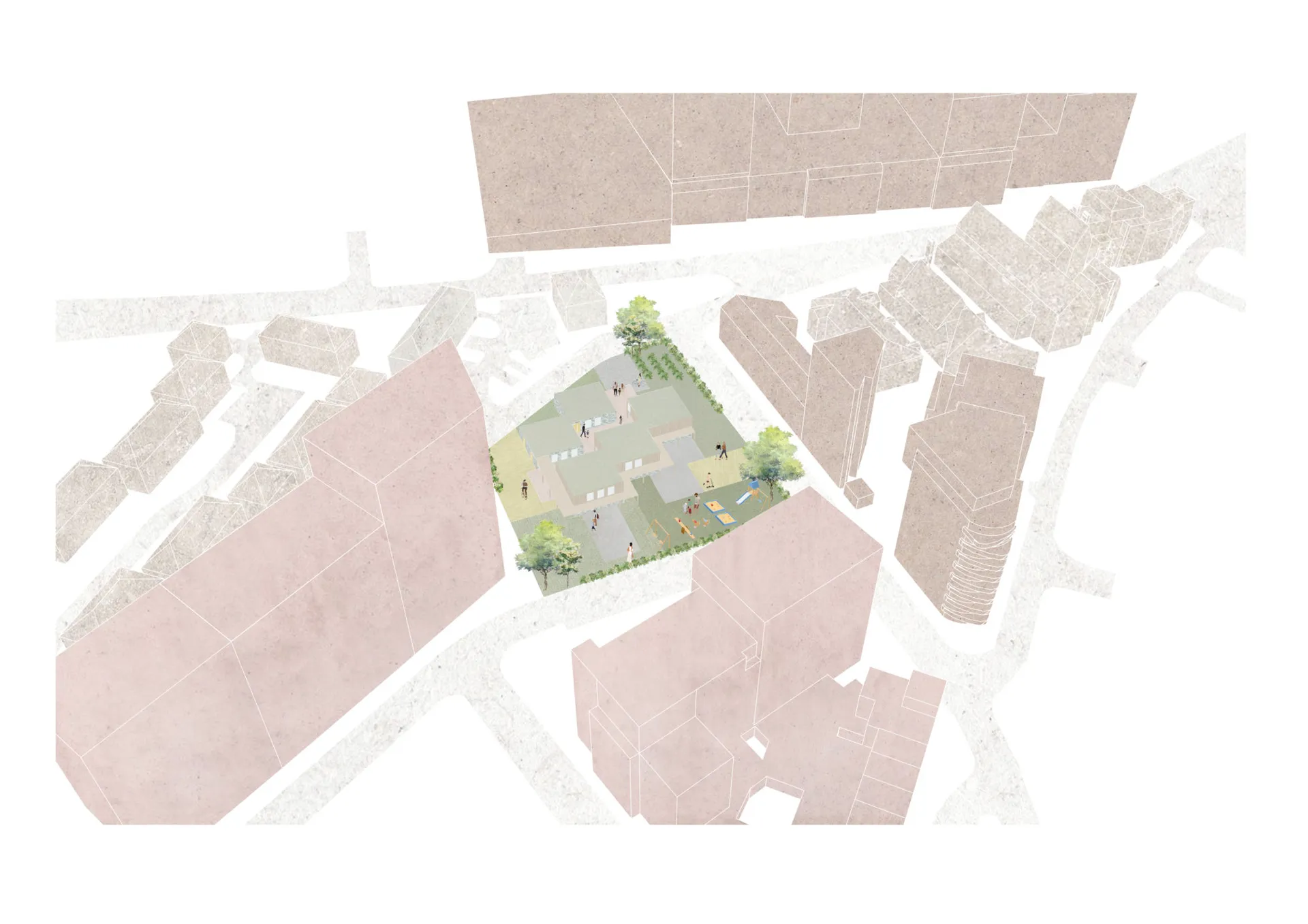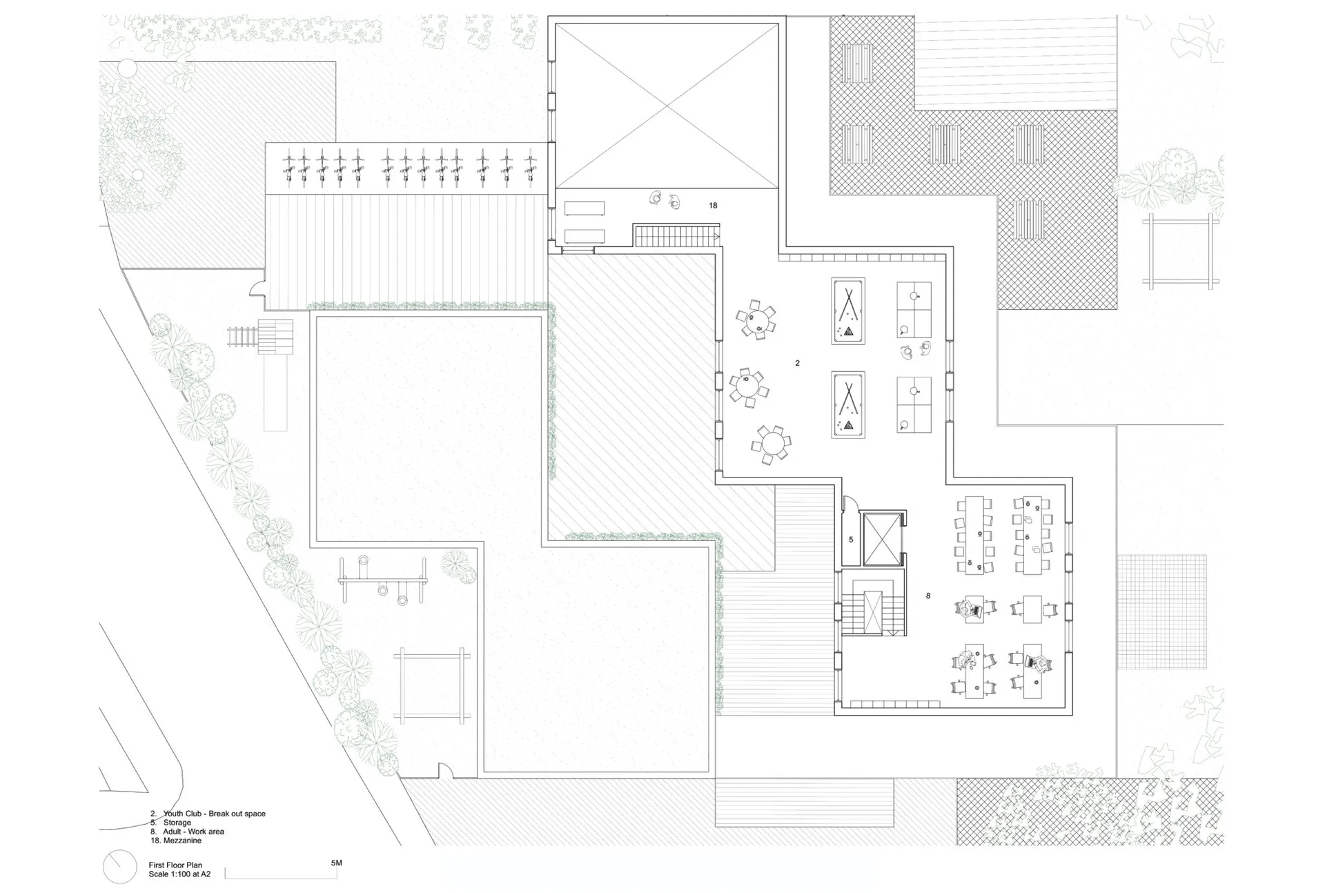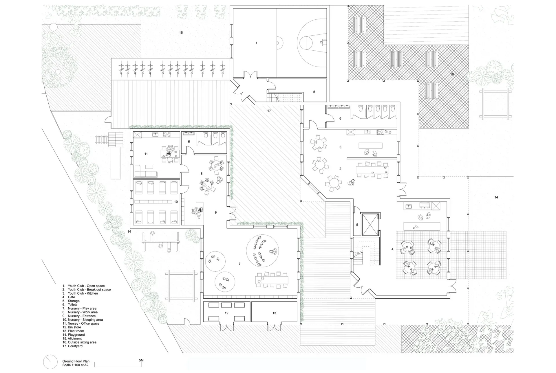The landscape of the site is redefined with different uses, there is an allotment on the North West of the site for adults and kids to interact with each other. There are two playgrounds, the one to the West of the building is a private playground area used by the nursery. The one on the East side is a public playground with a sitting area designed to be used by the local children and their parents. The proposal consists of two buildings housing multiple programs such as a nursery, spaces for the community, workspaces, youth club and a cafe. There are also multipurpose spaces that can be rented out for local community events.