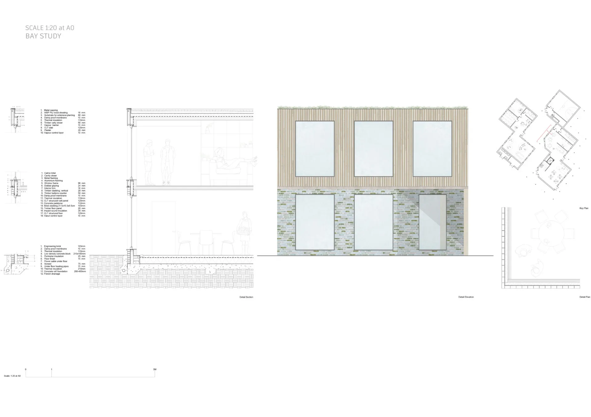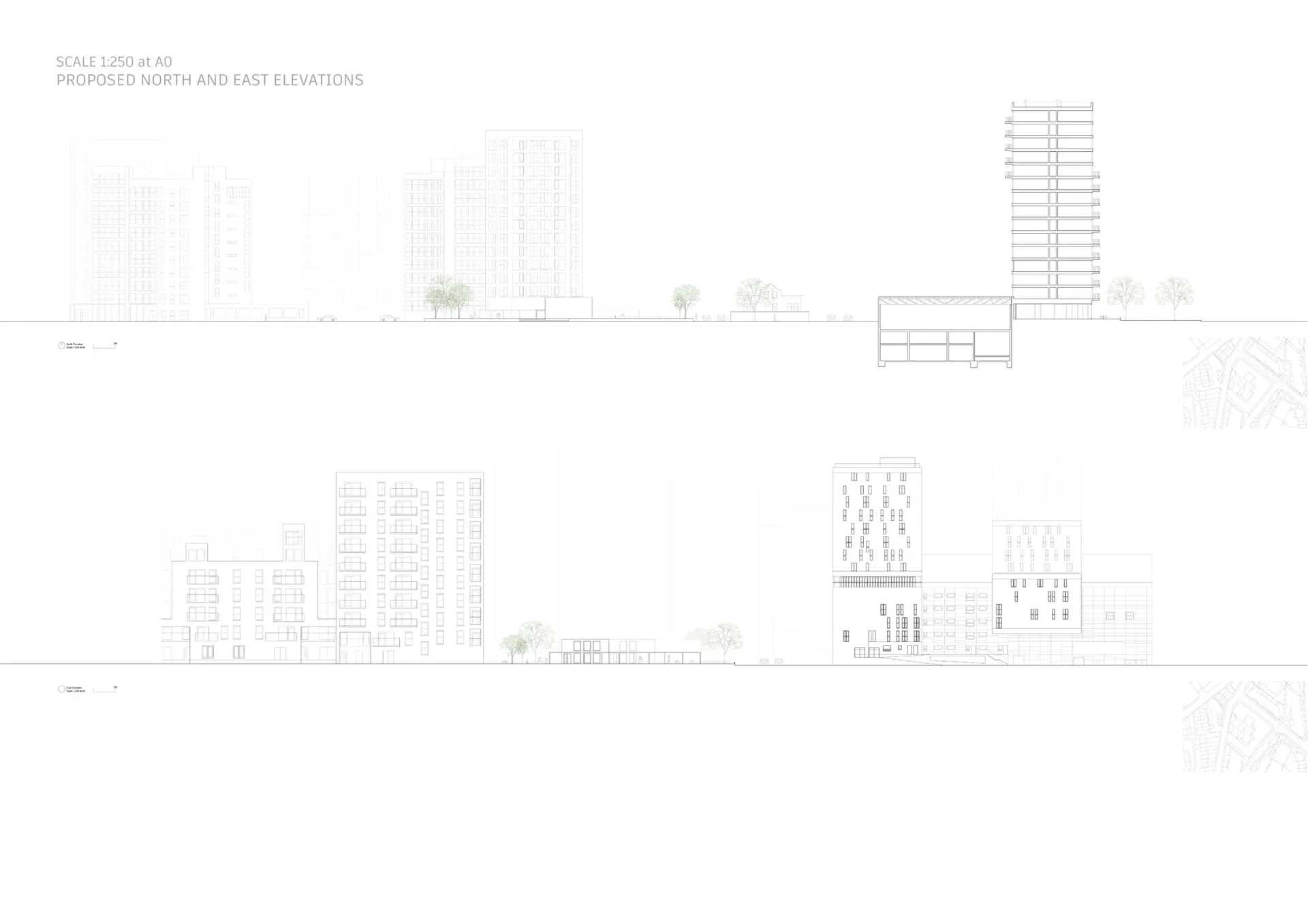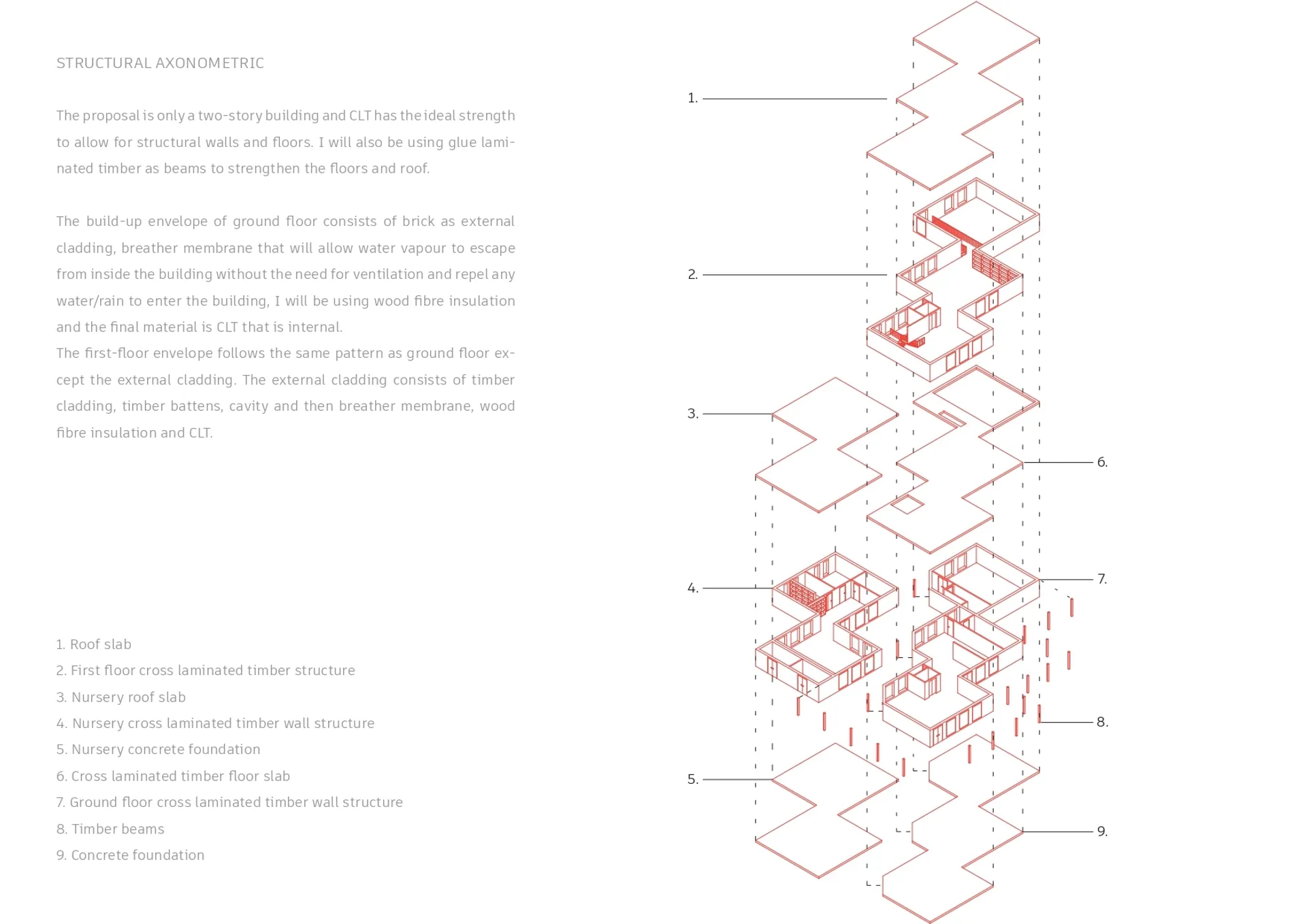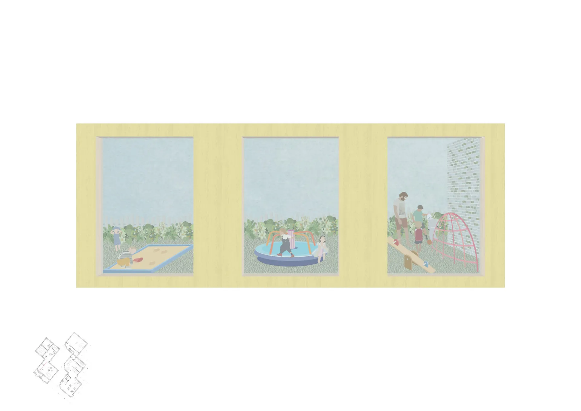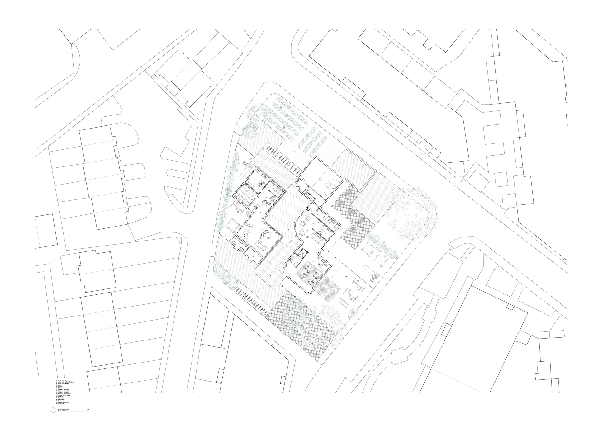 The landscape of the site is redefined with different uses, there is an allotment on the North West of the site for adults and kids to interact with each other. There are two playgrounds, the one to the West of the building is a private playground area used by the nursery. The one on the East side is a public playground with a sitting area designed to be used by the local children and their parents. The proposal consists of two buildings housing multiple programs such as a nursery, spaces for the community, workspaces, youth club and a cafe. There are also multipurpose spaces that can be rented out for local community events.