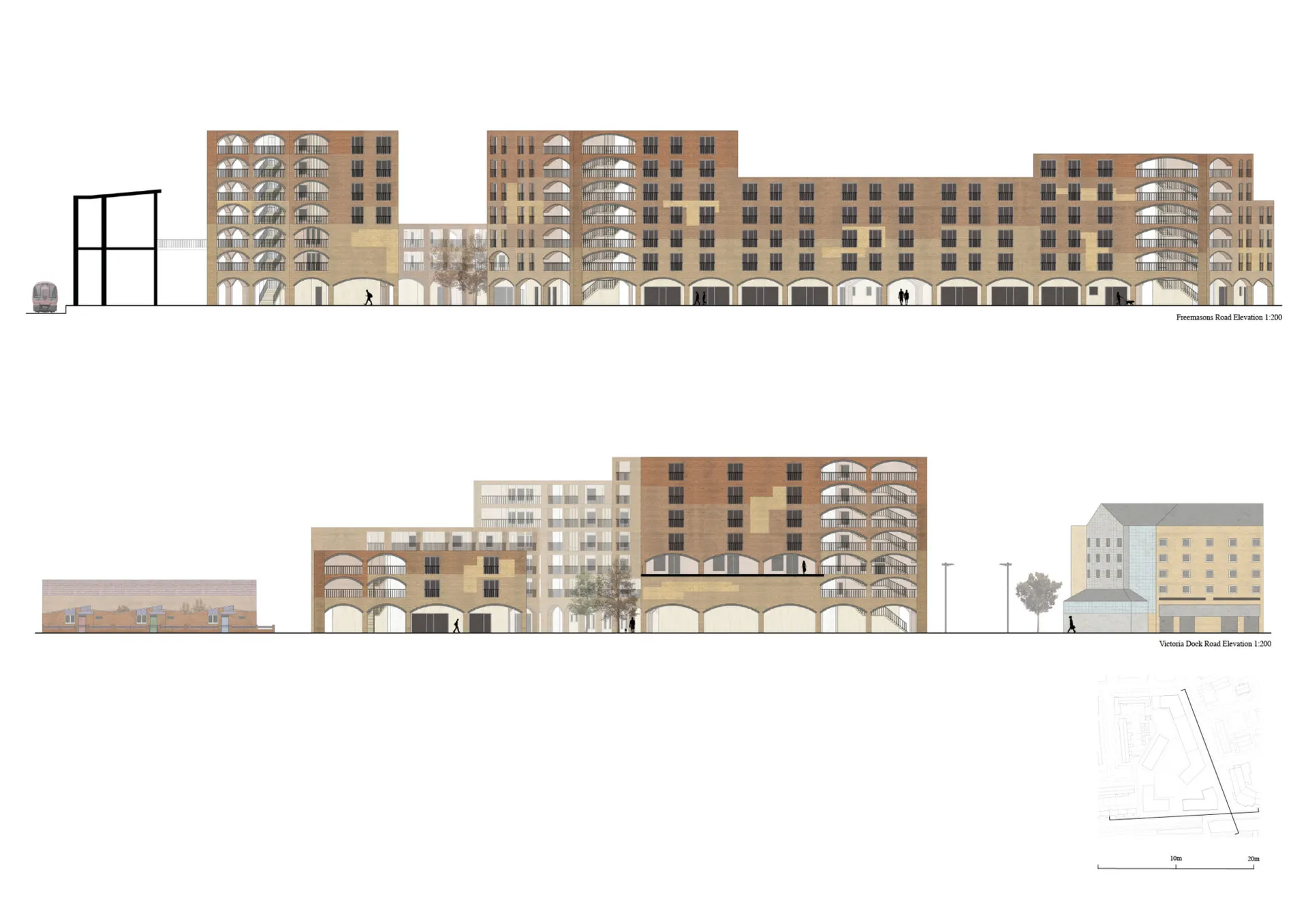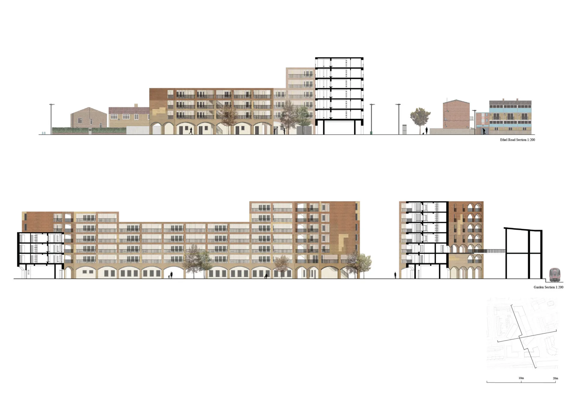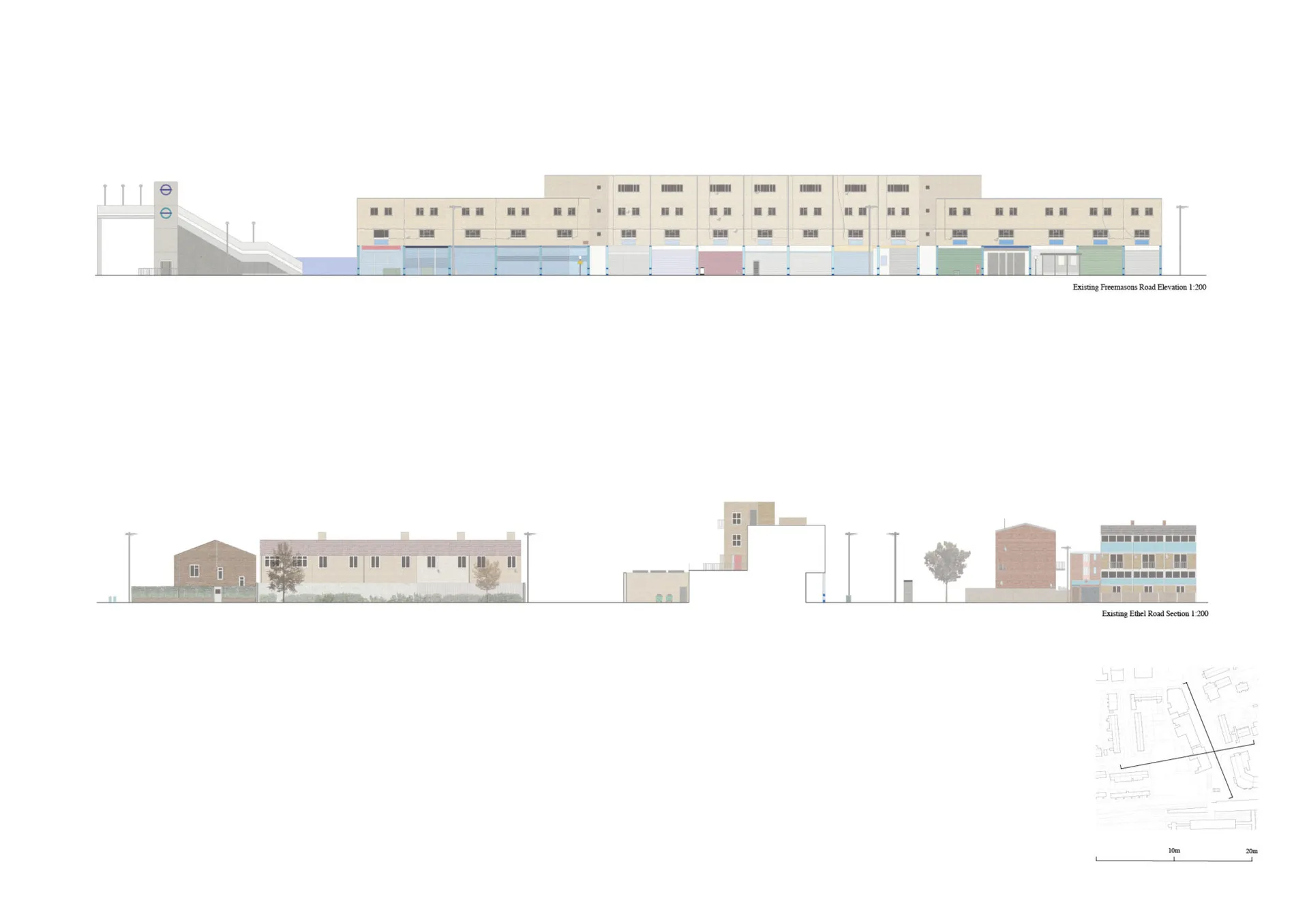 This housing proposal includes apartments ranging from one to three bed homes. The scheme also combines services in response to researching ‘PEACH’, People’s Empowerment Alliance for Custom House, a charity based in the location of the project, Custom House in Newham, East London. Since its creation in 2013, the charity has been working with the local community to create positive change regarding housing and the local economy. The proposed site has an existing building on it with services on the ground floor. Part of PEACH’s ambition is for the existing stores to maintain support as well as invite new services to create more employment opportunities. With that in mind, all the existing businesses as well as new services are included in the design.