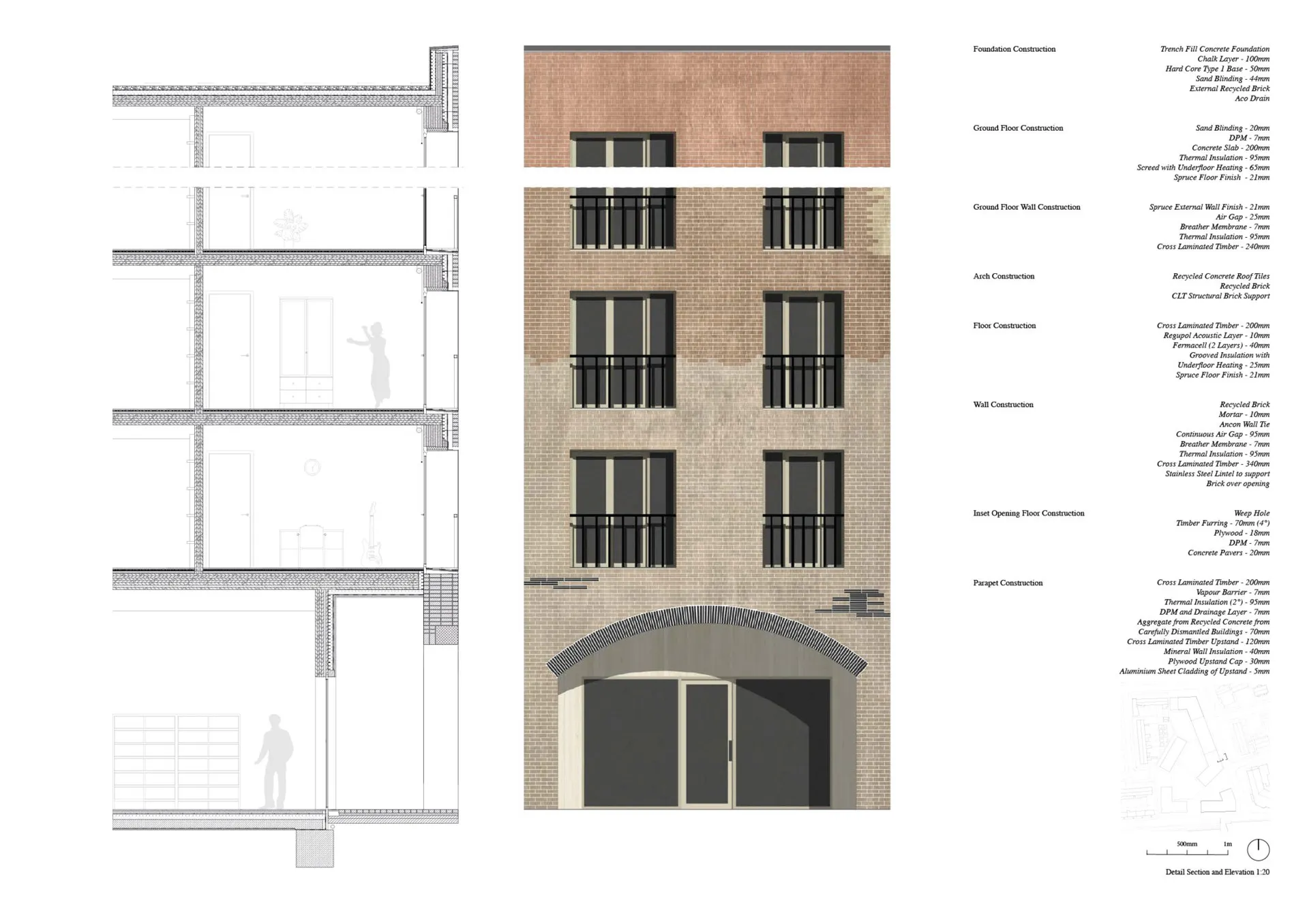 The design thesis addresses how architecture can achieve a more sustainable future by using recycled materials and prefabricated parts. This will reduce the production of waste created in the construction industry. In the UK, construction produces 50 per cent of the total waste a year and therefore, by aiming to infuse prefabricated parts and recycled materials, waste will decrease.