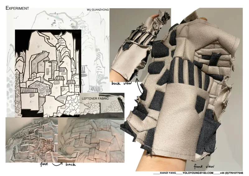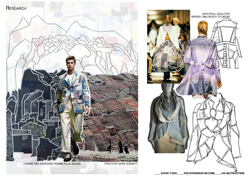 For my project, all the work focus on recycling. Similarly, the current wasteful linear textile system can be offset by improving the utilization of fabrics. I started from Boro which comes from Japan, and I explores its history and development. The project then goes on to patchwork in other countries as well as the related artworks. Feeds by my background in traditional Chinese painting, I use the techniques on sample establishment. Together, these three elements constitute the objectives of my research. I tend to extract structural features and details from the patchwork and do some draping to test the silhouette.