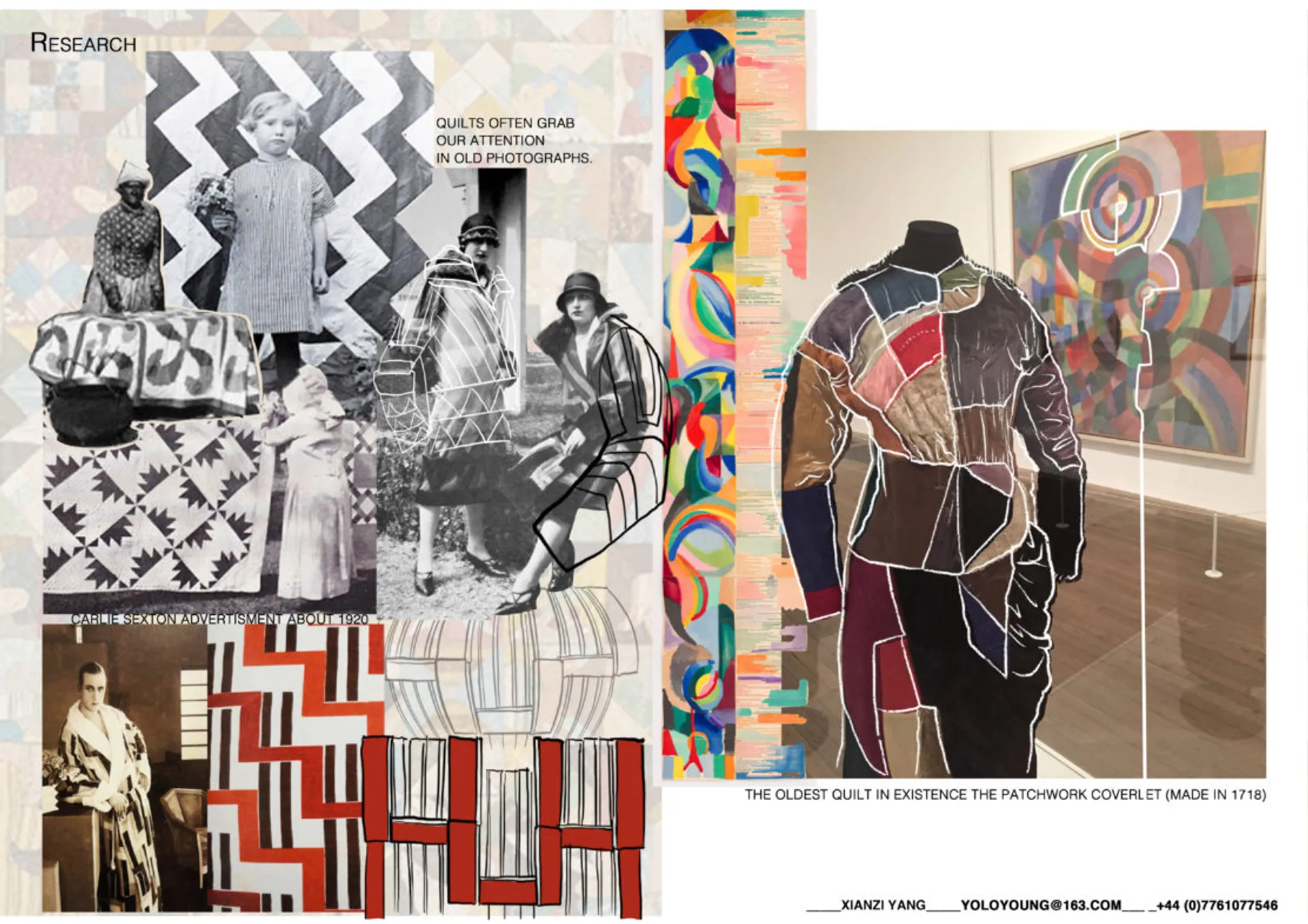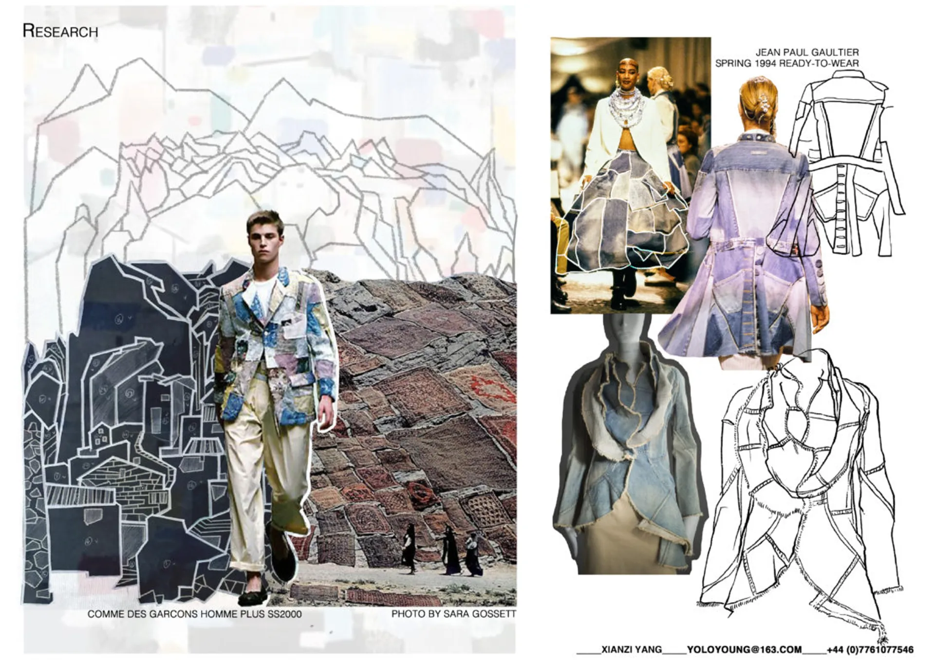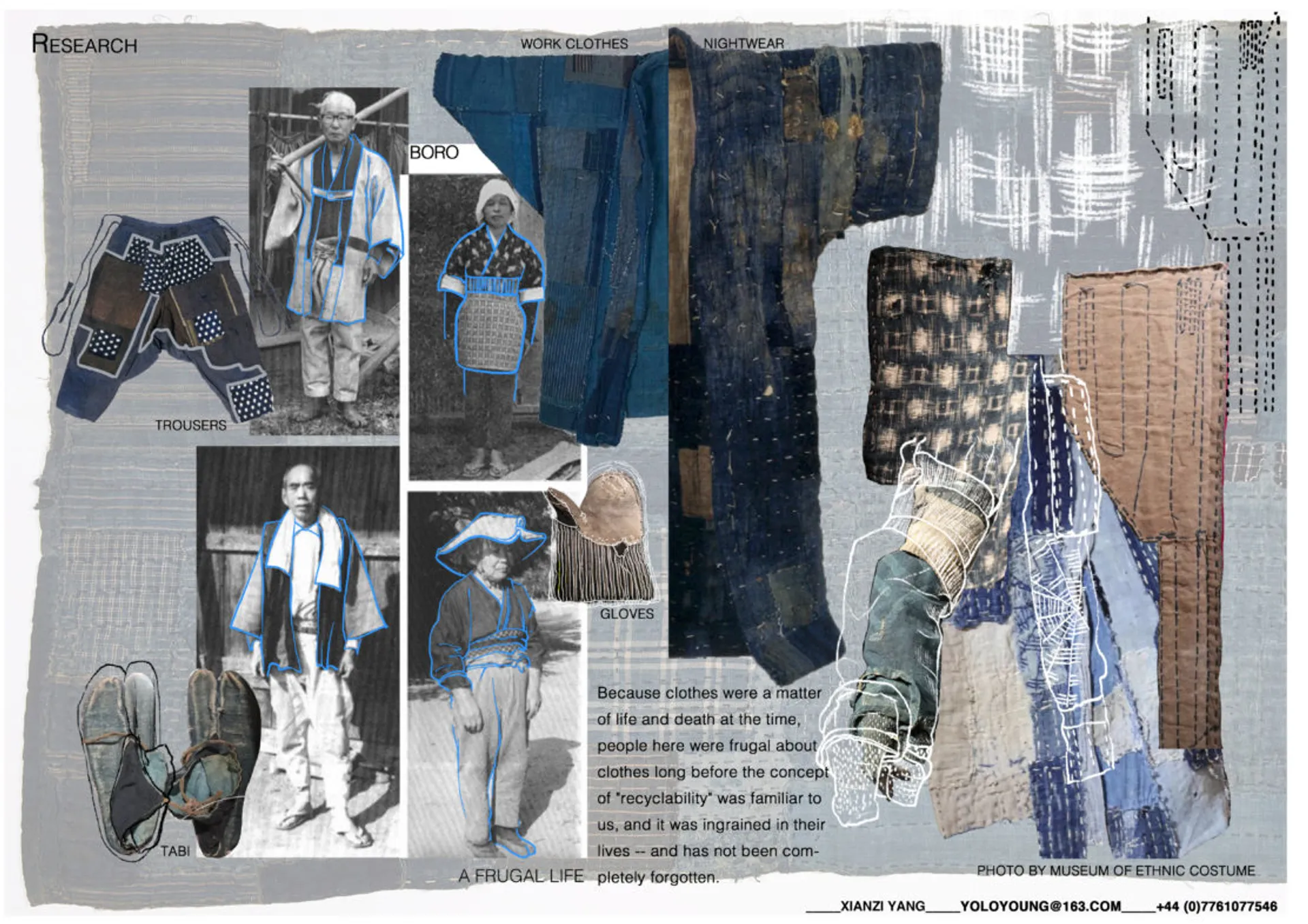 For my project, all the work focus on recycling. Similarly, the current wasteful linear textile system can be offset by improving the utilization of fabrics. I started from Boro which comes from Japan, and I explores its history and development. The project then goes on to patchwork in other countries as well as the related artworks. Feeds by my background in traditional Chinese painting, I use the techniques on sample establishment. Together, these three elements constitute the objectives of my research. I tend to extract structural features and details from the patchwork and do some draping to test the silhouette.