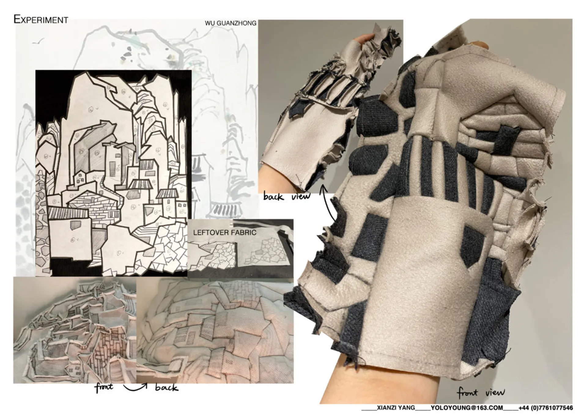 My theme is inspired by my grandmother. My grandmother was a tailor in early years. She always patched torn garments immediately. the situation of fashion waste is very serious due to the rapid development of fast fashion. Therefore, I focus on the fabric waste issue during the process of making the garment. The cloth, which is mostly made of polyester (plastic) and takes 200 years to decompose, is abandoned on the floor after the cloth has been made into dresses, this is the main reason why I wanted to pick up all these fragments of fabric. It can be fully utilized by changing size or pattern when cut the fabric in order to reduce the waste level to the largest extent.