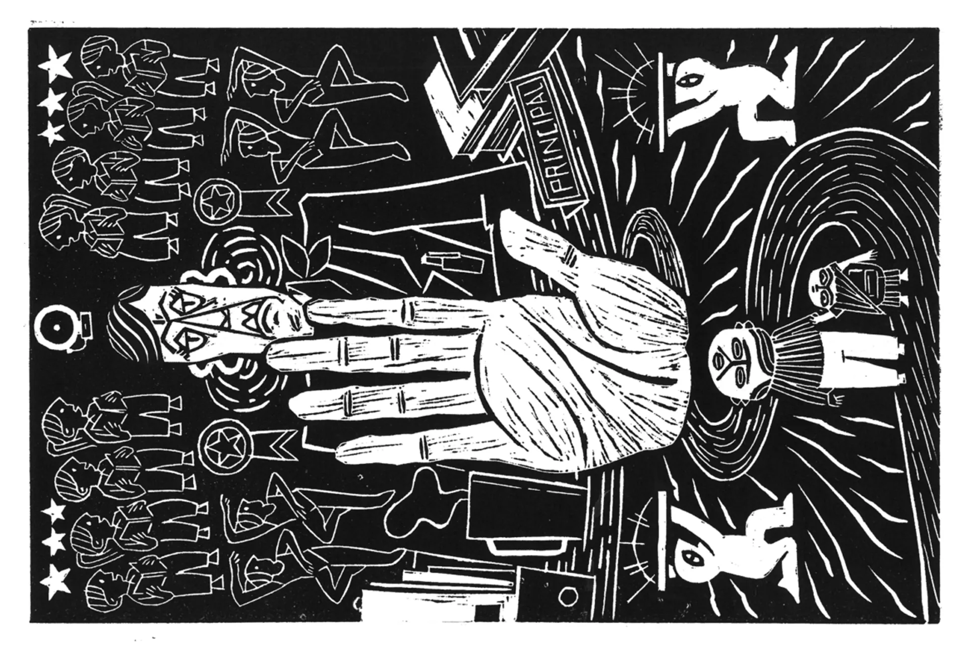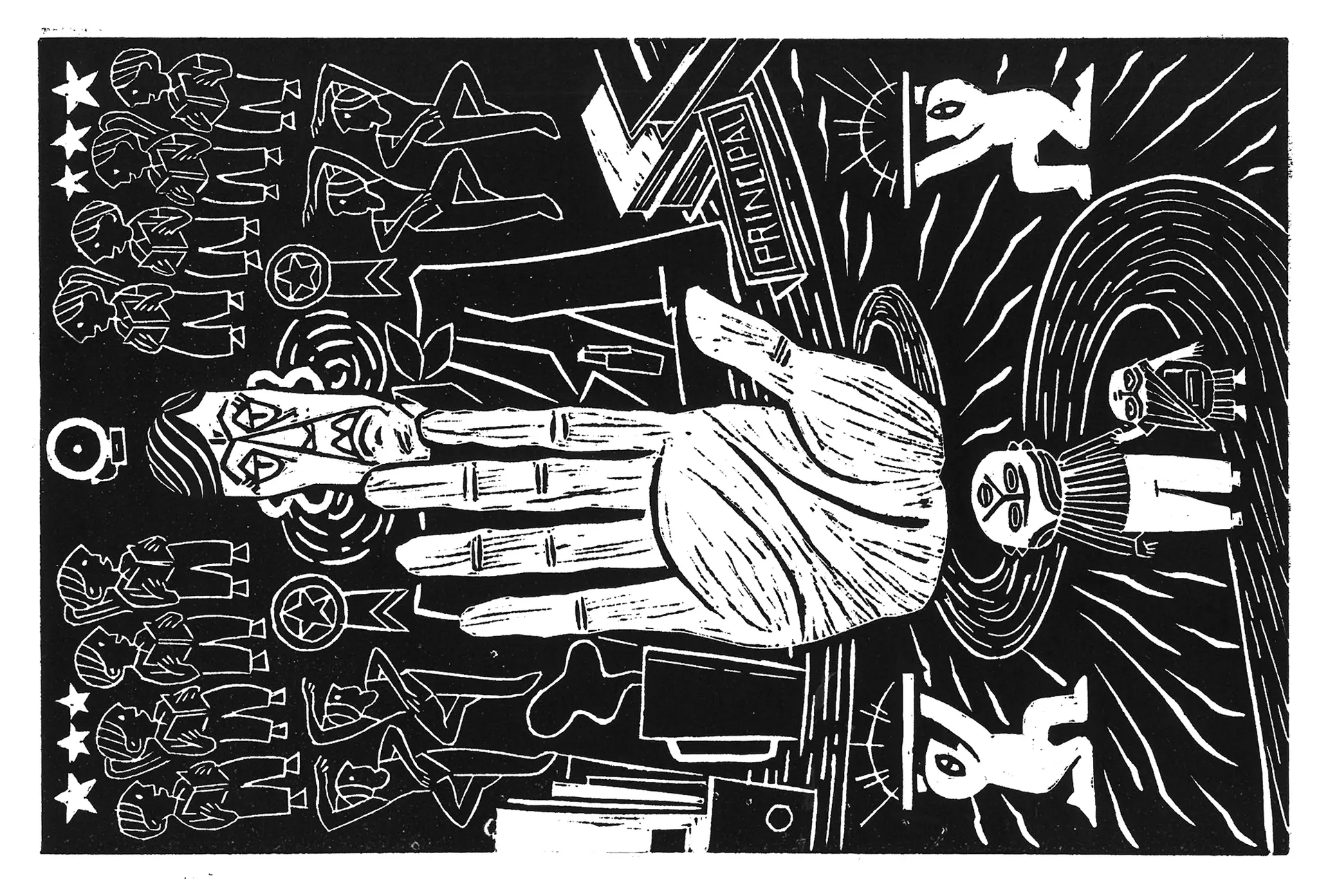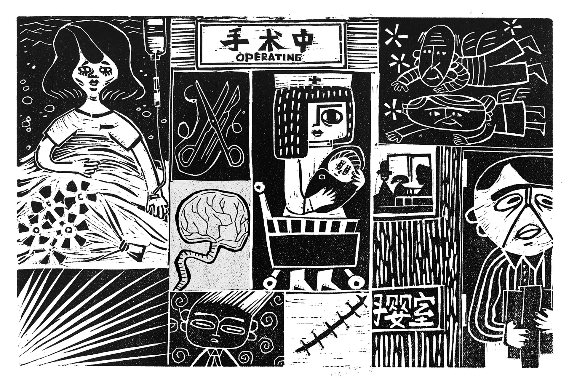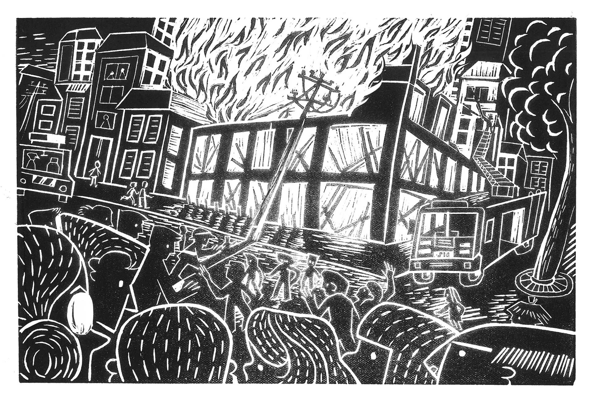 Itchy 9 is a wordless story composed of 10 lino prints. A series of images of lives in the big city is on display, showing people from different backgrounds and identities in China today: migrant workers, overworked men, A pregnant woman who smokes secretly in the toilets of shopping mall; Husbands who cheating on men, hospital nurses with expressionless faces, children unable to receive an education due to “Hukou” problems, Flattering young couples at a social dinner. It opens with people wandering in a bustling city covering their ears because of a noisy construction site and closes with the figure of the protagonists in front of a chaotic fire scene hiding their secrets.