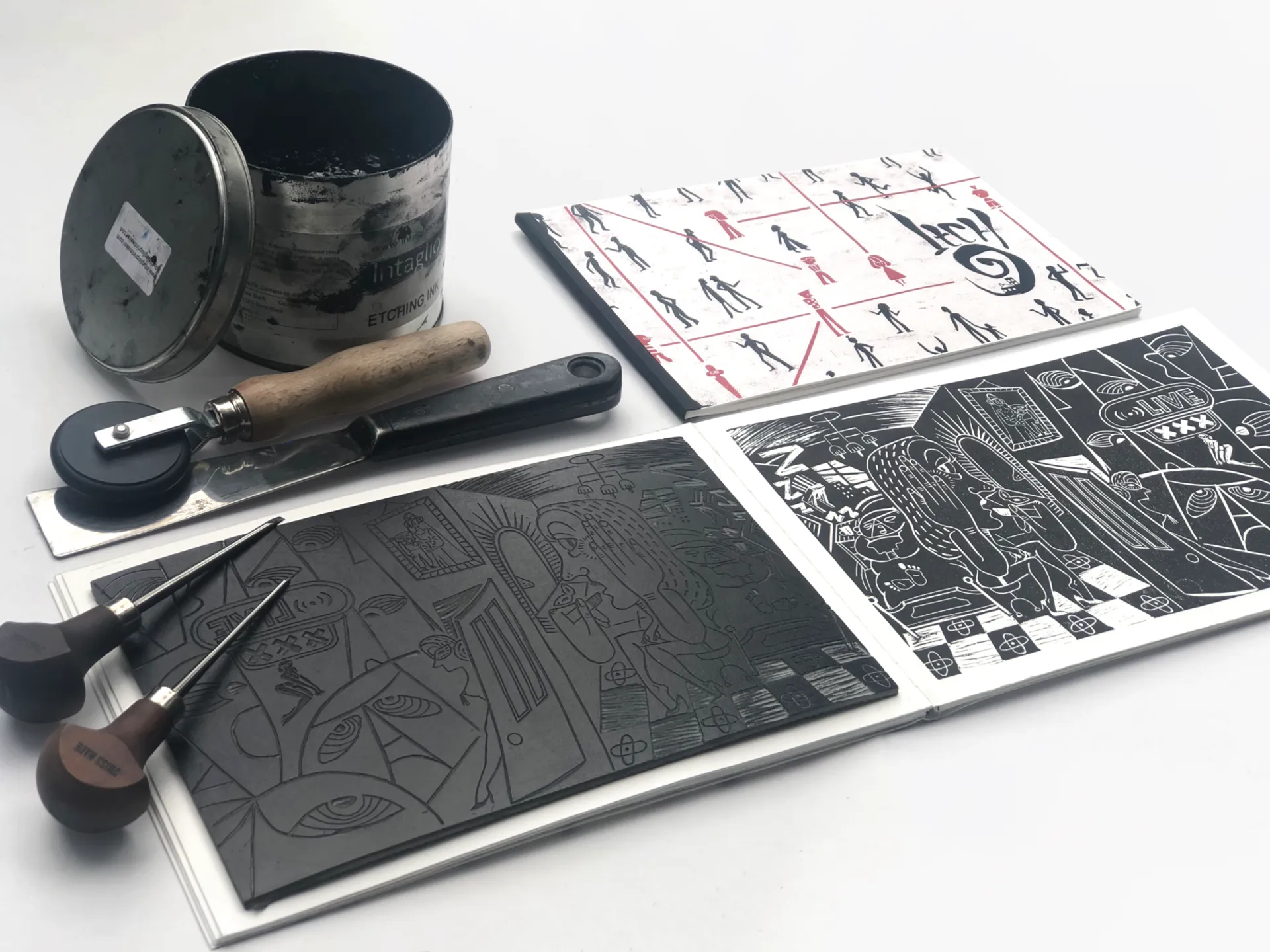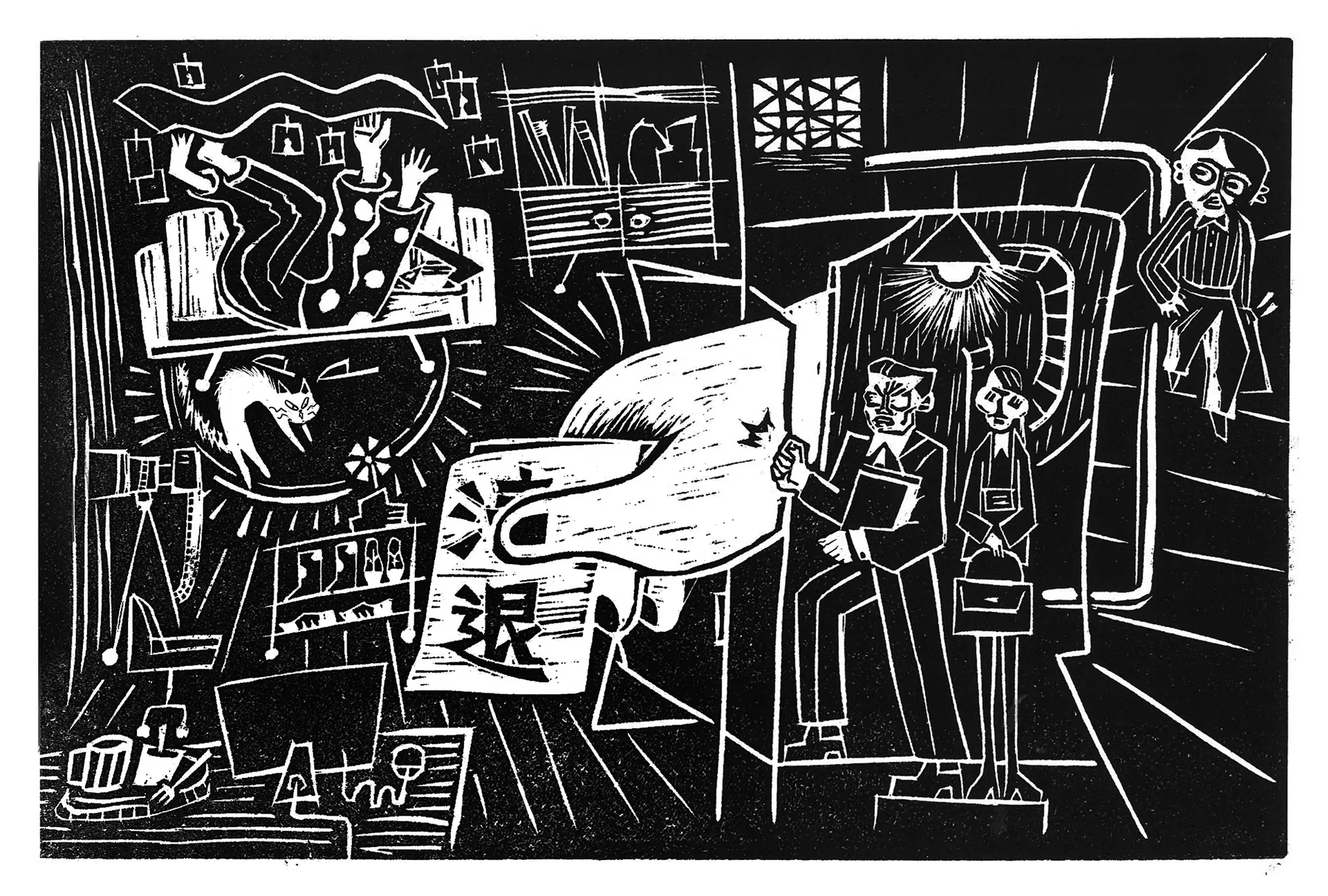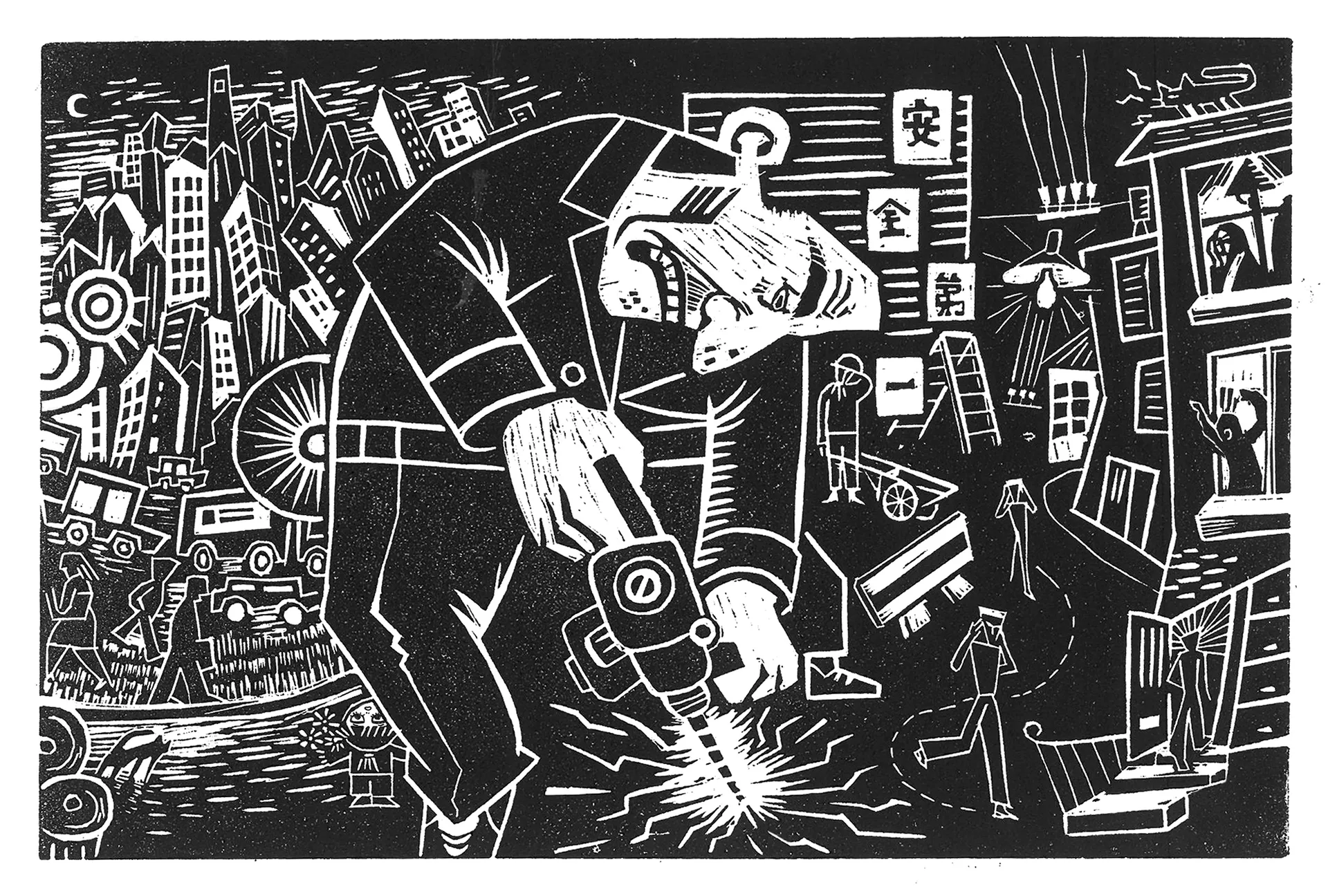 Itchy 9 is a wordless story composed of 10 lino prints. A series of images of lives in the big city is on display, showing people from different backgrounds and identities in China today.