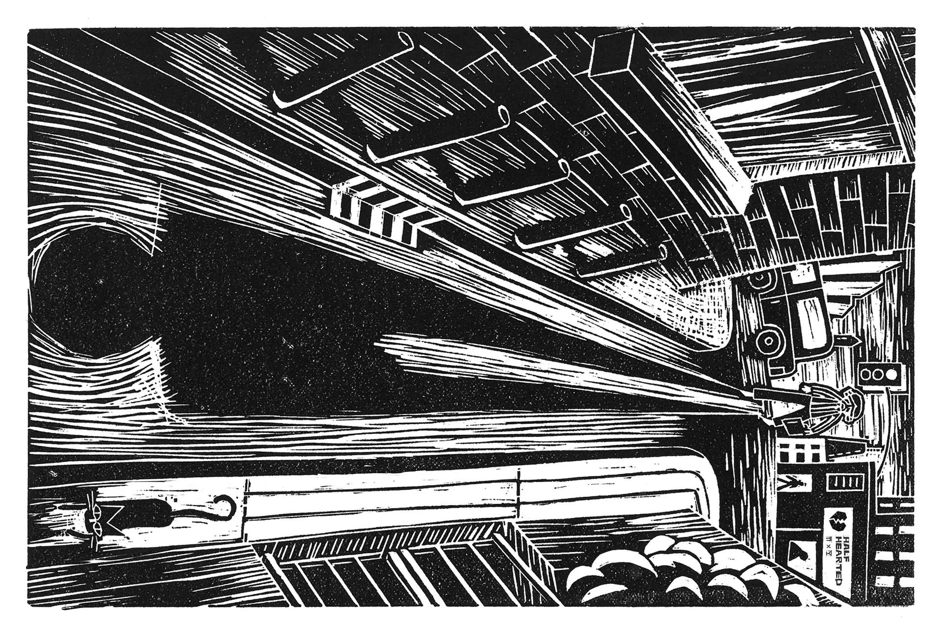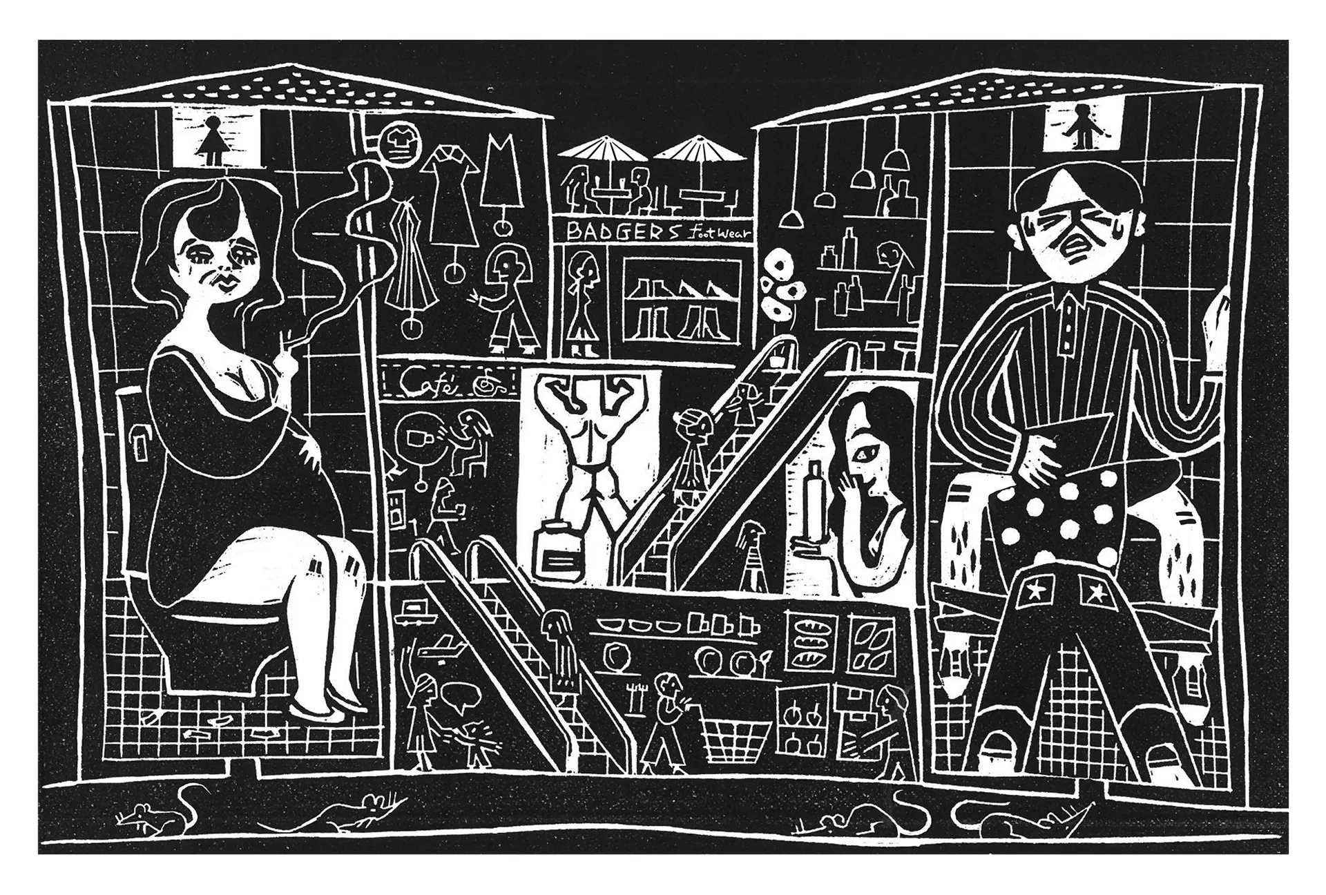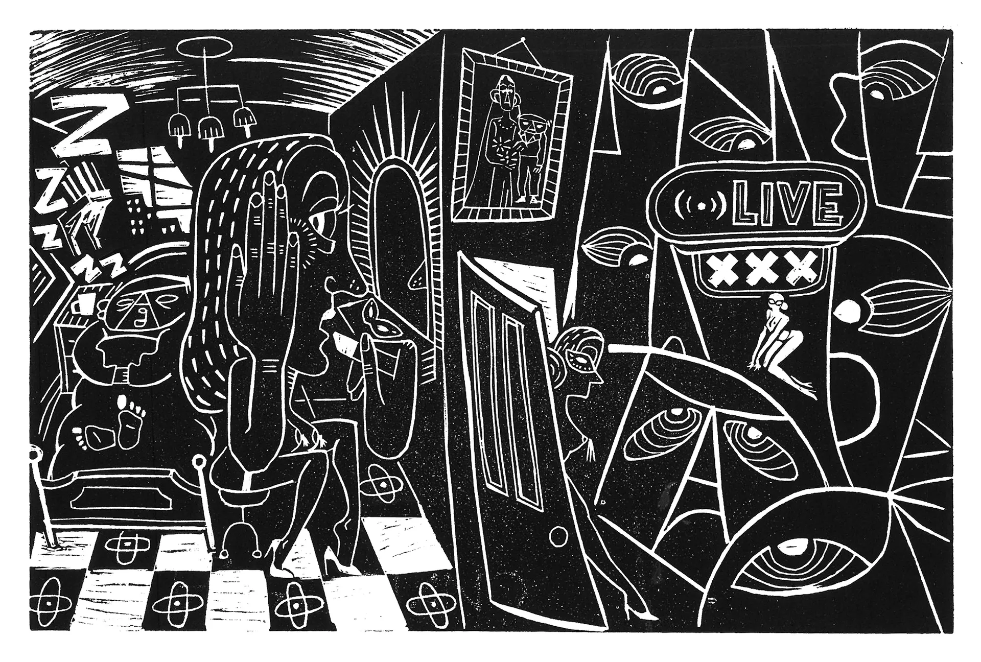 Itchy 9 is a wordless story composed of 10 lino prints. A series of images of lives in the big city is on display, showing people from different backgrounds and identities in China today.