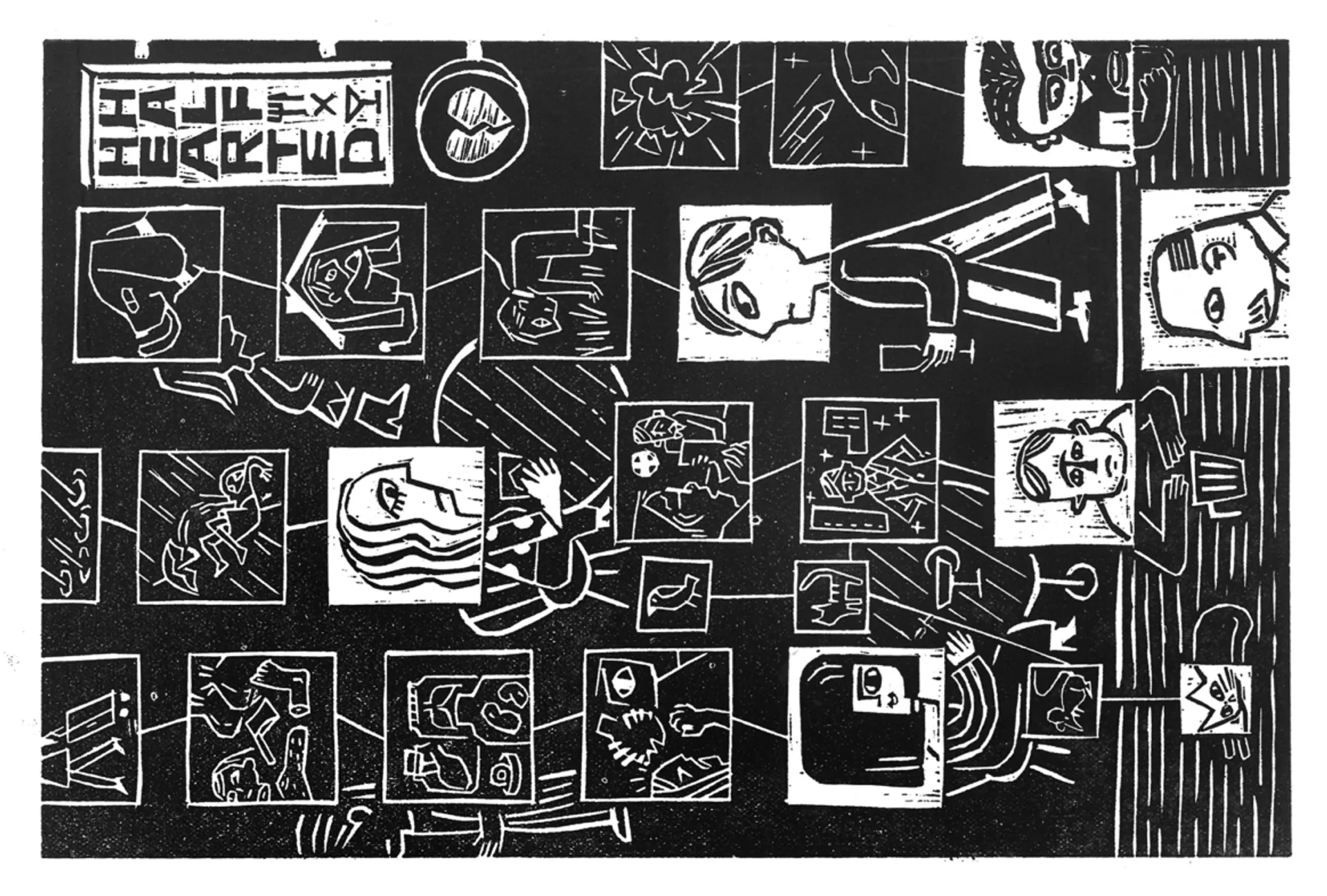 The visuals bear a strong influence of German expressionism, combined with the rough and strong visual style of lino printing to express the conflict and anxiety in society and my opinion and criticism of social phenomena.