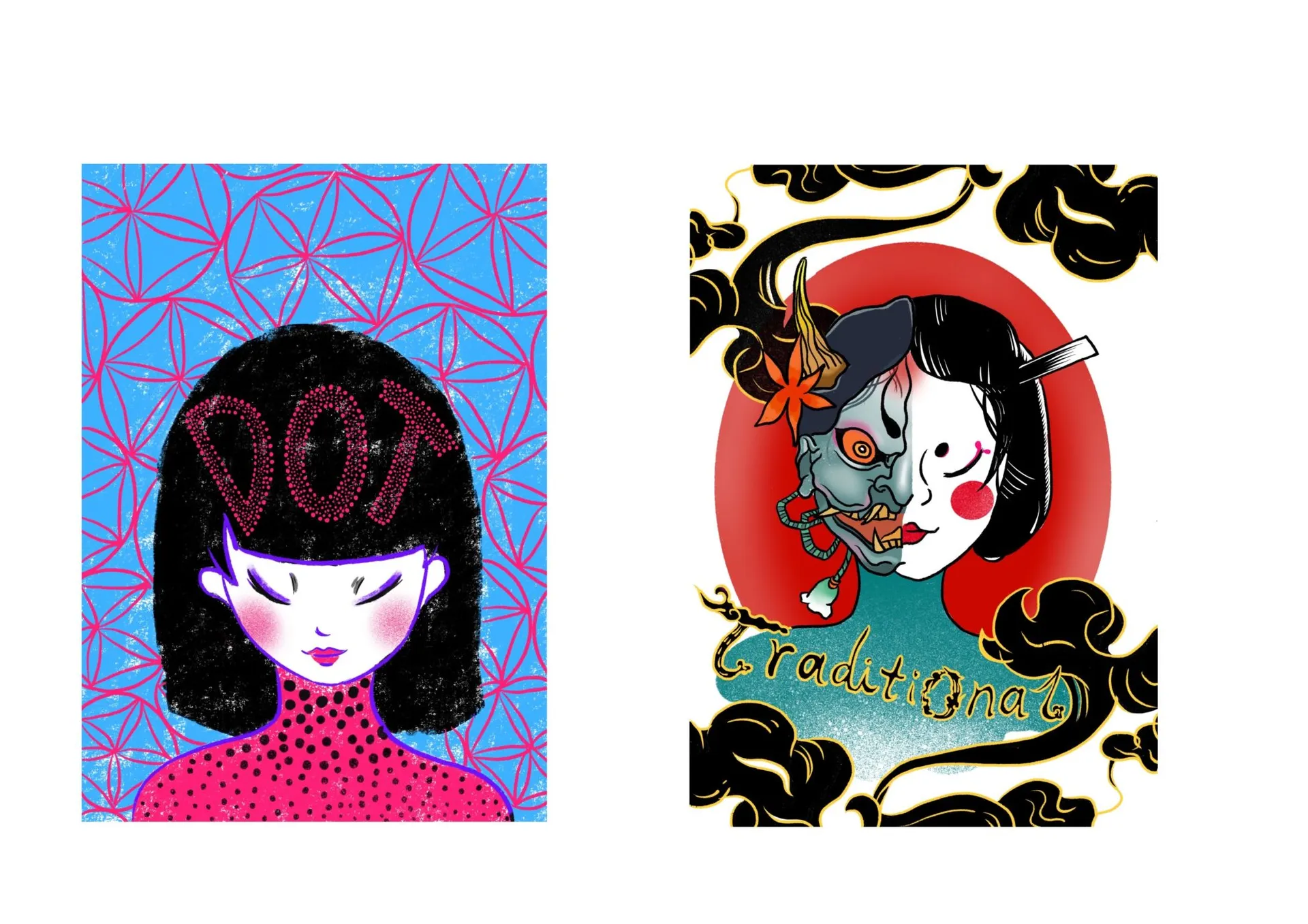 Hi, I’m from China and I was a college student before I started this course. As an illustrator I’m interested in social hotpots and niche cultures, which is why I’m exploring subcultures like drag queen. tattoos and social topics like surrogacy.I often combine hand drawing and computer drawing in my creation, and try to collage these interesting ways. I hope to use simple images to express the information I want to convey, just like the information and image records of primitive people.But i also like to try new ways of printing, like riso. I like the visual clash of strong colors.That’s why I tried to use less color to make the image look simple but effective.