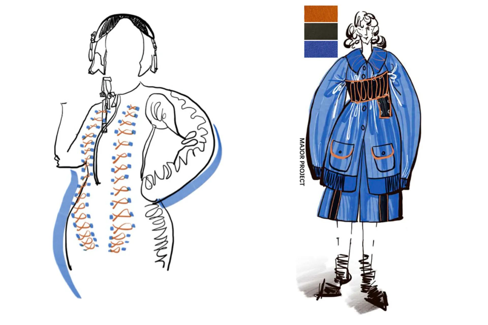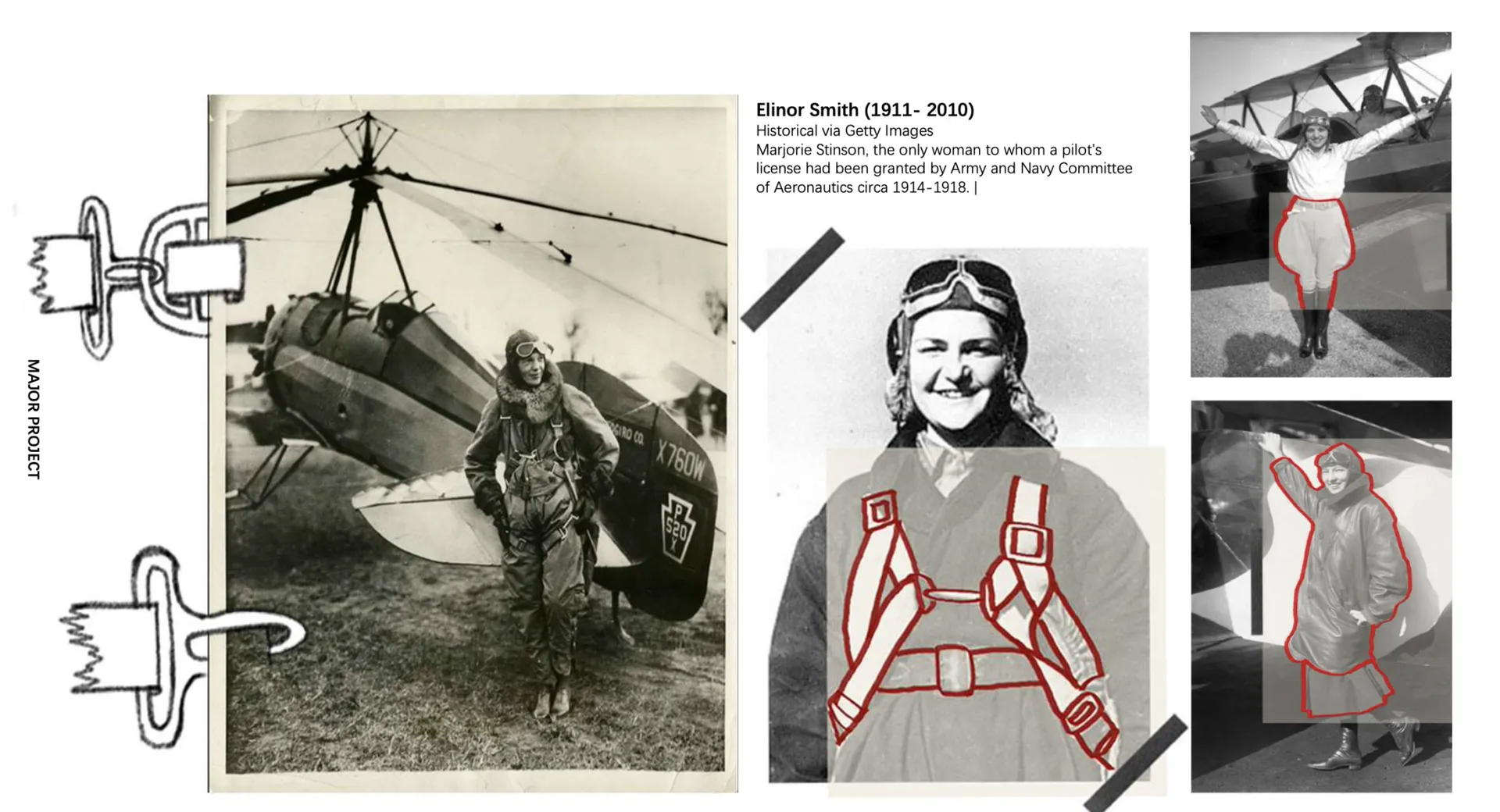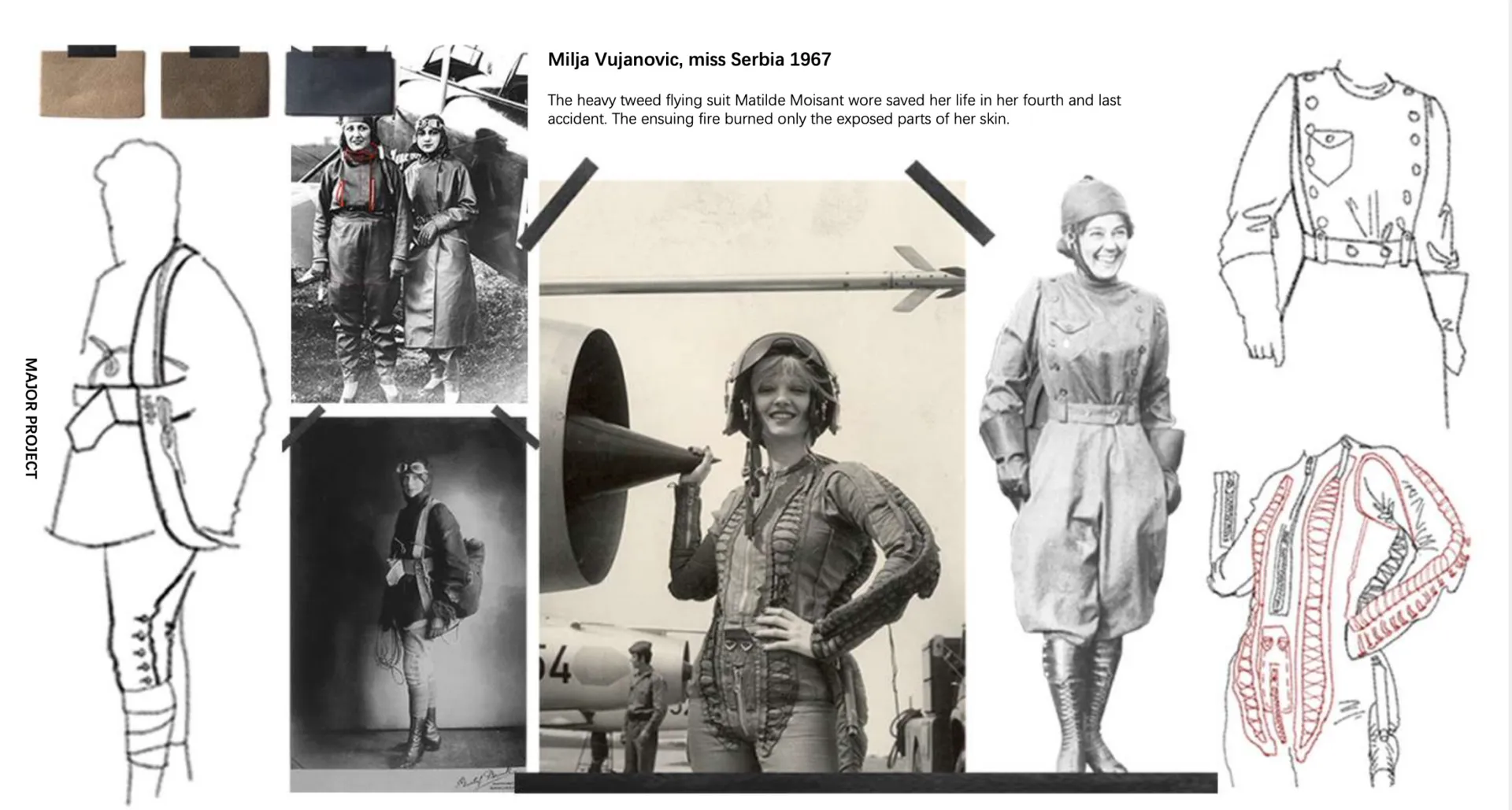 My design details and structure are mainly developed from the dress of female pilots when working in the early 20th century. In the history of any country, the profession of pilots is dominated by men, so in the early development of the career of female pilots, there is no flight clothing specially made for women on the market. It is my main design point to make the original loose silhouette fit through special details. The inspiration was from an interview with Amelia Earhart, she mentioned that she had to wear unsuitable clothes at work because she couldn’t buy suitable flight suits, which has been confirmed in many old photos of female pilots.