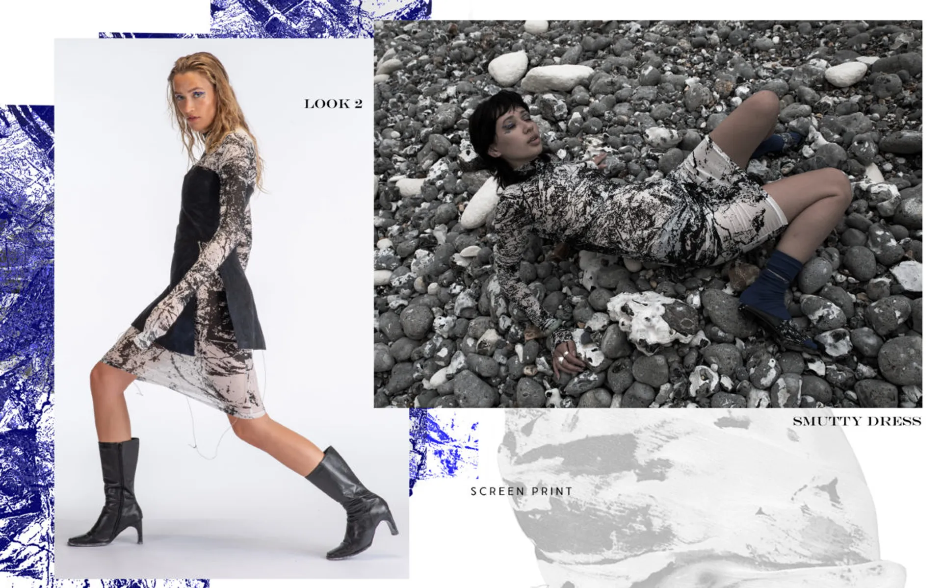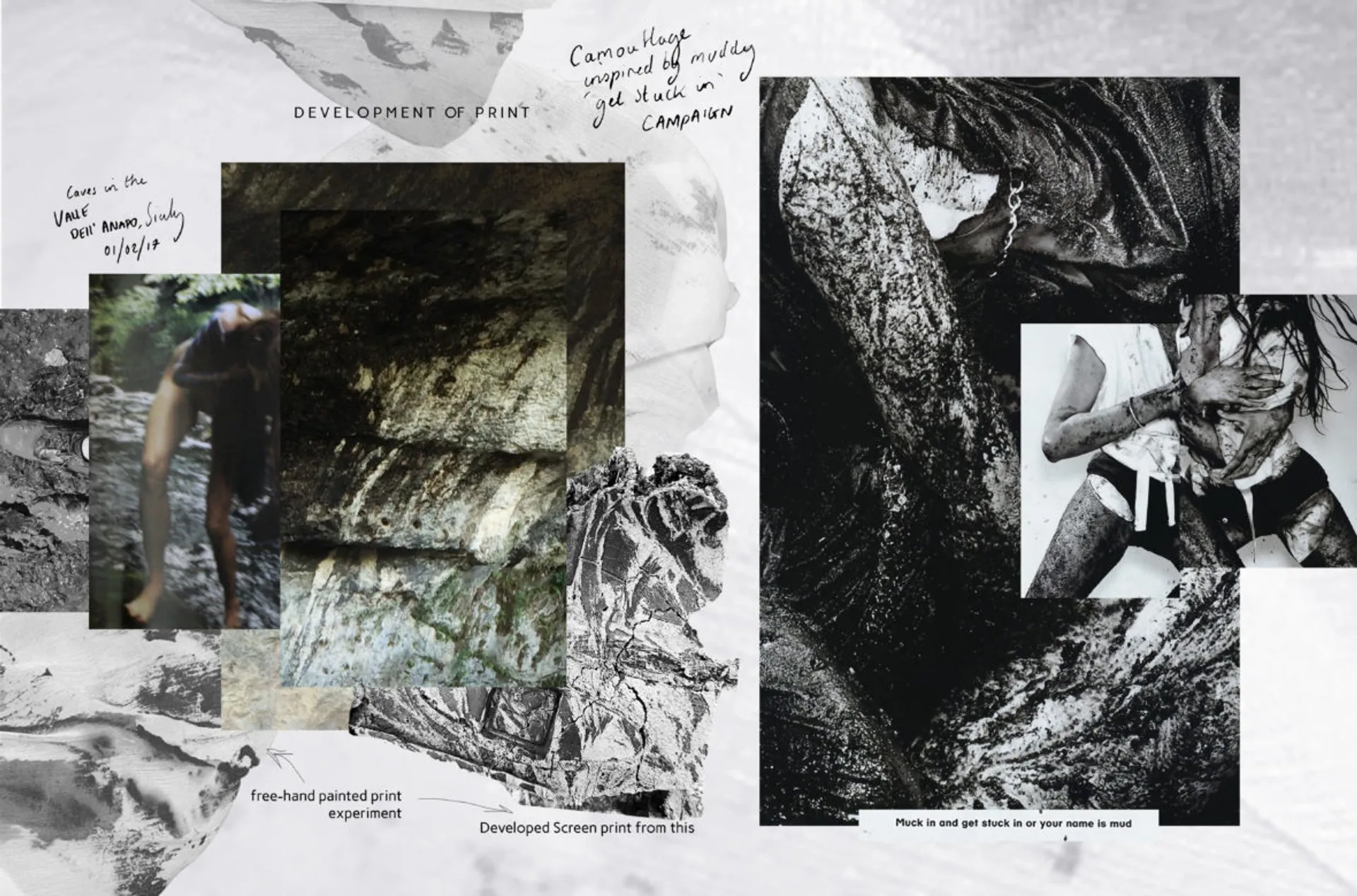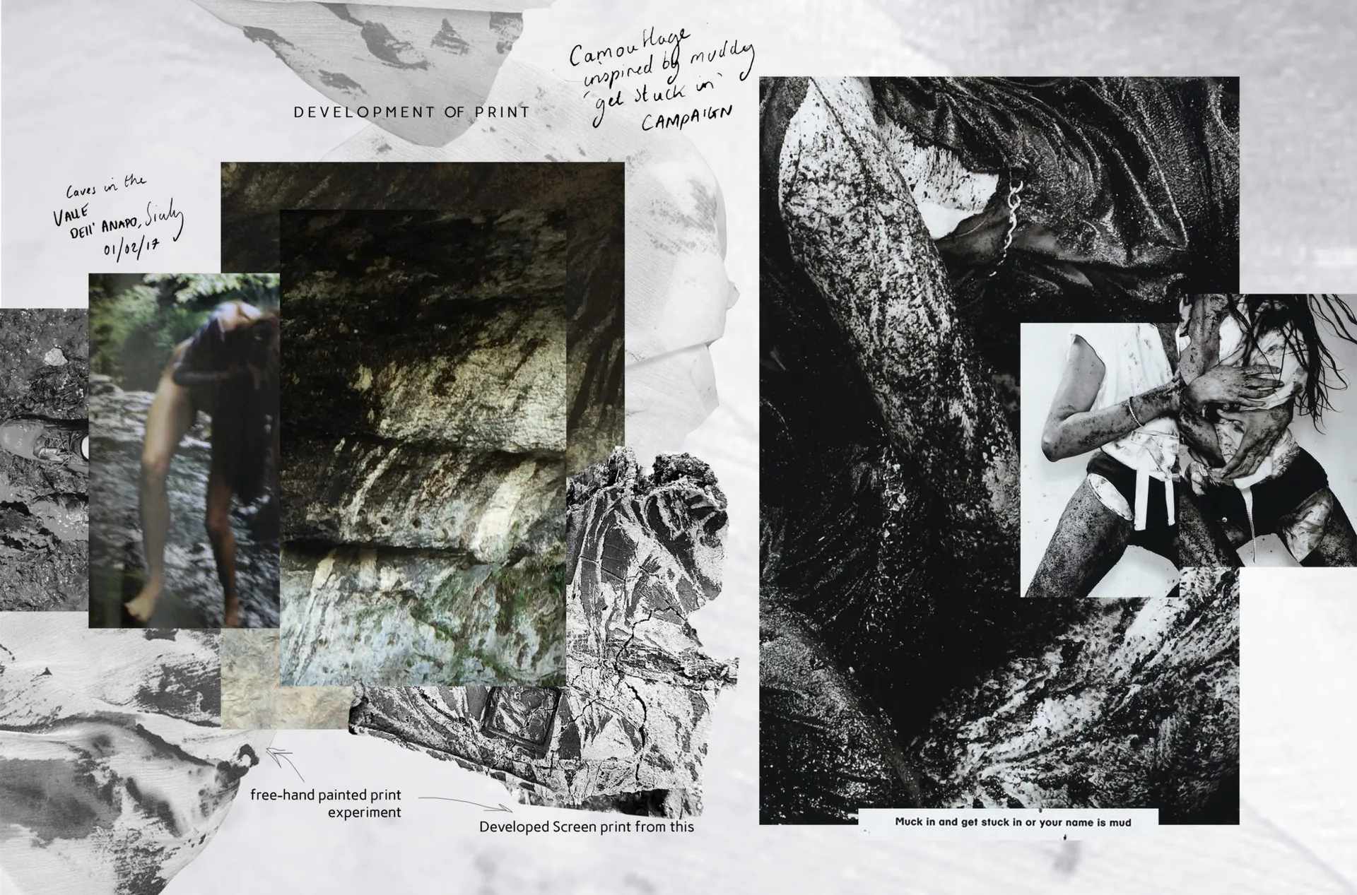 The adaptive nature of garments worn when people are ‘adventuring’ informed silhouettes with slits up to the waist for mobility, prints of camouflage to match dirty terrain and metal components for durability.