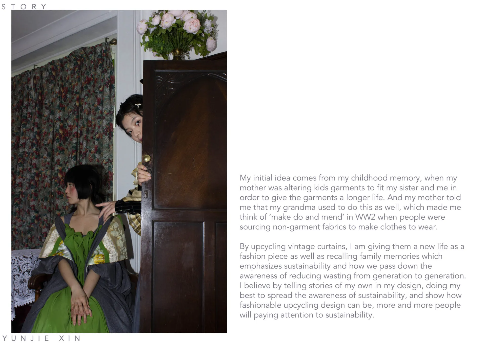 By upcycling vintage curtains, I am giving them a new life as a fashion piece as well as recalling family memories which emphasizes sustainability and how we pass down the awareness of reducing wasting from generation to generation. I believe by telling stories of my own in my design, doing my best to spread the awareness of sustainability, and show how fashionable upcycling design can be, more and more people will paying attention to sustainability.