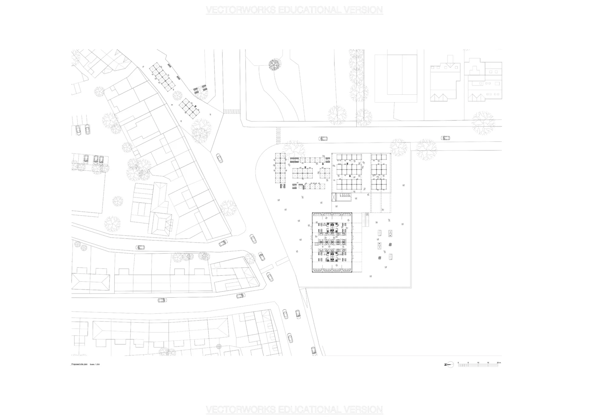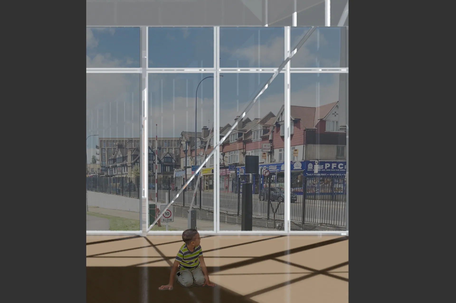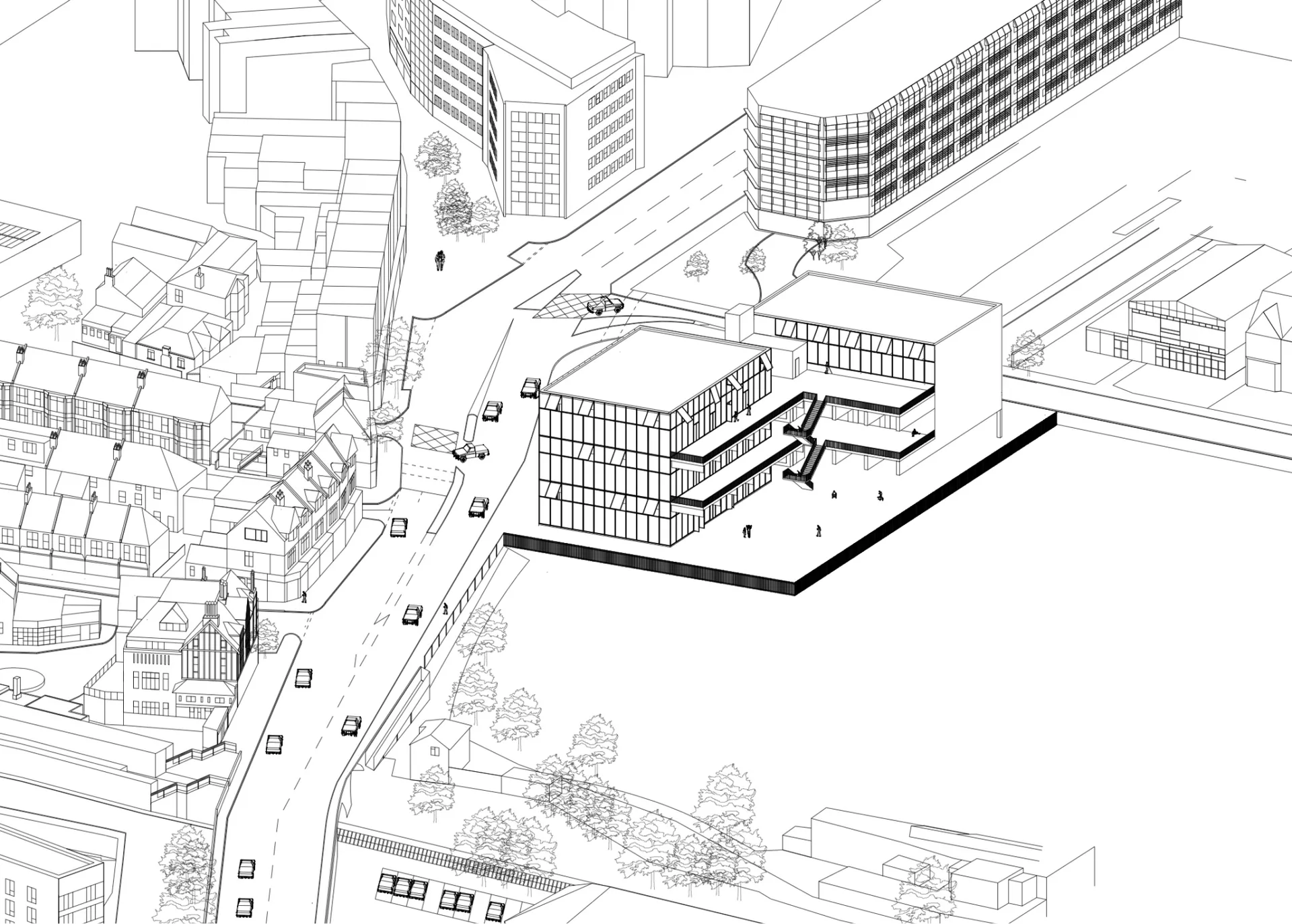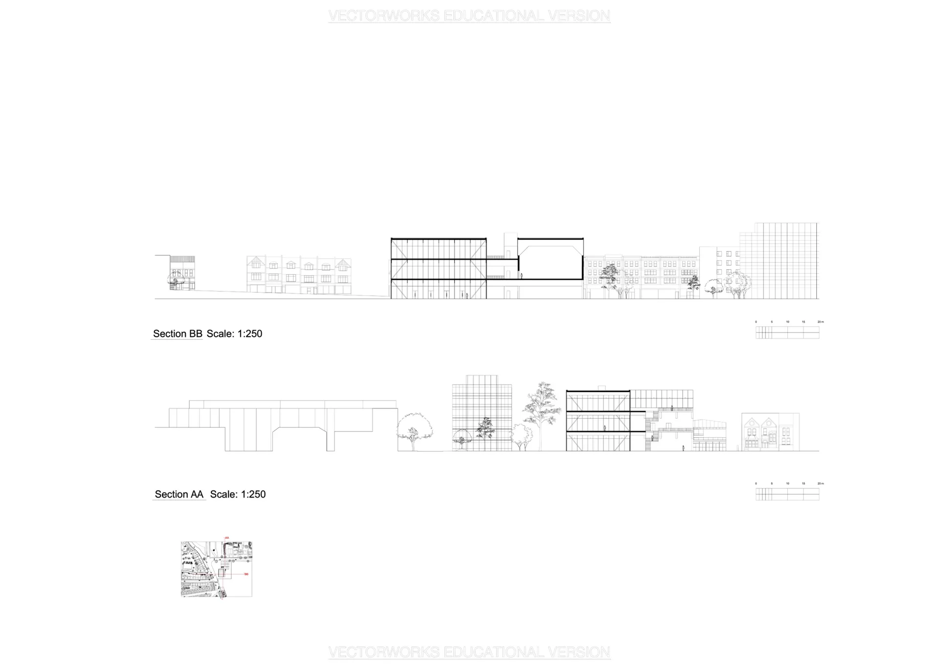 My project is located in Catford in Lewisham on a corner site between a busy market street and the sports field of a private school. Drawing my inspiration from the Shibaura office building by Kazuyo Sejima my project is composed of two similar volumes: one solid and one transparent. I also drew inspiration from the site’s division of solid and transparency in the desity of buildings. The volumes are both 20m x 30m and 20m high. The transparent volume is made of glass and steel and the solid volume of timber. They are connected by a metal balcony structure that provides circulation and a view over the sports field.