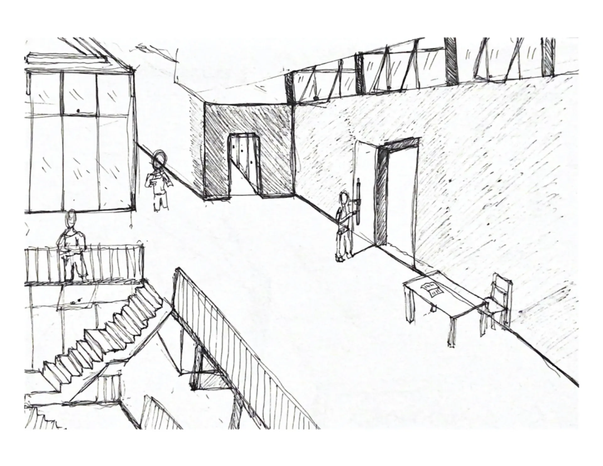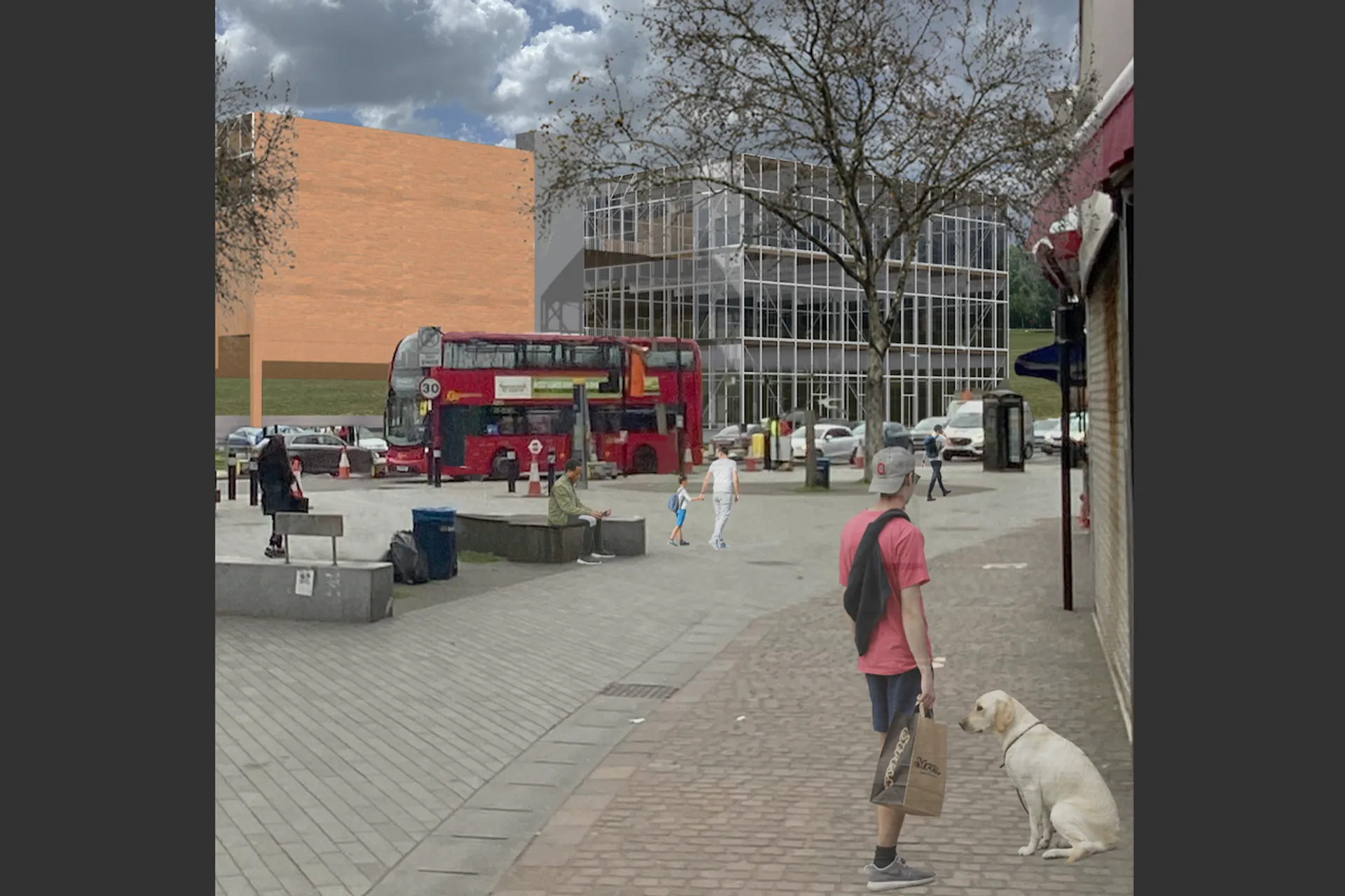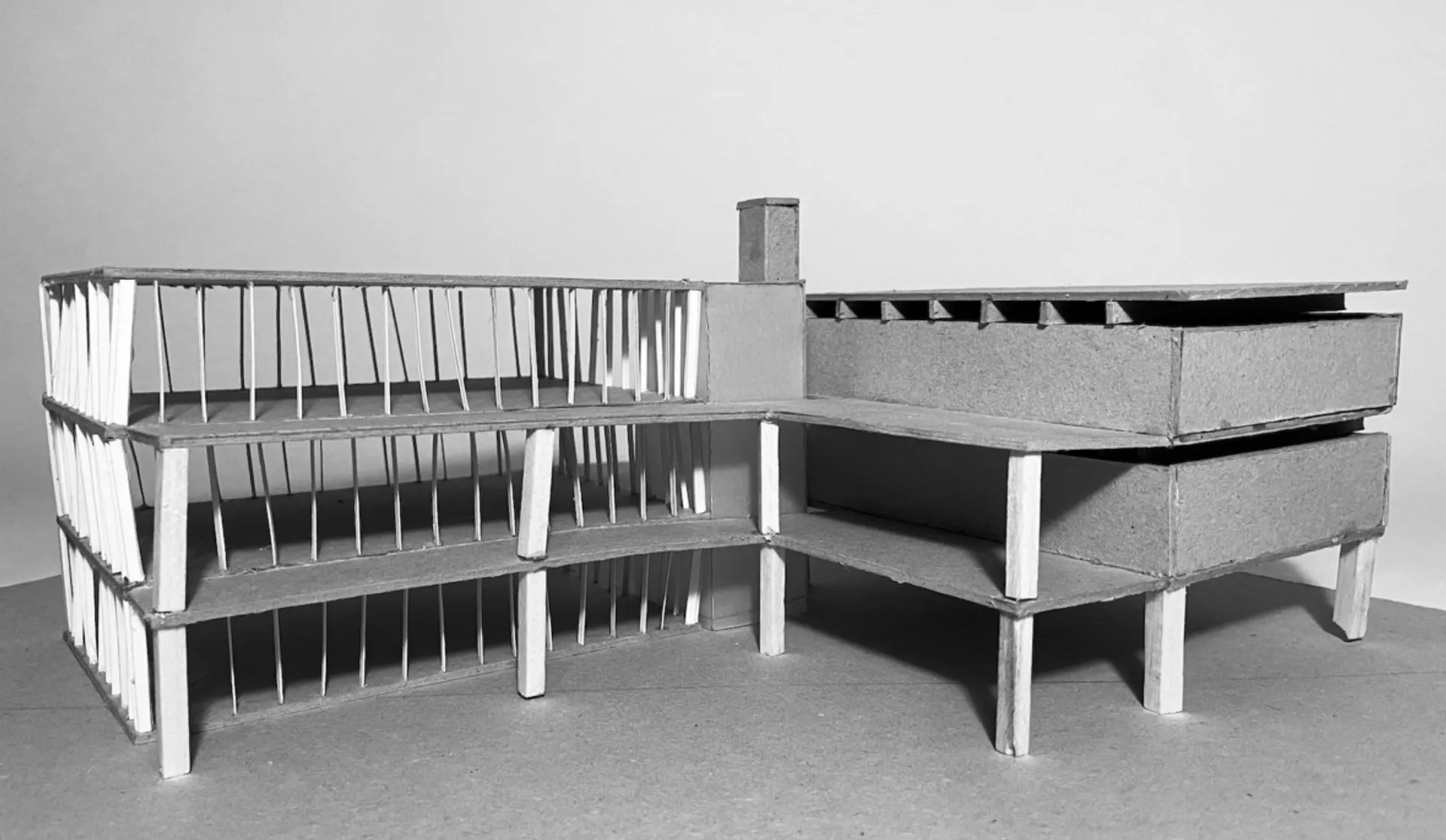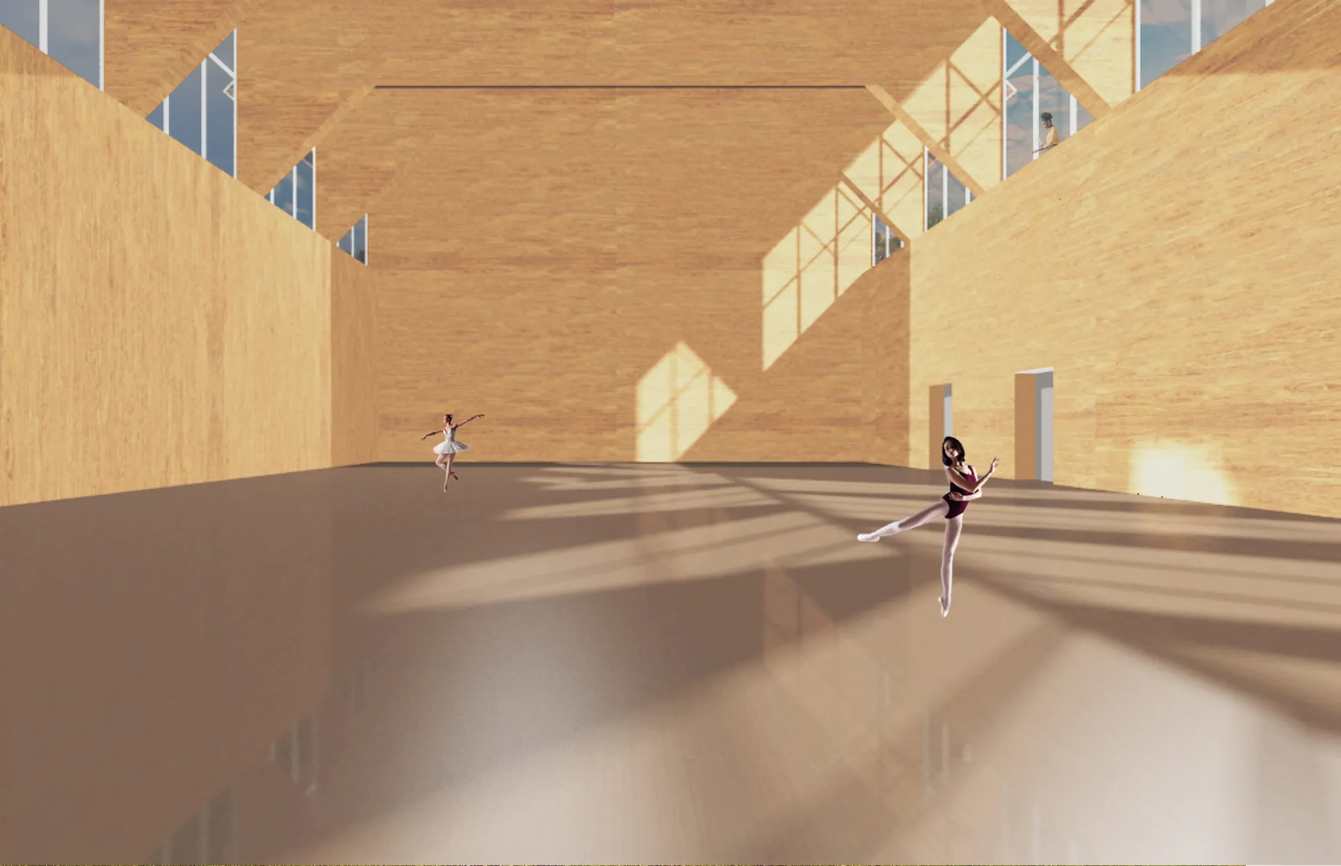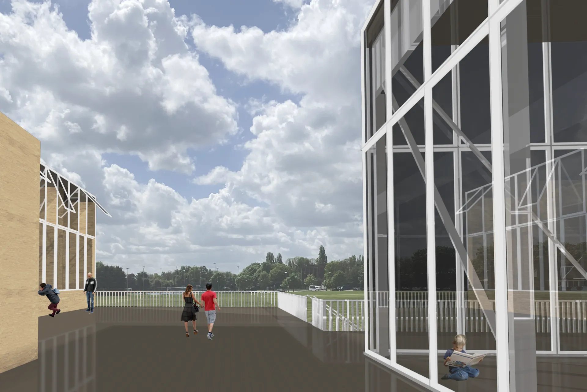 My project is located in Catford in Lewisham on a corner site between a busy market street and the sports field of a private school. Drawing my inspiration from the Shibaura office building by Kazuyo Sejima my project is composed of two similar volumes: one solid and one transparent. I also drew inspiration from the site’s division of solid and transparency in the desity of buildings. The volumes are both 20m x 30m and 20m high. The transparent volume is made of glass and steel and the solid volume of timber. They are connected by a metal balcony structure that provides circulation and a view over the sports field.