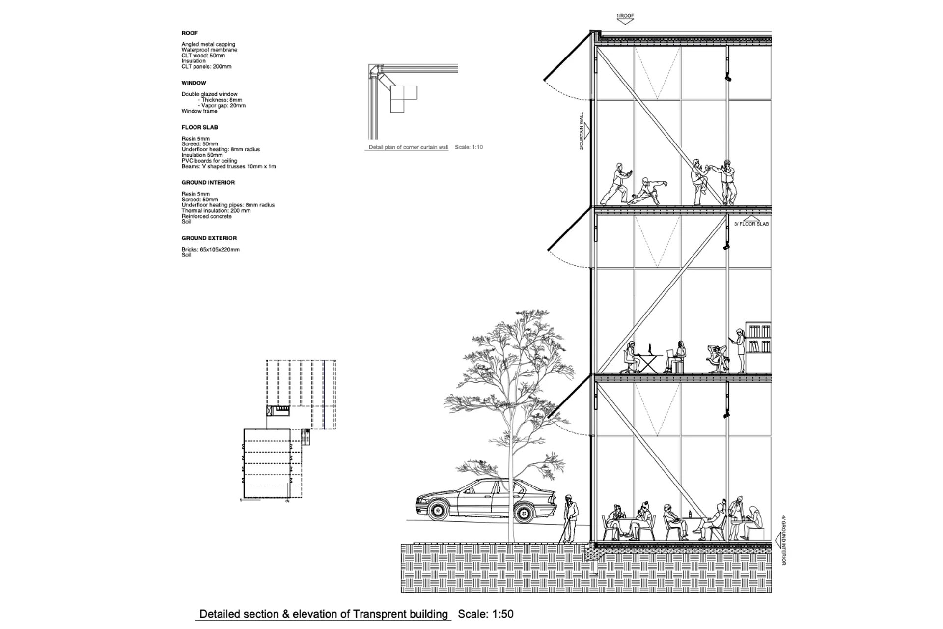 The solid building contains a 12 metre high room supported by four columns and 2-metre-deep beams and is intended for theatre, performance, dance and indoor sports. As well as being solid, the volume is inward looking. For this reason, the only source of light comes from high up via large windows between the ends of the deep beams. The undercroft below this room offers a covered outdoor space for markets or just a space to gather. The transparent building has three identical floors and could easily accommodate offices, a gym, classrooms, workshops, a library or many other programmes.