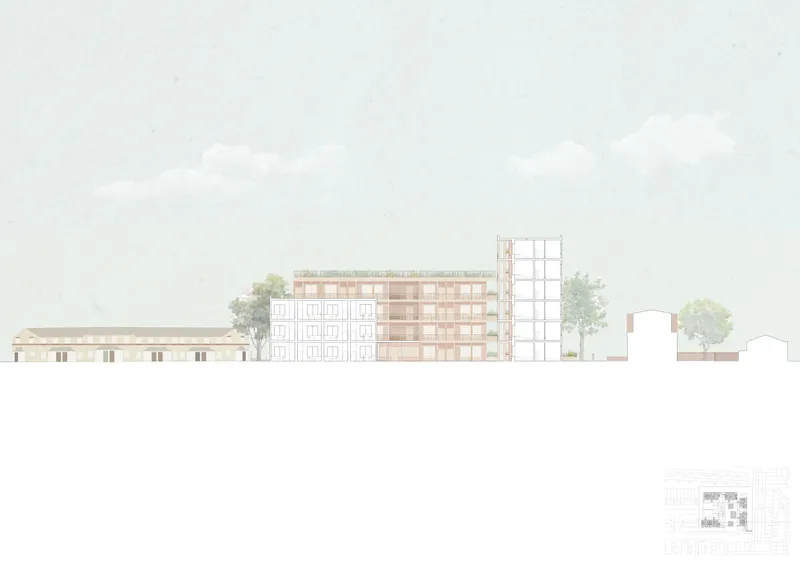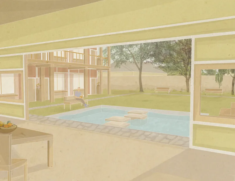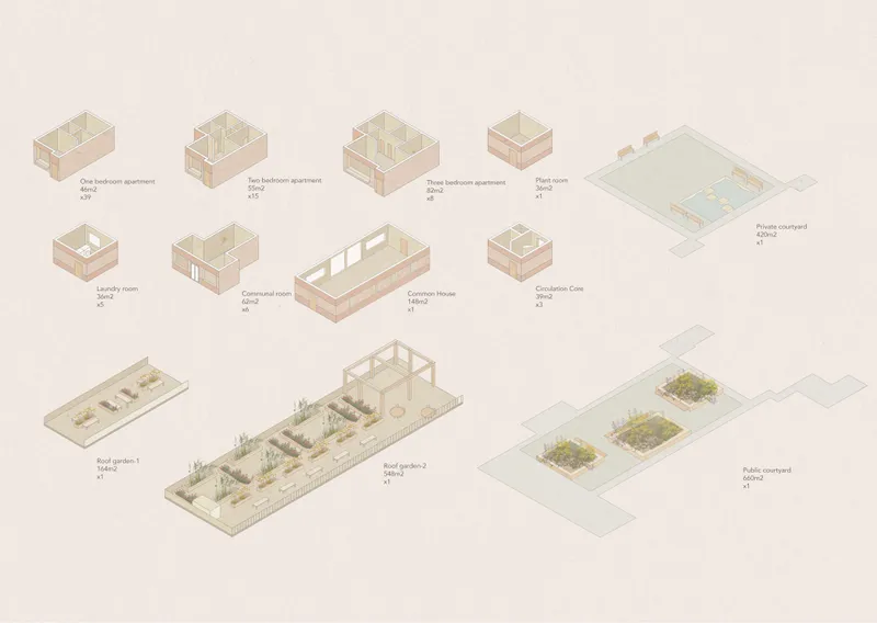 This project aimed to re-establish collective living as a social, environmental, and economic tool by optimizing the individual private housing space and increasing the area of the collective space to include functions that are smaller in the individual apartments. In the collective space, labour is shared by the collective to reduce the amount of work required from the individual and would lower the energy consumption by allowing them to use spaces and services collectively, that alongside using good insulation, low carbon materials, and the maintenance of the existing green spaces would help achieve environmental sustainability and add to the economical and social sustainability that co-housing offers.