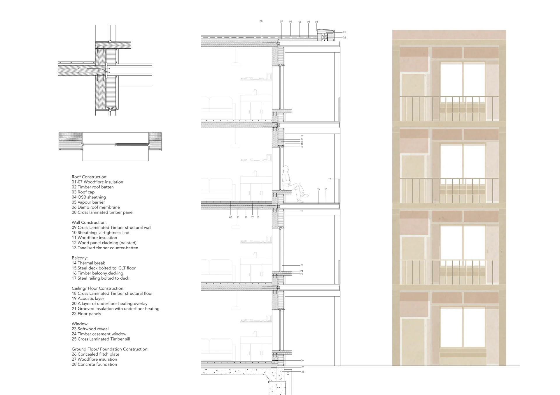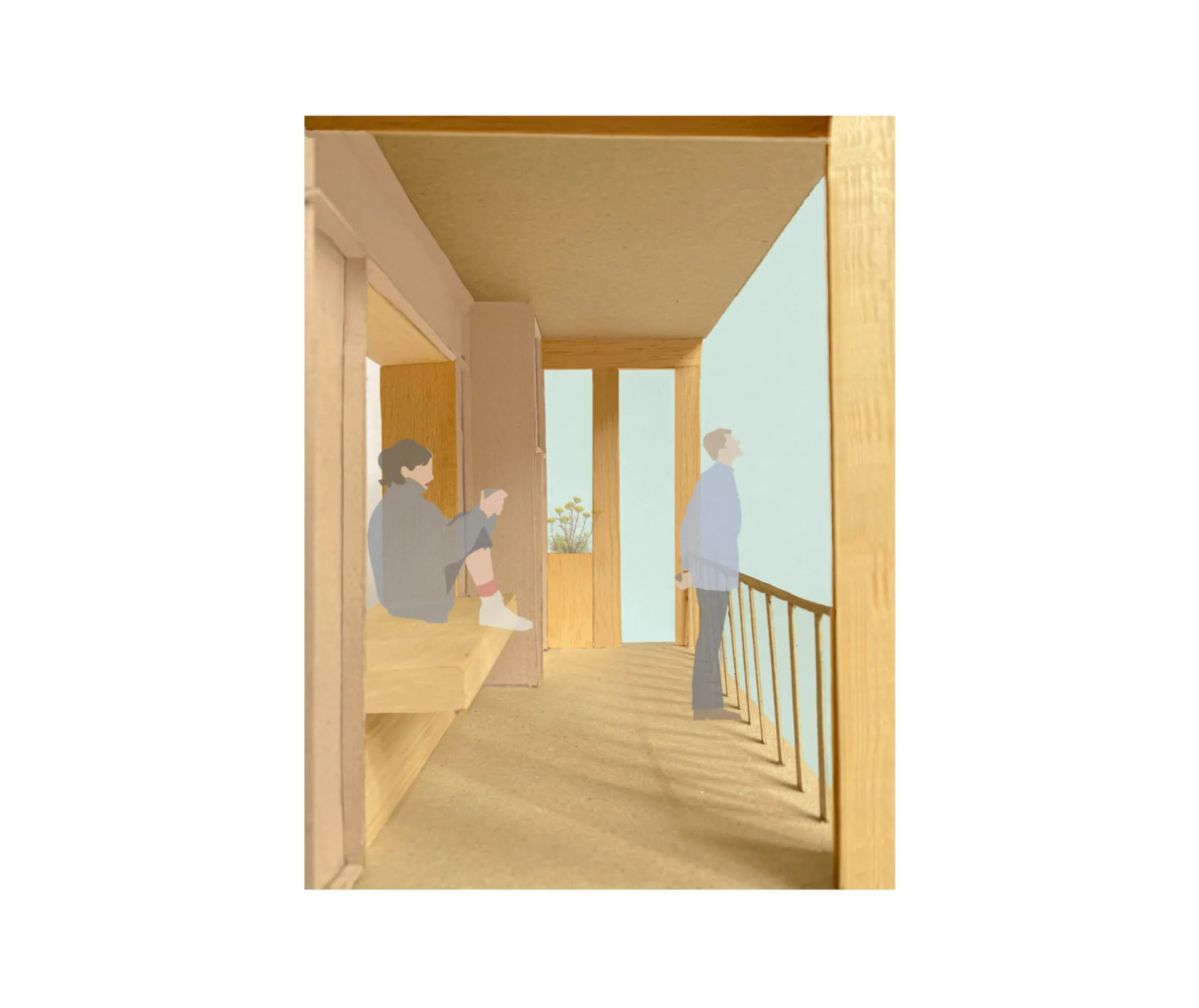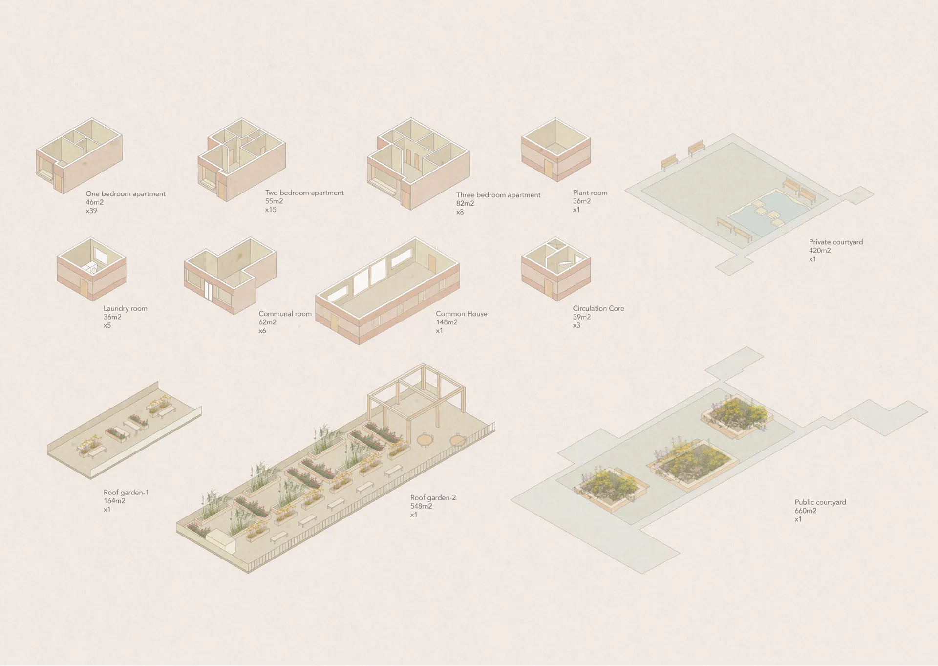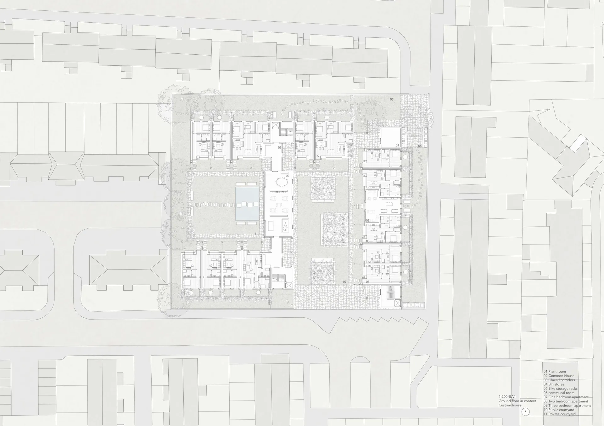 The proposal consists of three building blocks that include 63 apartments. The arrangement of buildings on site creates a courtyard that all apartments and the communal deck share a view of. This courtyard is divided by the common house into a public courtyard for the community in Custom house and a private courtyard for residents. Living spaces and kitchens in all apartments face the communal deck which is the more sociable side while bedrooms are pushed to the back of the plan to face the more quiet and private rear gardens. Throughout the project, planters are used not only as scenic backdrops but to also create seating areas, form small backyards for apartments on the ground floor, and help separate apartment entrances.