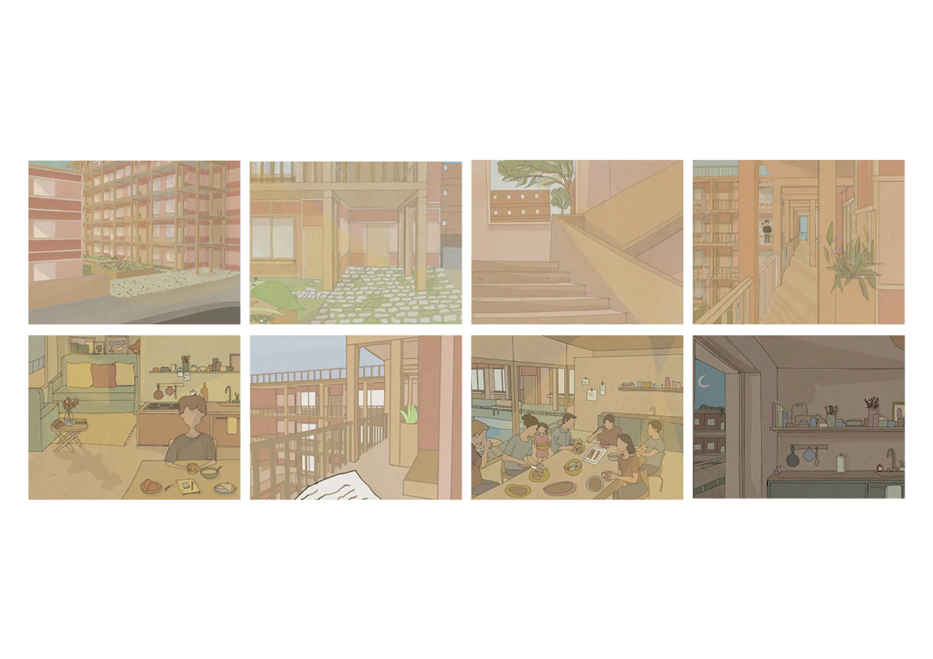 This project aimed to re-establish collective living as a social, environmental, and economic tool by optimizing the individual private housing space and increasing the area of the collective space to include functions that are smaller in the individual apartments. In the collective space, labour is shared by the collective to reduce the amount of work required from the individual and would lower the energy consumption by allowing them to use spaces and services collectively, that alongside using good insulation, low carbon materials, and the maintenance of the existing green spaces would help achieve environmental sustainability and add to the economical and social sustainability that co-housing offers.