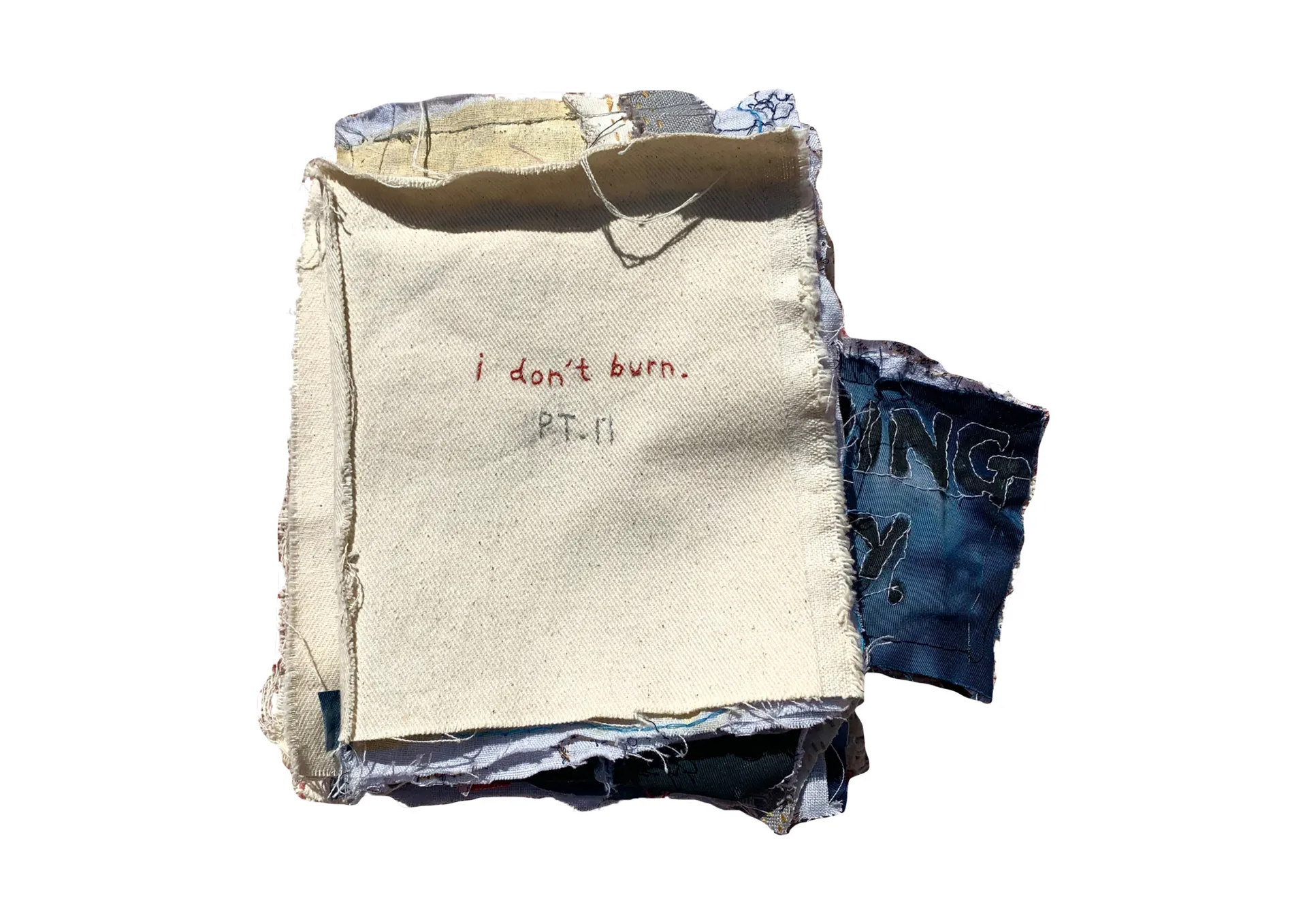 My practice acts as a representation of mind and thought, specific to the expression of aspects of my own identity. This third-year project, ‘I Don’t Burn’ explores how race intersects with appearance and this collective impact on one’s sense of self. The aim of which was to scrutinise my feelings around my racial identity through my processes of making. Writing has become a primary form of inspiration within my practice and has fed into my physical pieces in terms of providing deeper meanings and origins to each work. Acting as the backbone of the work, the poem (of the same title) was written as a manifestation of feeling at odds with my race growing up and the perpetuation of this into my adult life. In two significant parts, the first (film-based), navigates the ideas expressed in the poem through the vessel of a wearable piece (dress) and its interaction with childhood footage and imagery. The second aspect is a development of the first. The interdisciplinary nature of the practice has allowed for the physicality of the work to continue to change, in this case with the narratives of the writing being transferred to a material book made from the dress. The artist book that follows, acts as a collective archive that acknowledges the narratives that existed in the poem that were then translated into a wearable object. Interaction between mediums fuel the themes of ambiguity, confusion, and self-assessment that I aim to curate within the scope of my work.