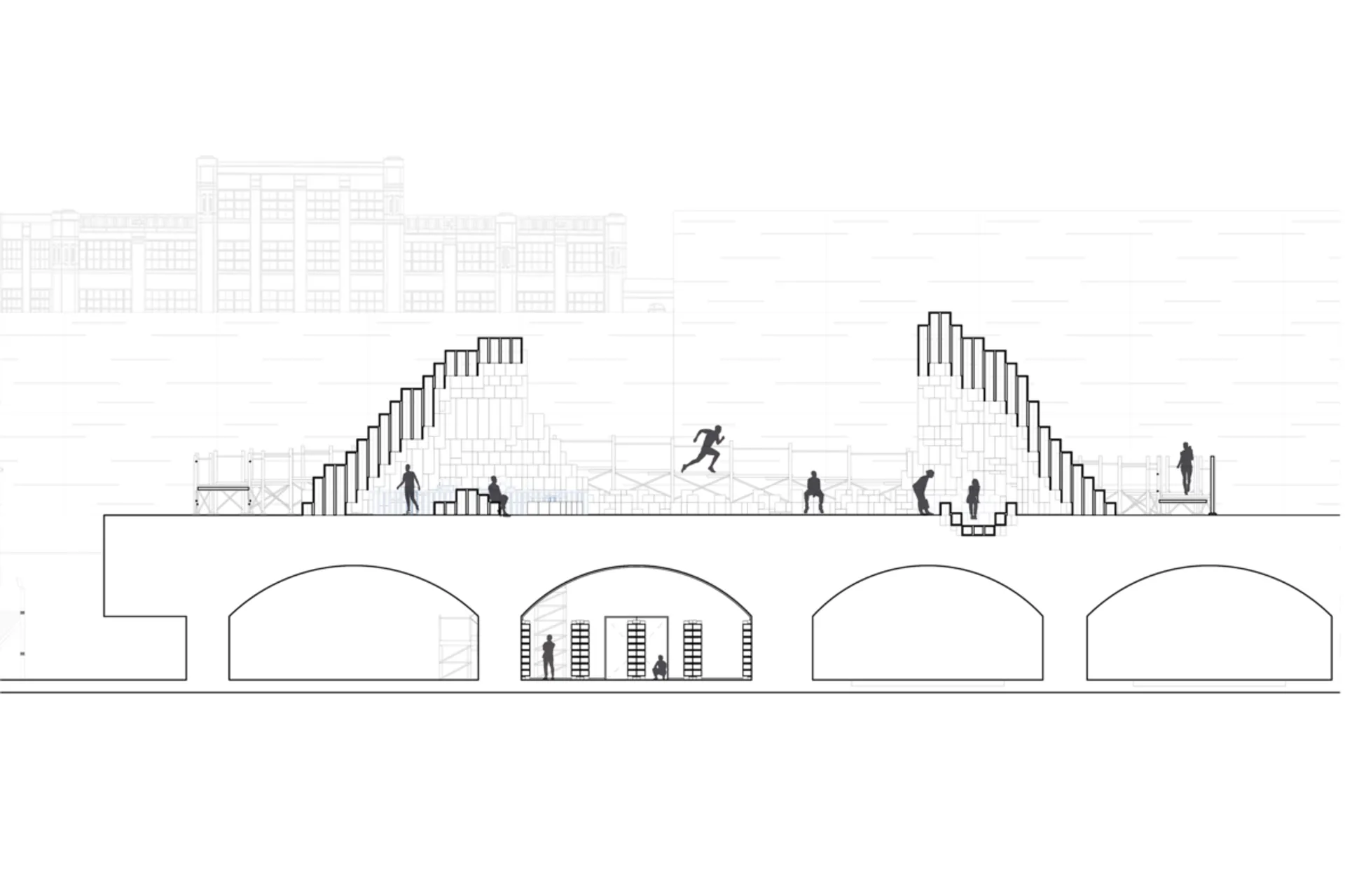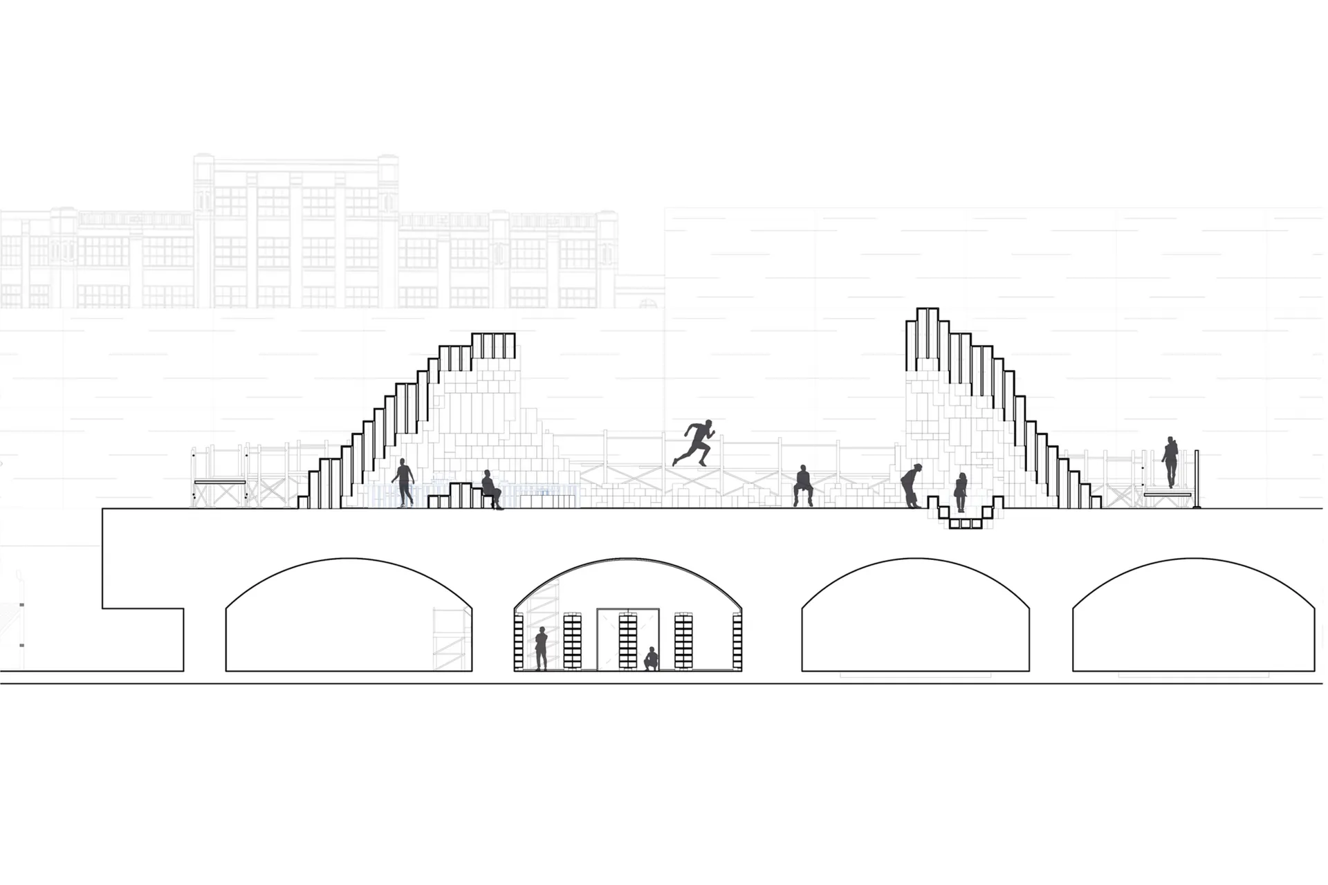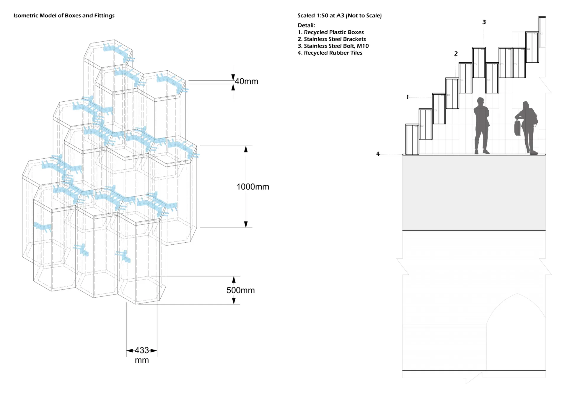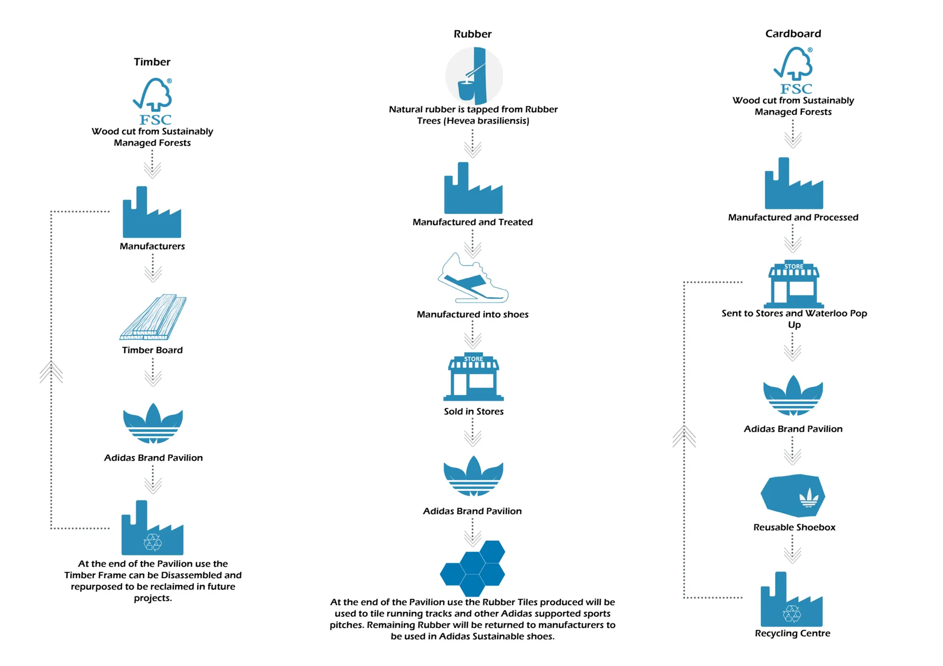 I began by developing a more circular approach to Adidas’ shoeboxes with the introduction of the ‘Bring Back Scheme’. A fold up handle enables the customer to carry the box rather than use a bag. Users are encouraged to return to the store with their box when buying their next set of shoes, reducing waste, and building an emotional connection with the brand and shoe storage. I took forward the idea of this scheme and shoebox with my Pop-Up design in Waterloo Station. Once the Pop-Up event is finished the materials then have a second life; with the shelving being reused in the next location or within Adidas’ London stores and the structure being relocated to the Shoreditch Power League site.