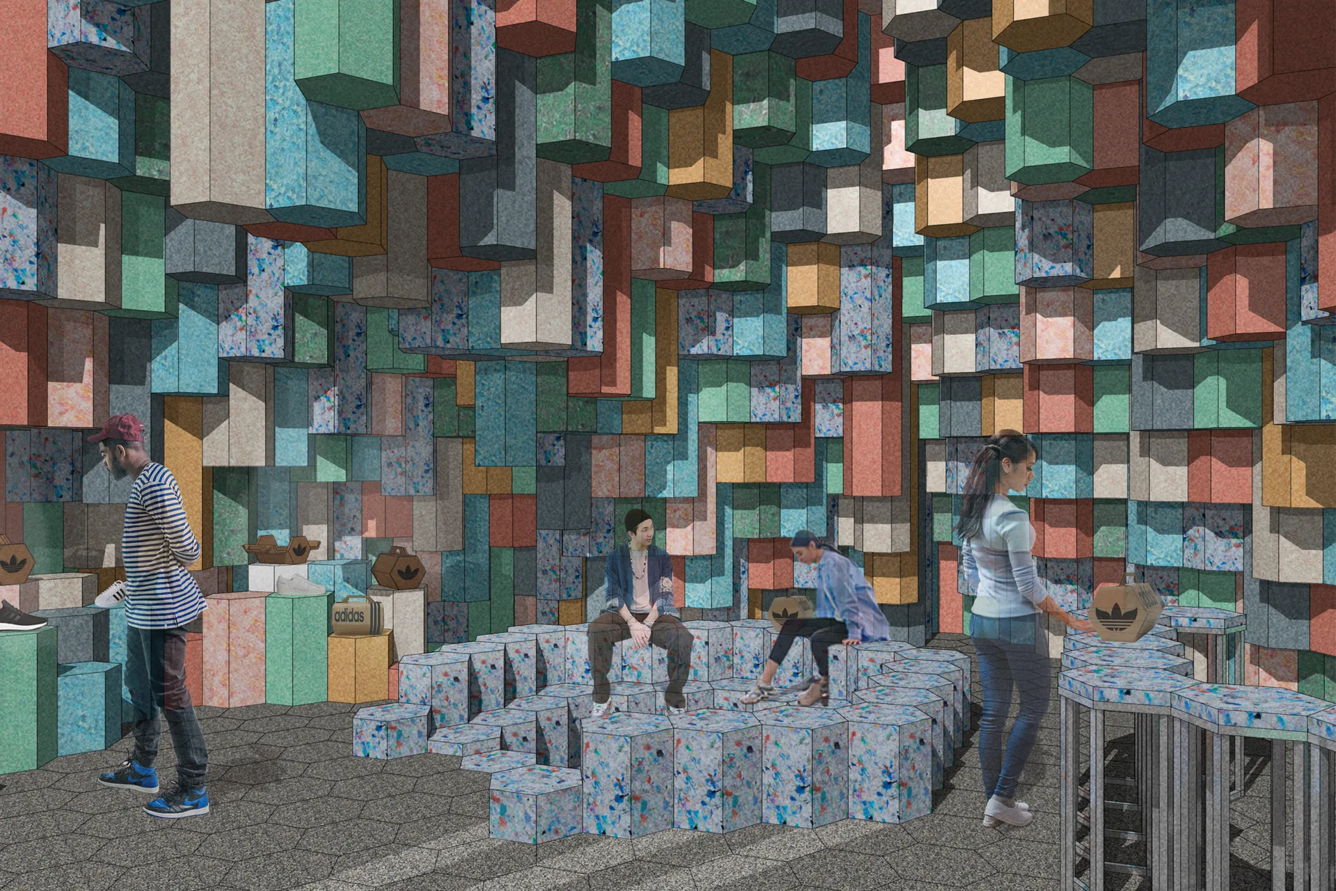 The Final Proposal brings all this together in the Adidas Pavilion at Bishopsgate Goodsyard, Shoreditch. It develops on all previous work and promotes the idea that waste can be beautiful, with a workshop and sales space created out of hexagonal boxes formed from recycled plastics from the community. The hexagonal shapes relate back to the Shoebox (that is sold in the sales area), and the workshop space provides a space for the community to see how the plastic and rubber they collect is reused. In keeping with the brand, a temporary running track surrounds the space to test the trainers and a rubber tiled floor will also be made of recycled shoe rubber. The Pavilion encourages circularity within retail through demonstration and experience.